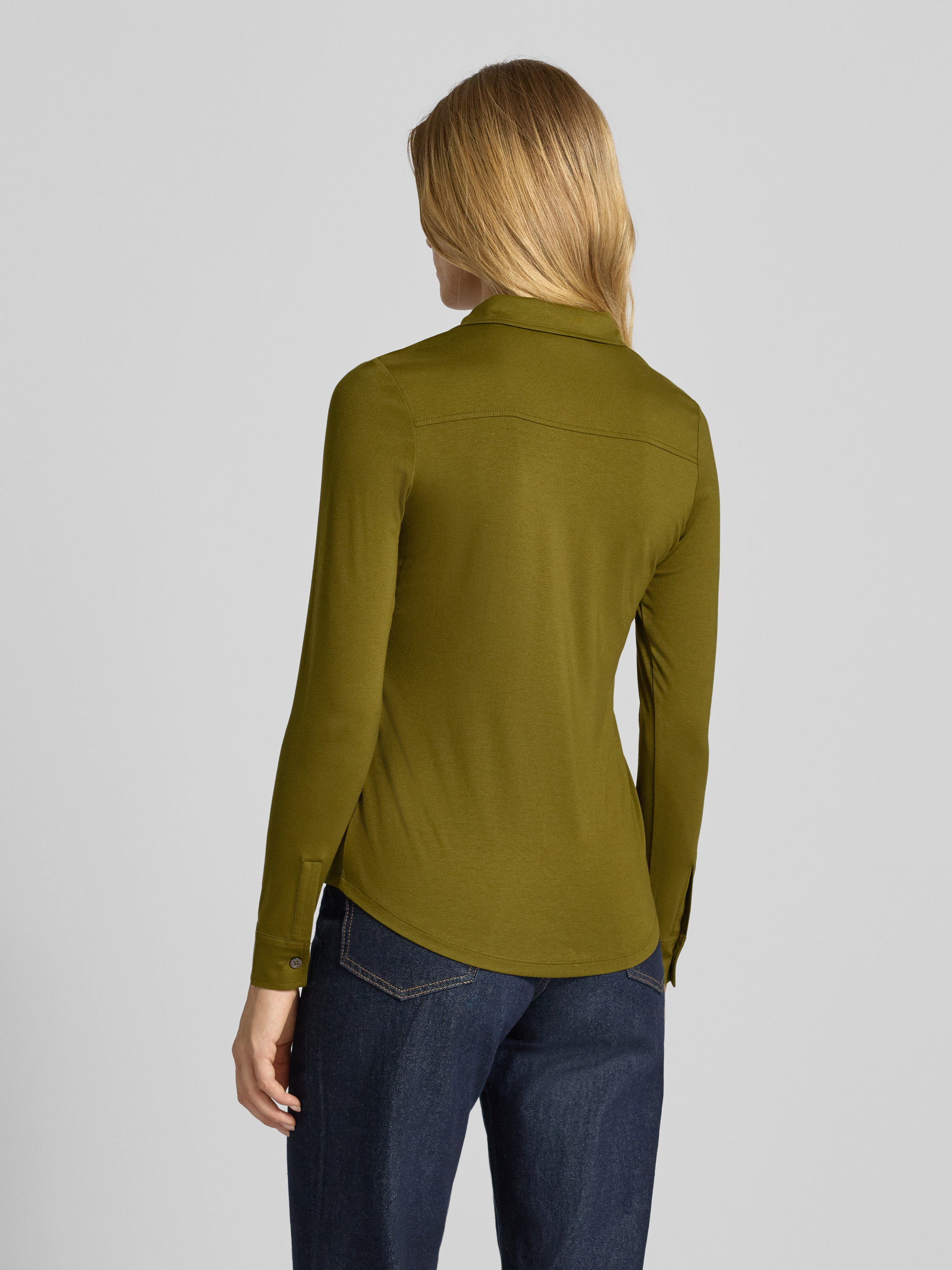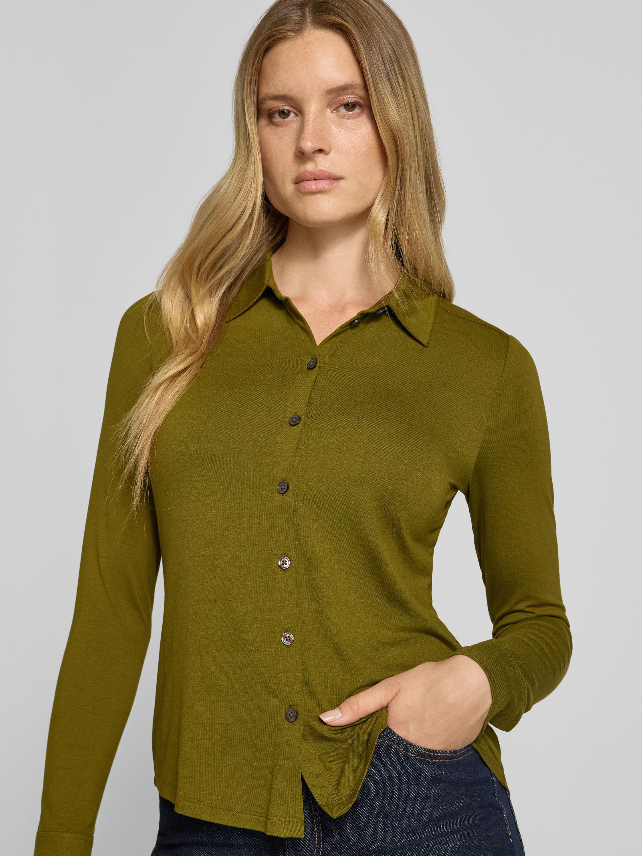 Die Damen Langarmbluse von Marc O'Polo präsentiert sich in klarer, unifarbener Optik und bringt durch den Regular Fit eine angenehme Bewegungsfreiheit mit. Der Hemdblusenkragen sorgt für eine klassische Note, während der Viskose-Mix im Jersey-Stil ein geschmeidiges Tragegefühl schafft. So lässt sich dieses Modell vielseitig kombinieren und passt zu zahlreichen Anlässen.
