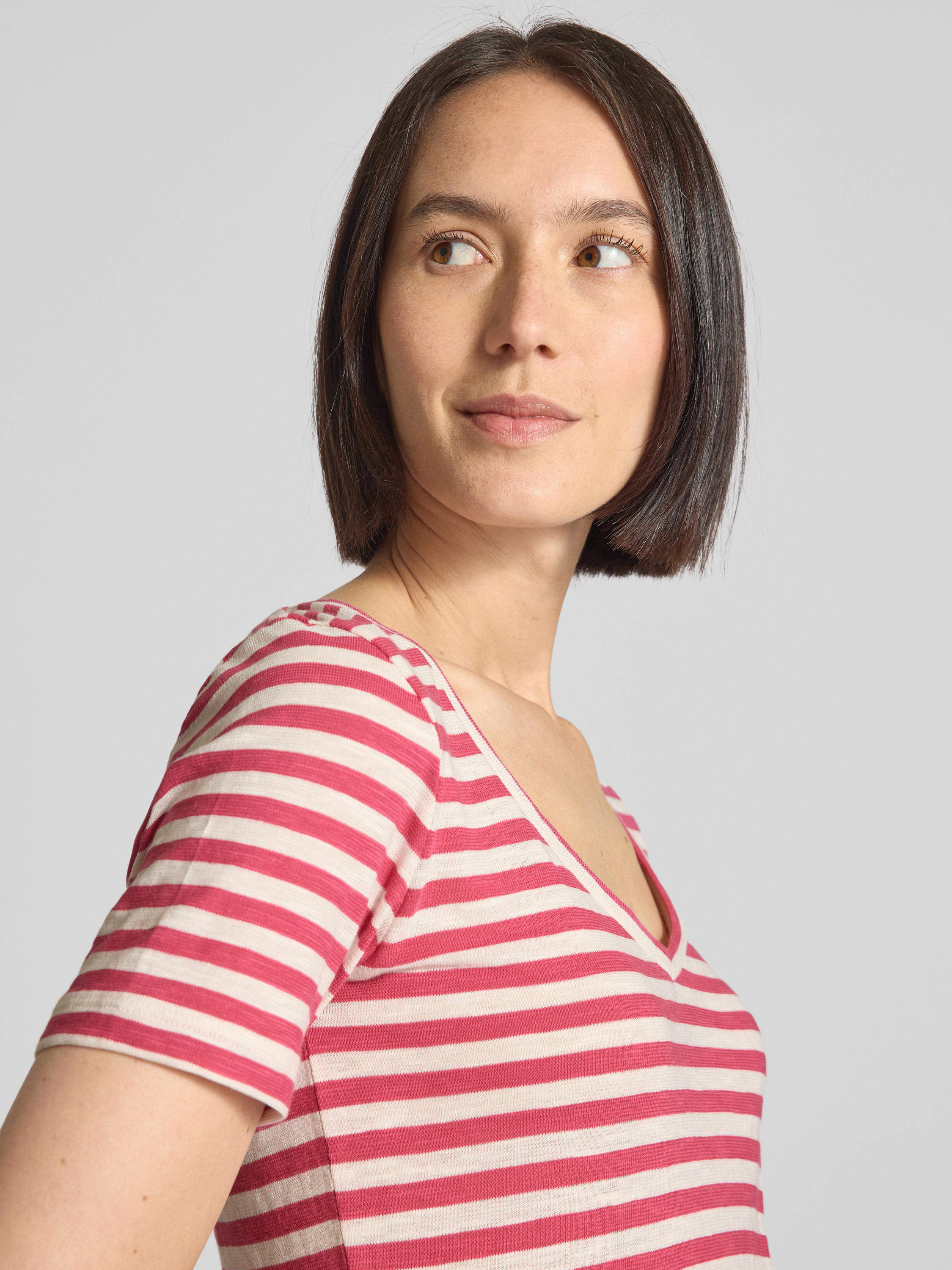 Das Damen Regular Fit T-Shirt von Marc O'Polo zeigt sich mit einem dezenten Allover-Muster, das dem klassischen Schnitt eine frische Note verleiht. Der angenehm weiche Slub Jersey aus reiner Baumwolle sorgt für ein bequemes Tragegefühl im Alltag. Durch den V-Ausschnitt und die abgerundete Saumlinie wirkt das Shirt vielseitig kombinierbar.