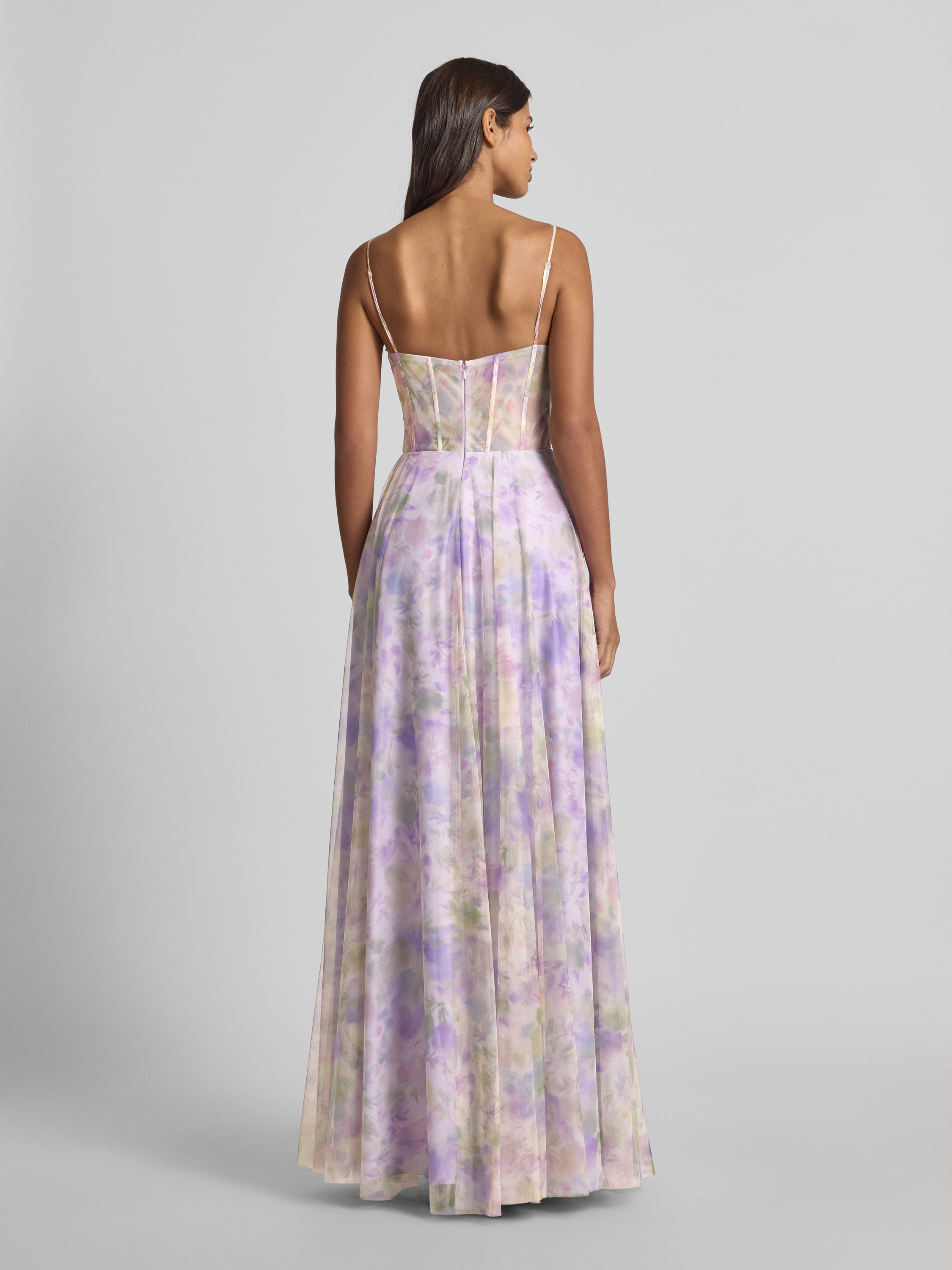 Das Abendkleid von Mascara kombiniert einen eleganten Stufen-Look mit einem femininen Herz-Ausschnitt, der durch zarte Spaghettiträger unterstützt wird. Der fließende Chiffonstoff verleiht eine leichte A-Linien-Silhouette, die sich ideal für formelle Anlässe eignet. Man genießt dabei eine gelungene Balance aus Anmut und Komfort.