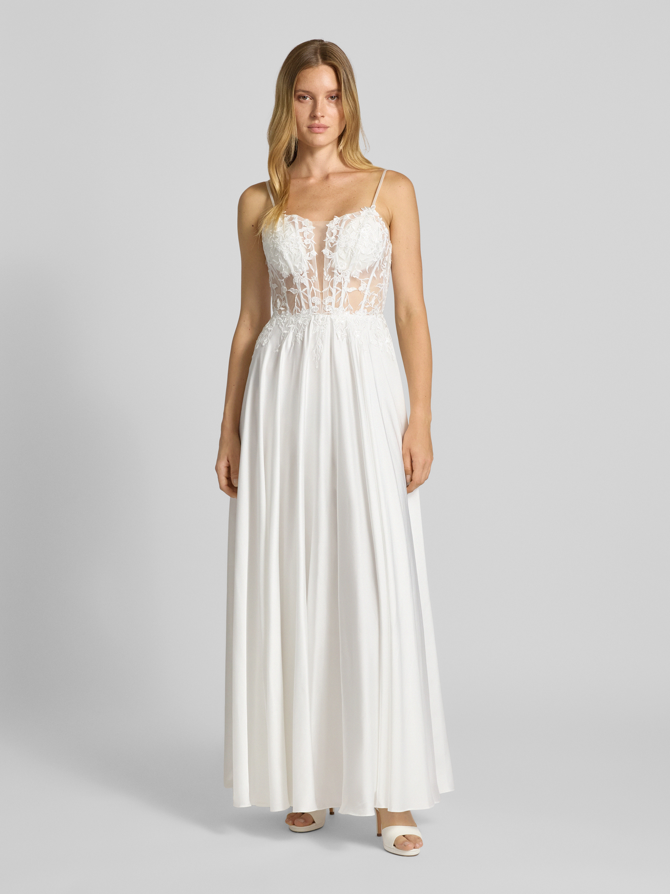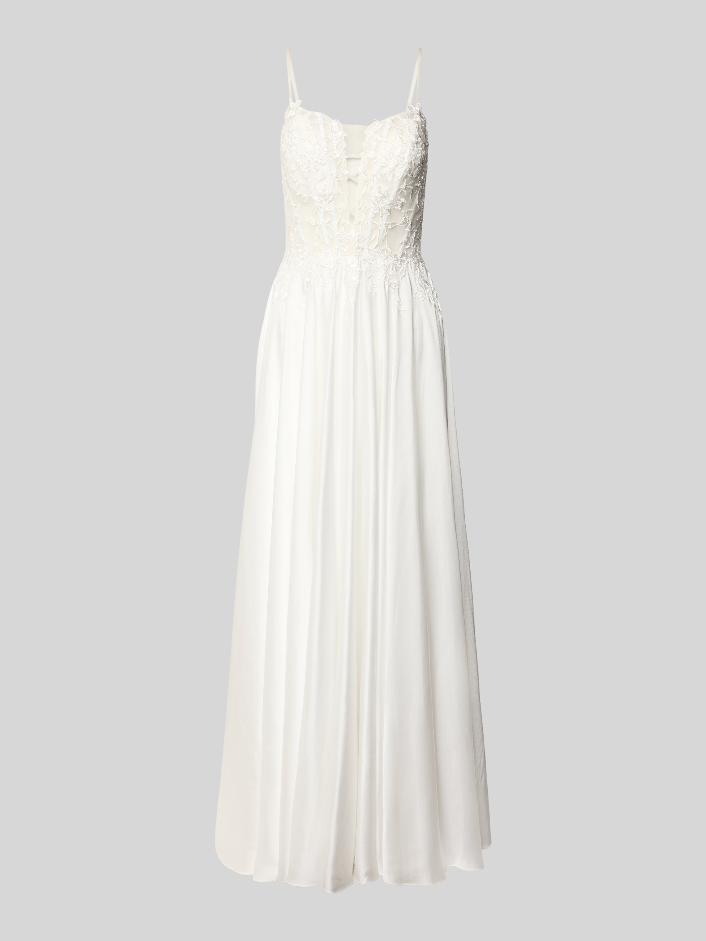 Das Regular Fit Brautkleid von Mascara legt mit seinem semitransparenten Design und den filigranen floralen Stitchings einen feinen Akzent auf feminine Leichtigkeit. Durch die taillierte Passform und die schmalen Spaghetti-Träger entsteht eine harmonische Silhouette, die angenehm sitzt. Besonders an warmen Tagen fühlt man sich damit unbeschwert und stilvoll zugleich.