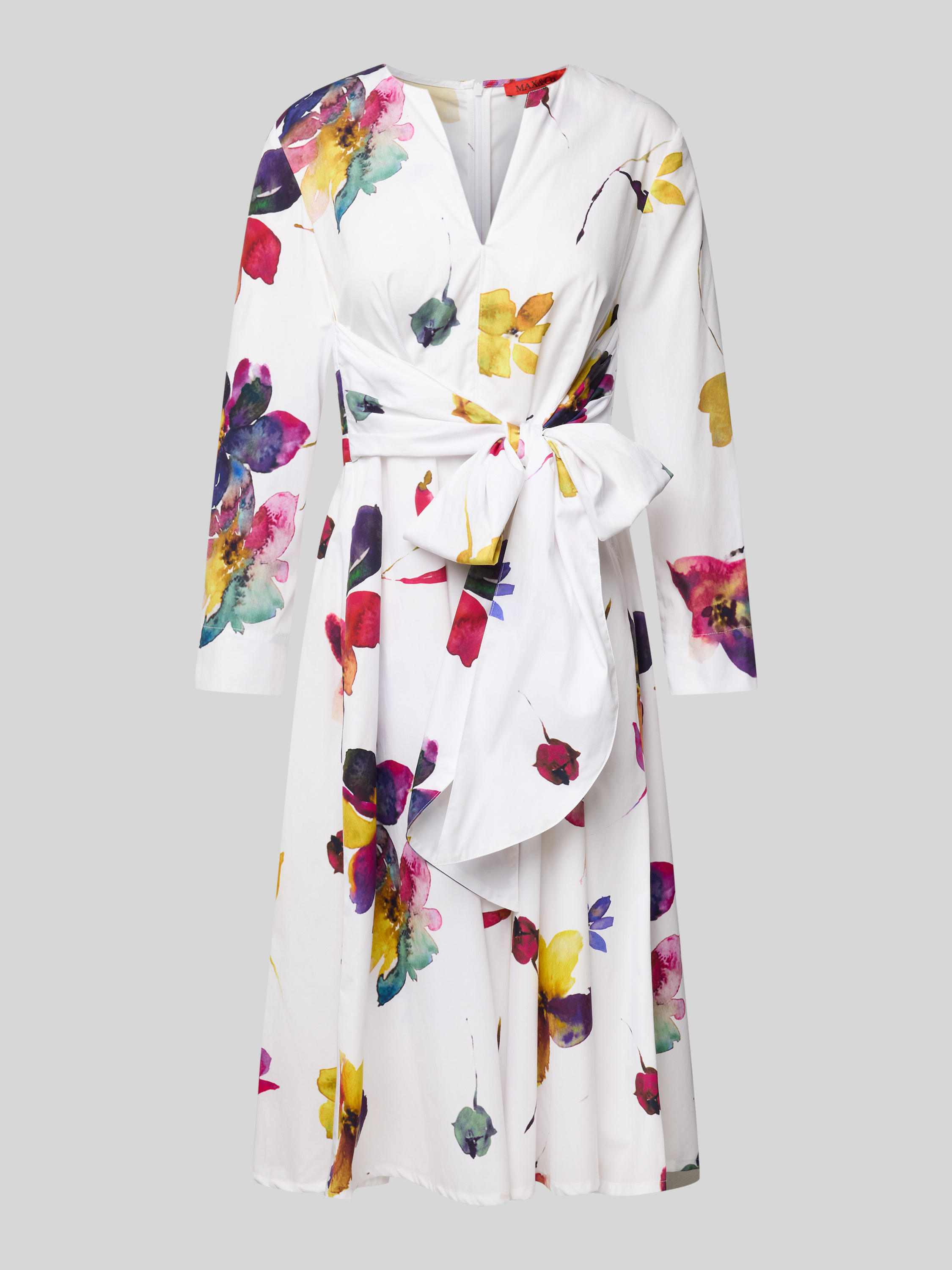 Das Kleid 'DISCO' von MAX&Co. besticht durch seinen taillierten Schnitt aus reiner Baumwolle, der für ein angenehmes Tragegefühl sorgt. Der V-Ausschnitt und die 3/4-Ärmel verleihen ihm eine elegante Note, während die Eingrifftaschen praktischen Nutzen bieten. Gelegte Falten im Stufen-Look runden das Design stilvoll ab.