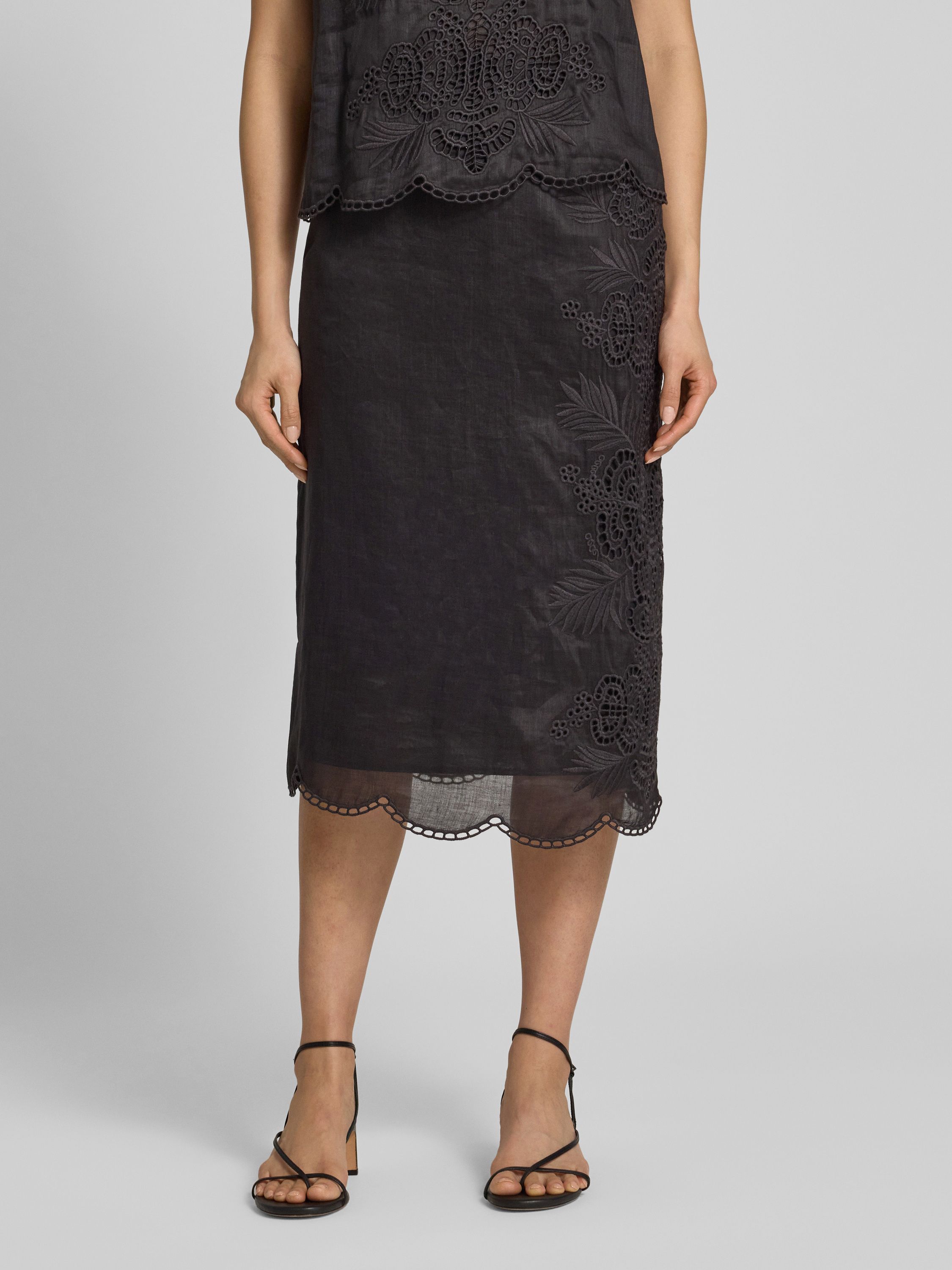 Der Midirock mit Spitzenbesatz von Max Mara Studio, Modell 'FIFY', beeindruckt durch einen geraden Schnitt und ein semitransparentes Design. Ein blickdichter Unterrock sorgt für angenehmen Tragekomfort und das Zusammenspiel von Spitze und Material verleiht jedem Outfit eine elegante Note. Ideal für vielseitige, stilvolle Auftritte.