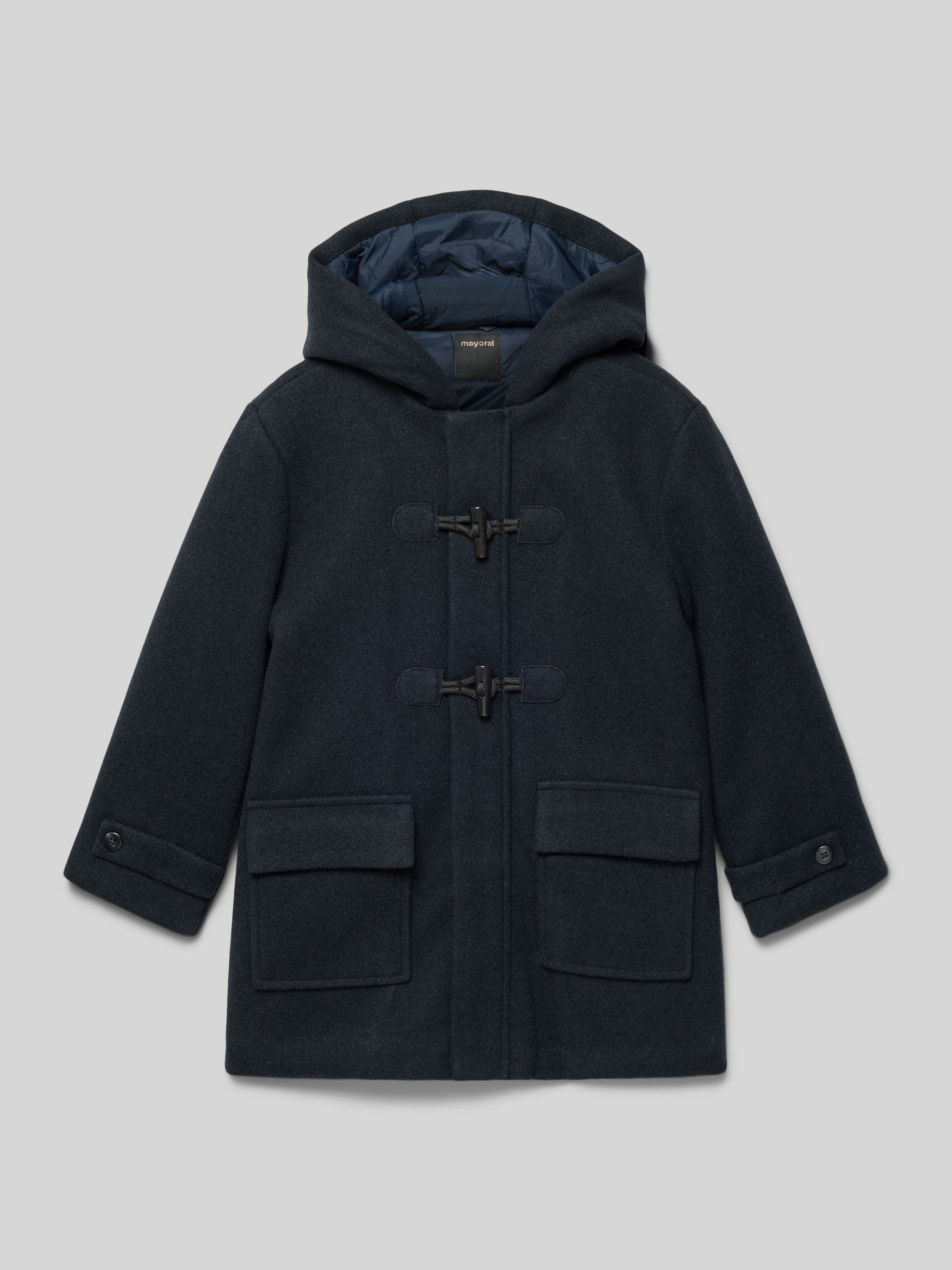 Der Kinder Dufflecoat von Mayoral zeigt sich in einem Material-Mix mit Viskose-Anteil und fällt durch seinen Regular Fit angenehm locker aus. Durch die Kapuze und praktische Pattentaschen erhält man zusätzlichen Schutz und Stauraum im Alltag. Ärmelriegel runden das Design funktional ab und sorgen für flexible Anpassungsmöglichkeiten.
