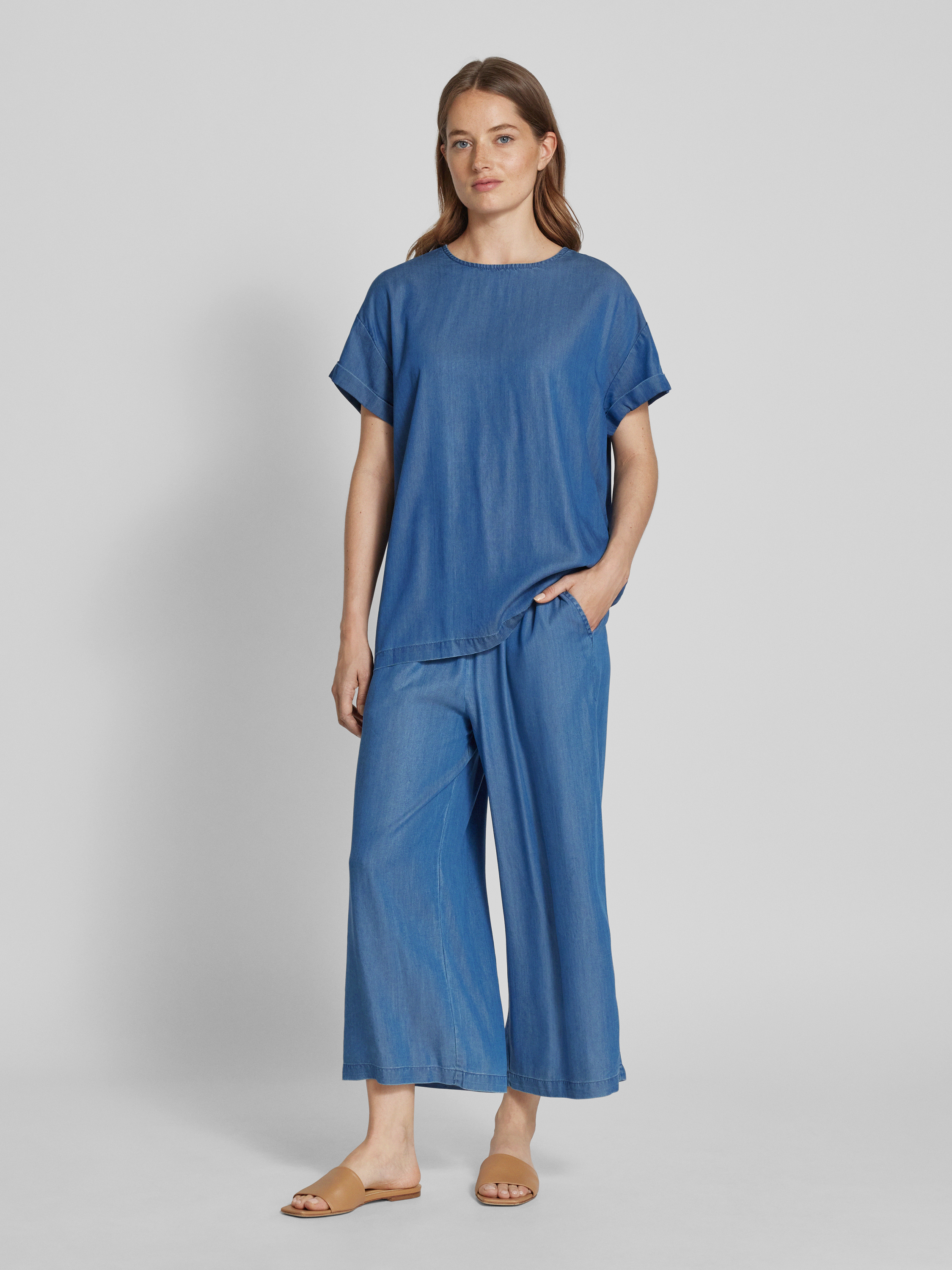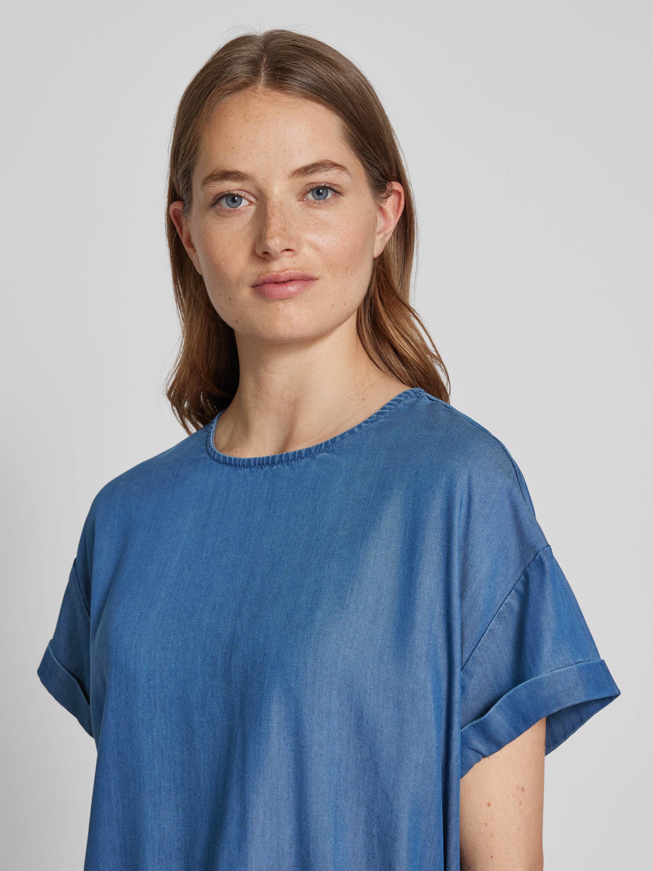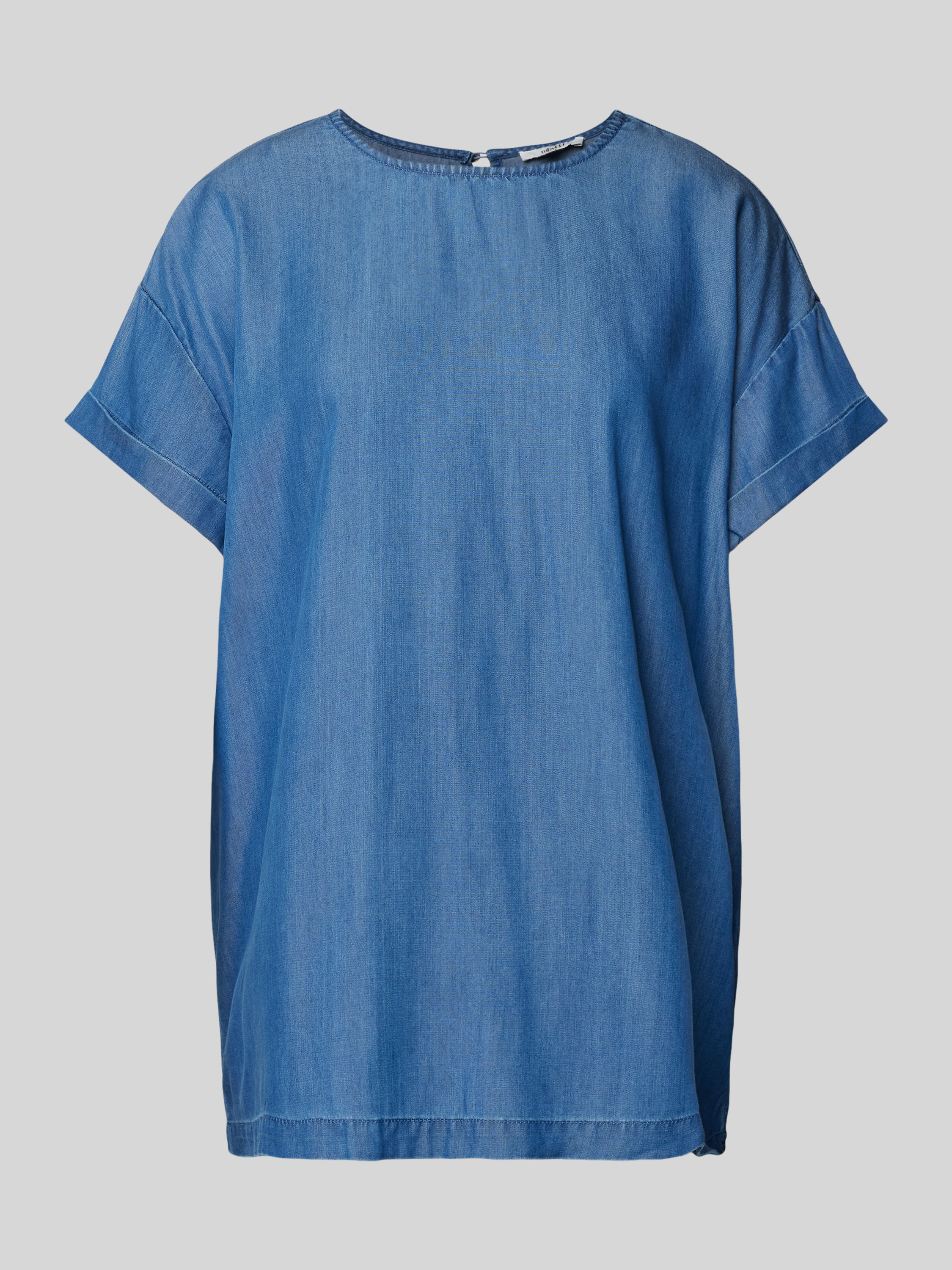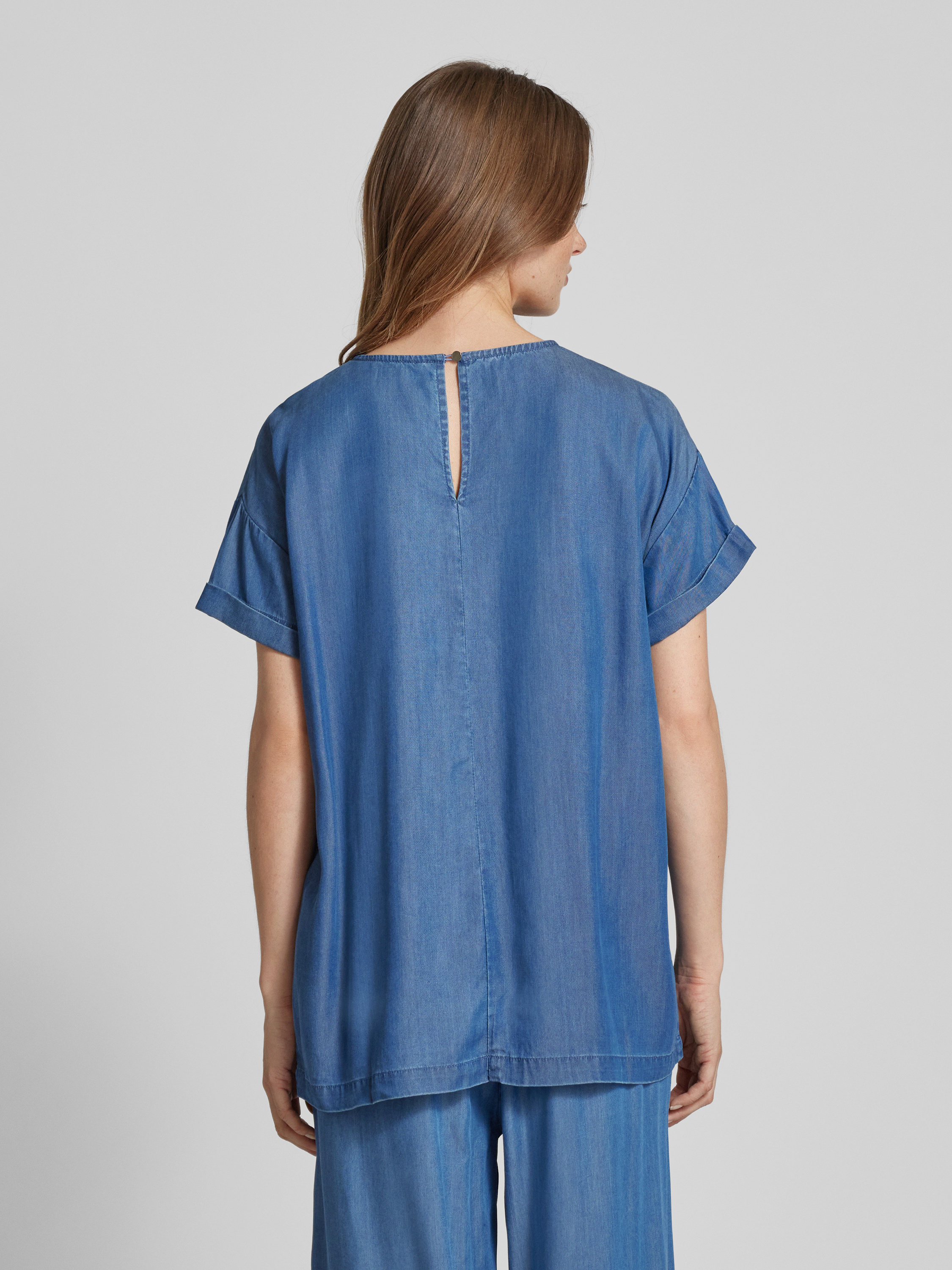 Die Bluse in Denim-Optik Modell 'Amana' von mbyM kombiniert einen geraden Schnitt mit einem angenehmen Lyocell-Viskose-Mix. Durch den Rundhalsausschnitt und die Kappärmel entsteht ein legerer Look, der sich ideal für entspannte Anlässe eignet und vielseitig kombinierbar ist.