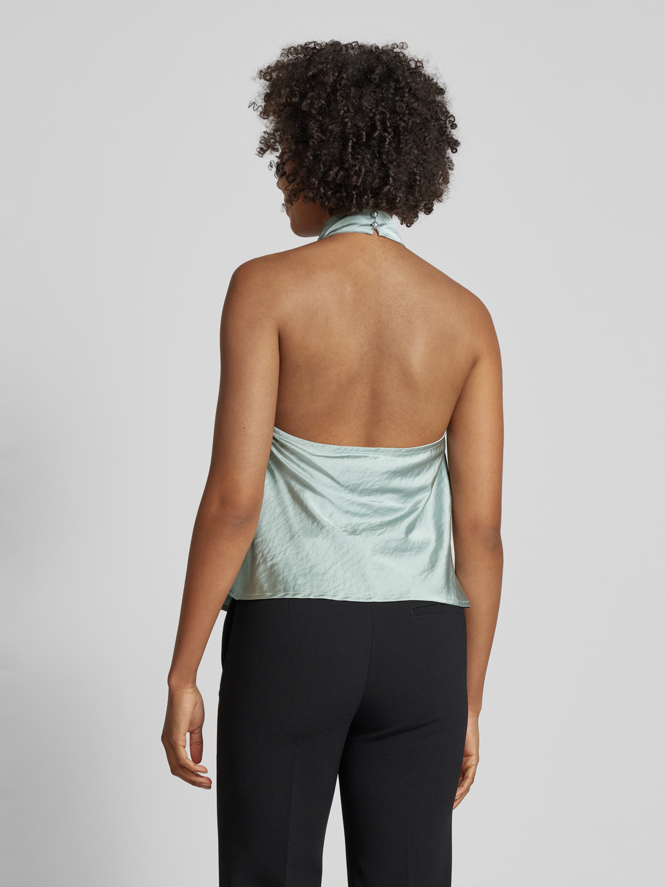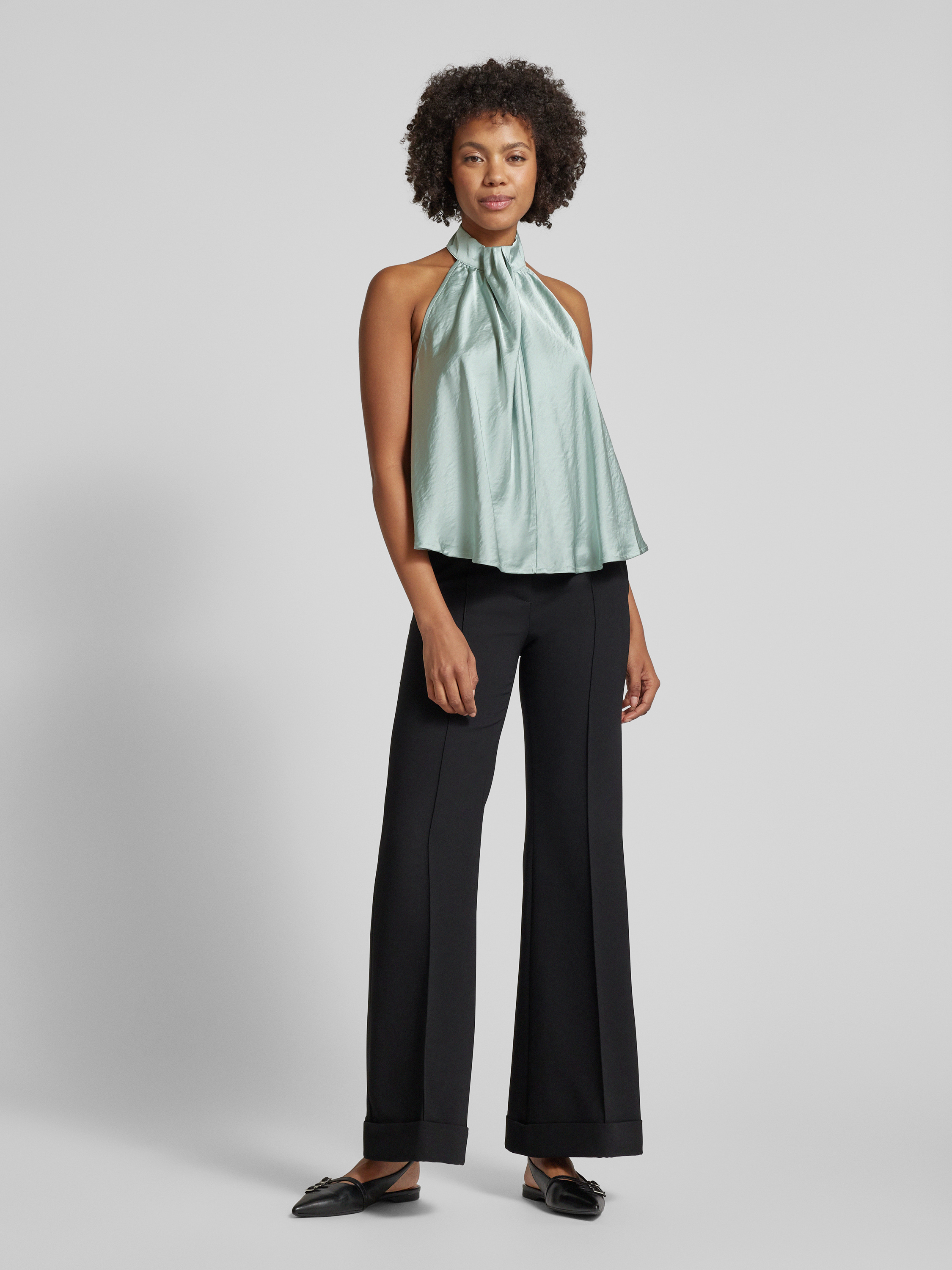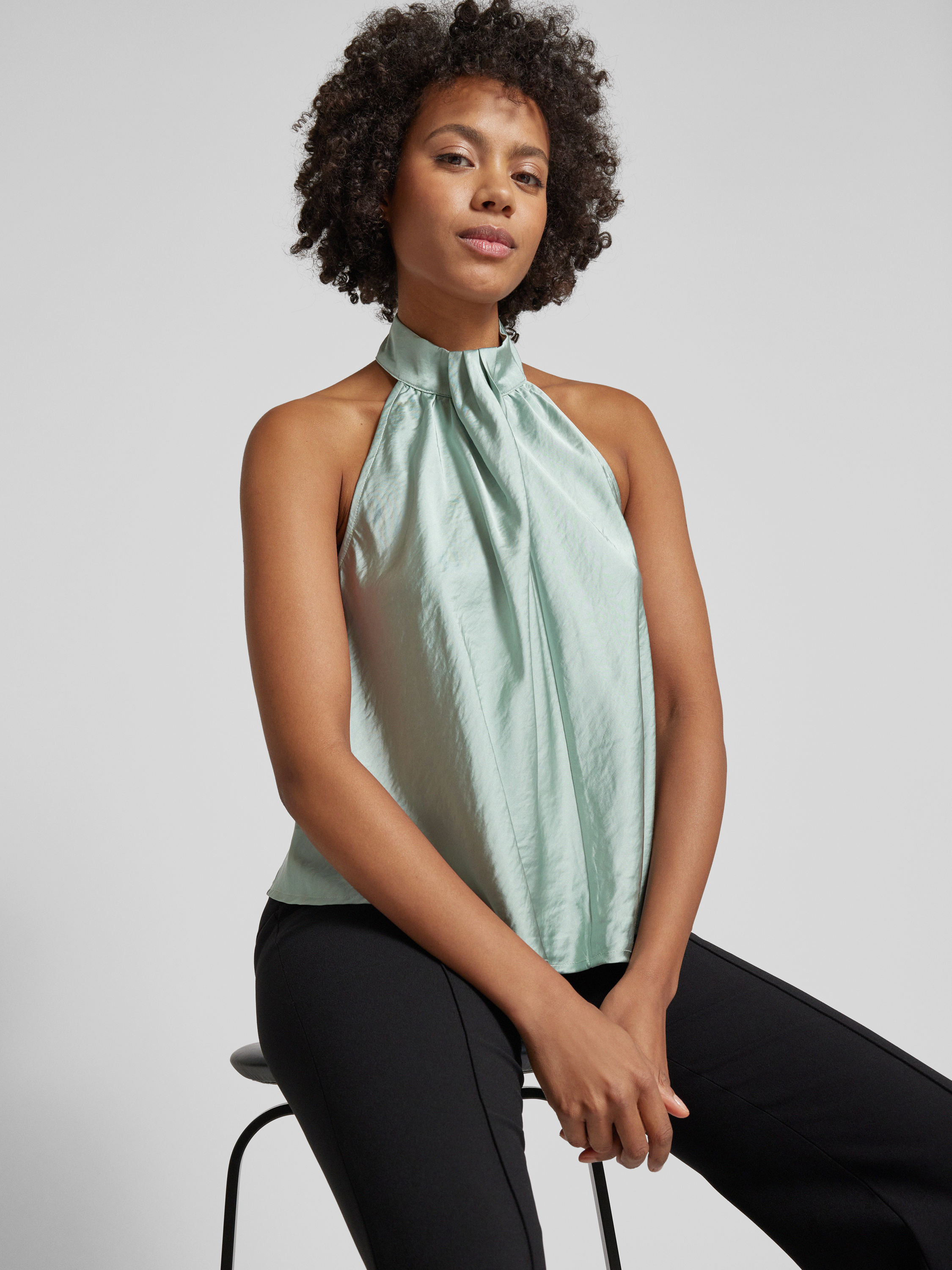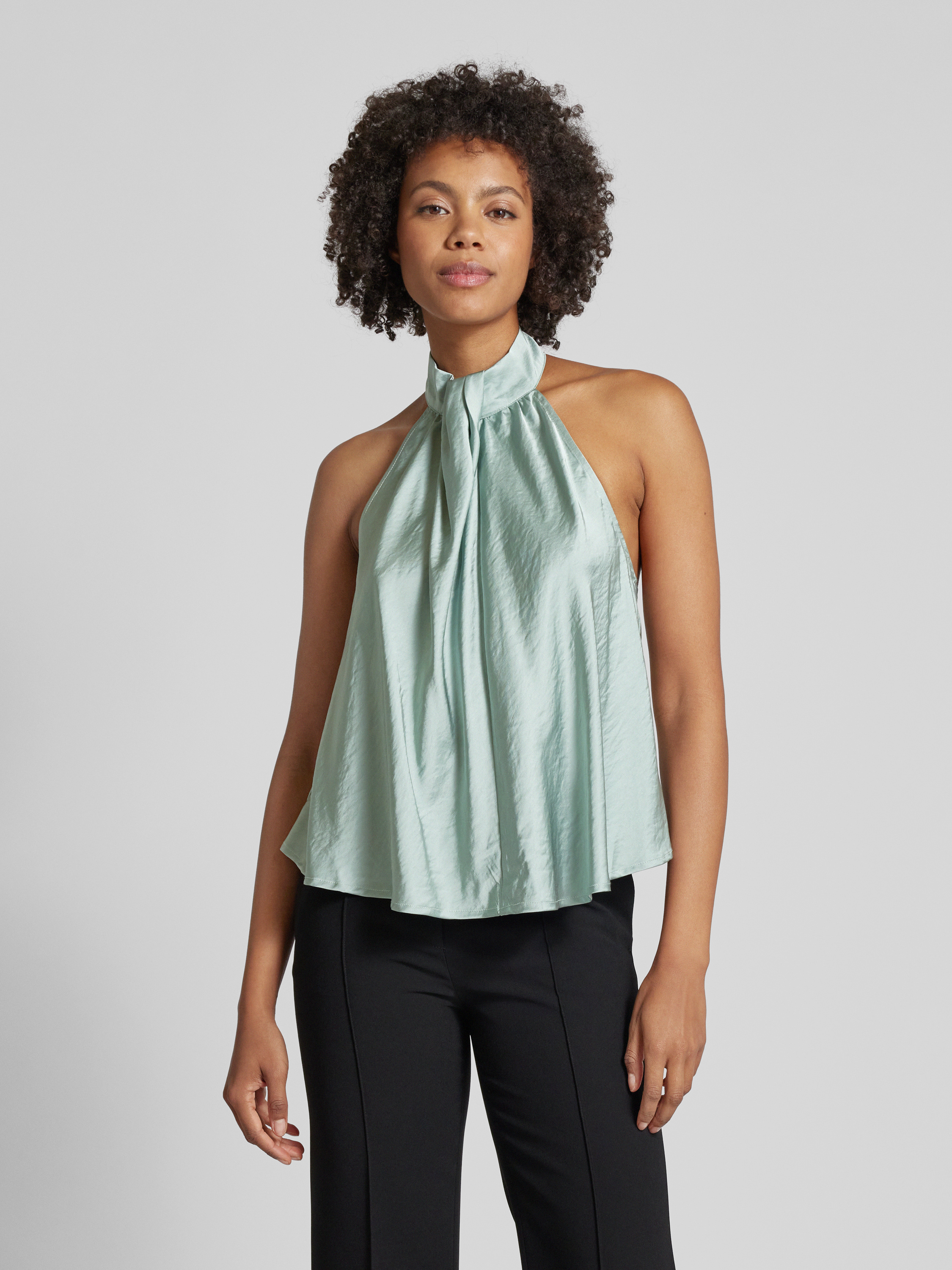 Das Blusentop mit Neckholder Modell 'Zuzela' von mbyM besticht durch seinen lockeren Schnitt und den angenehmen Material-Mix mit Viskose-Anteil. Die geschickt gelegten Falten verleihen dem unifarbenen Design eine elegante Note, die sich ideal für verschiedene Anlässe eignet.