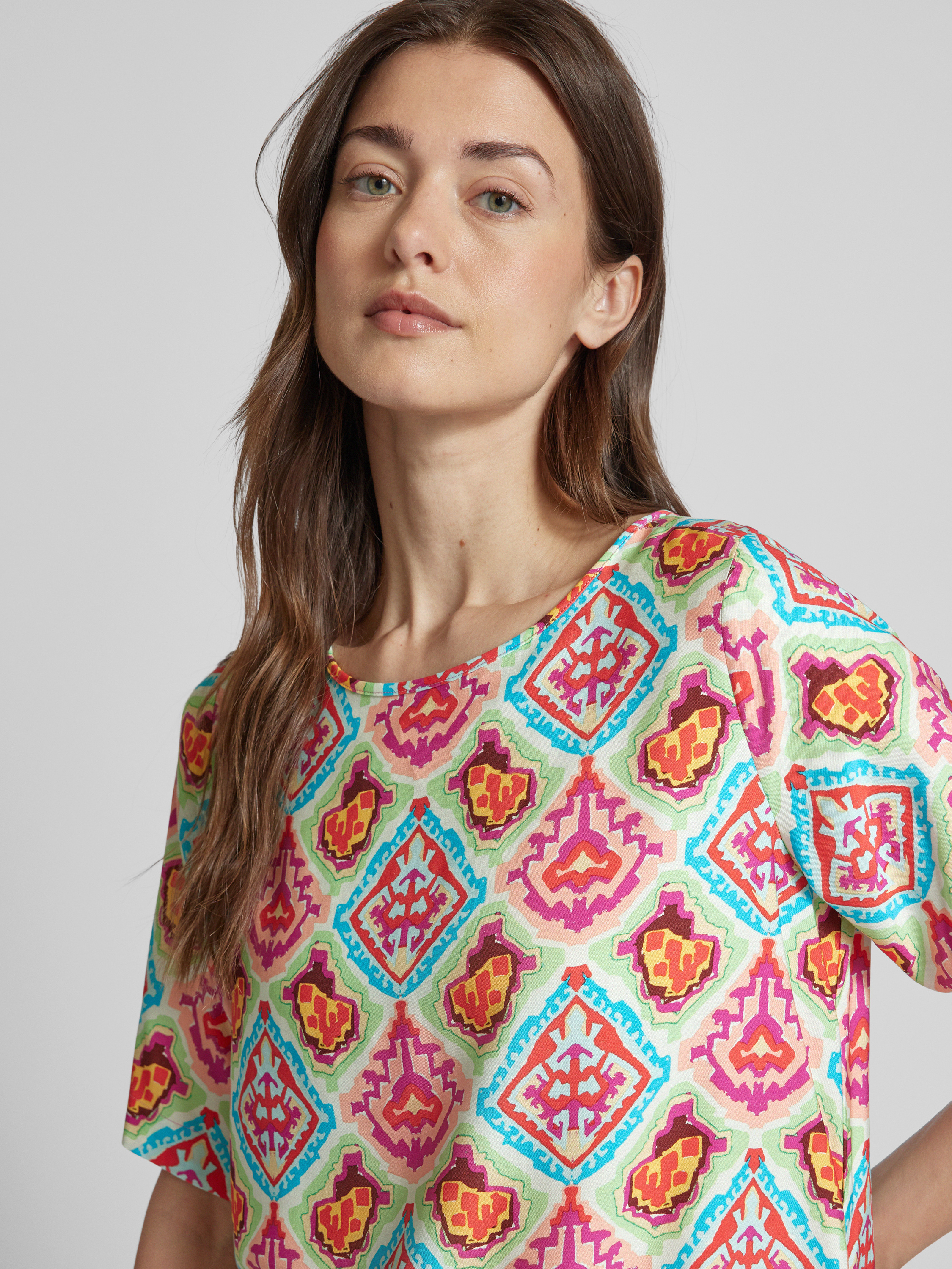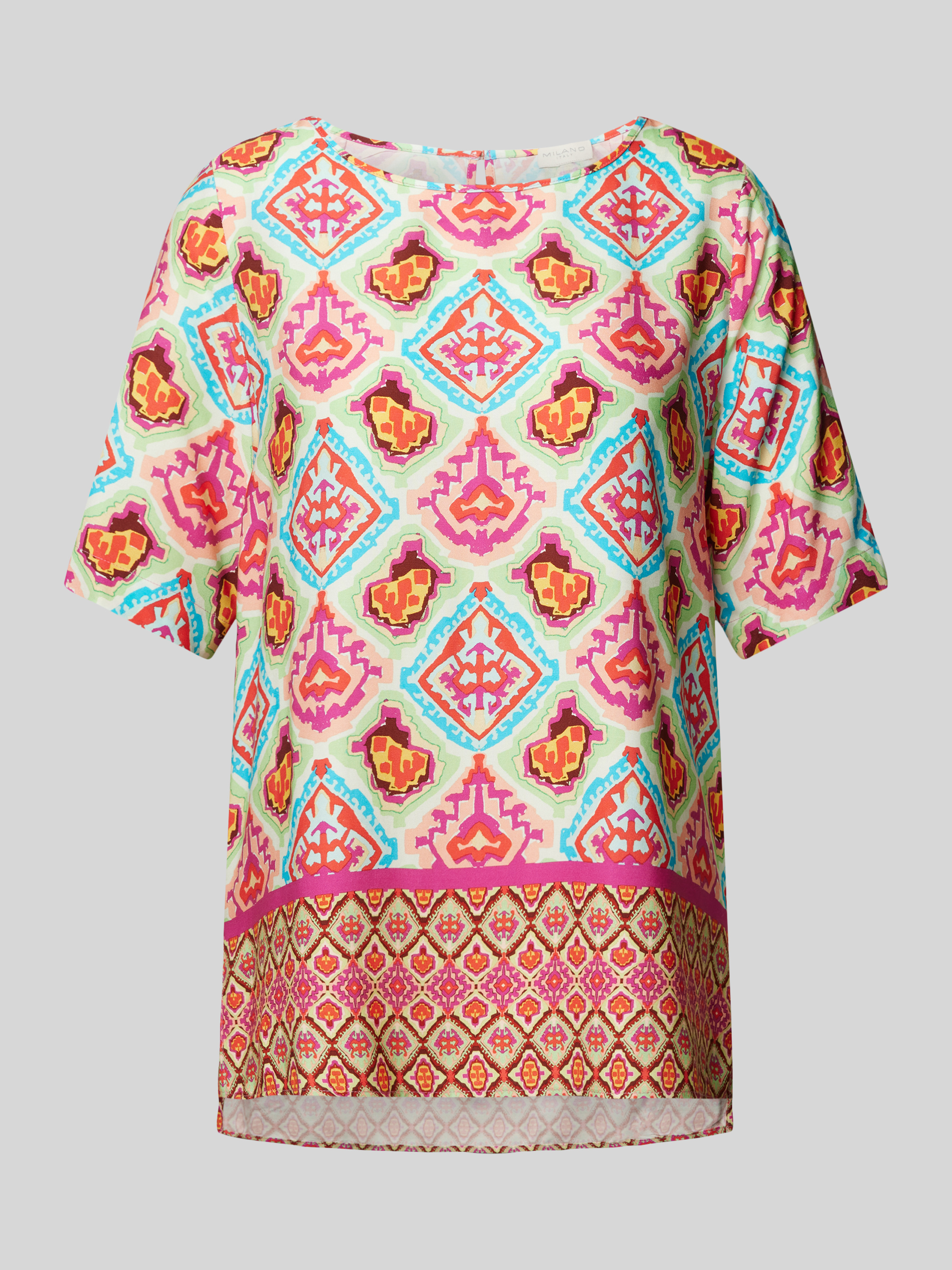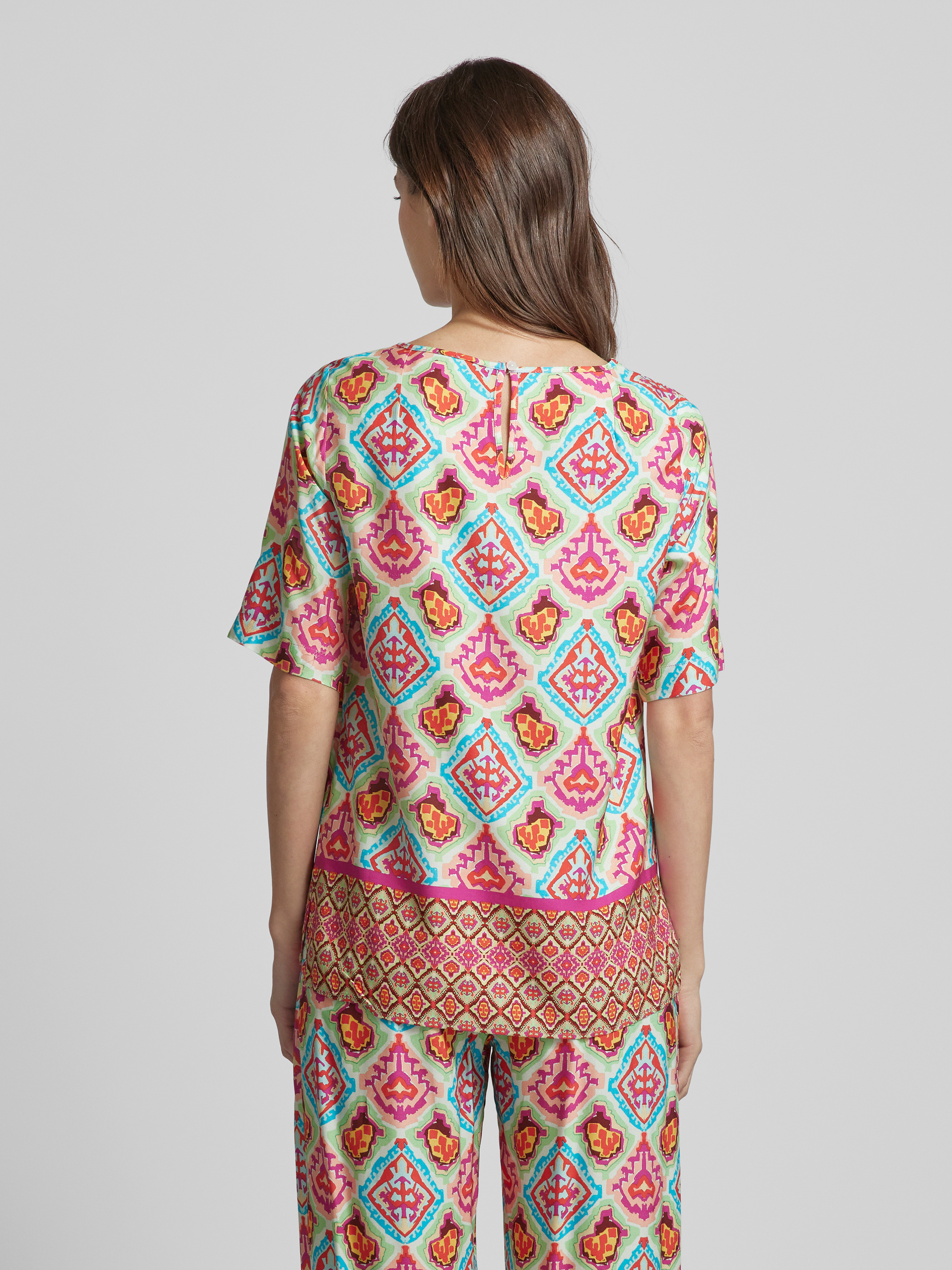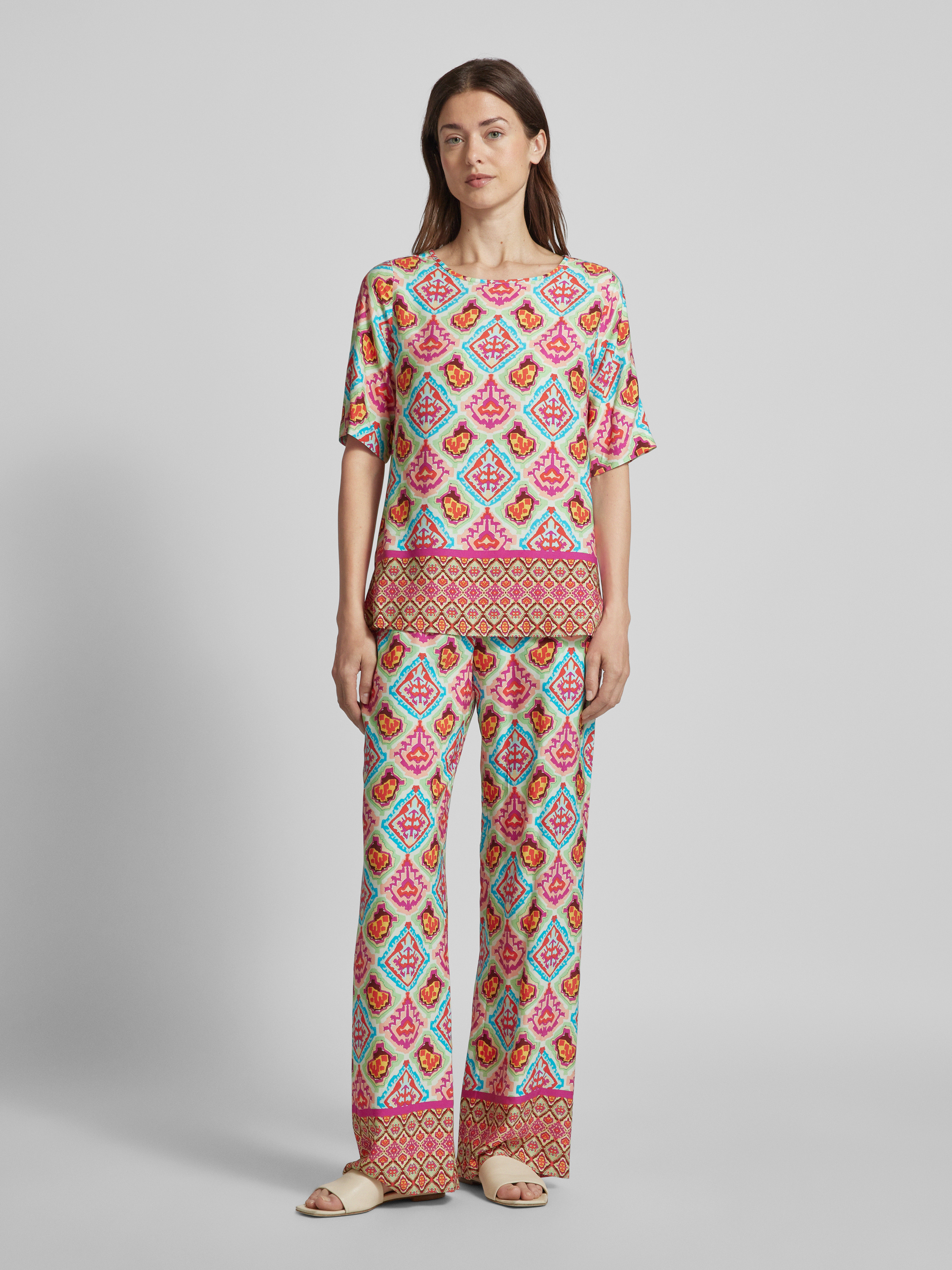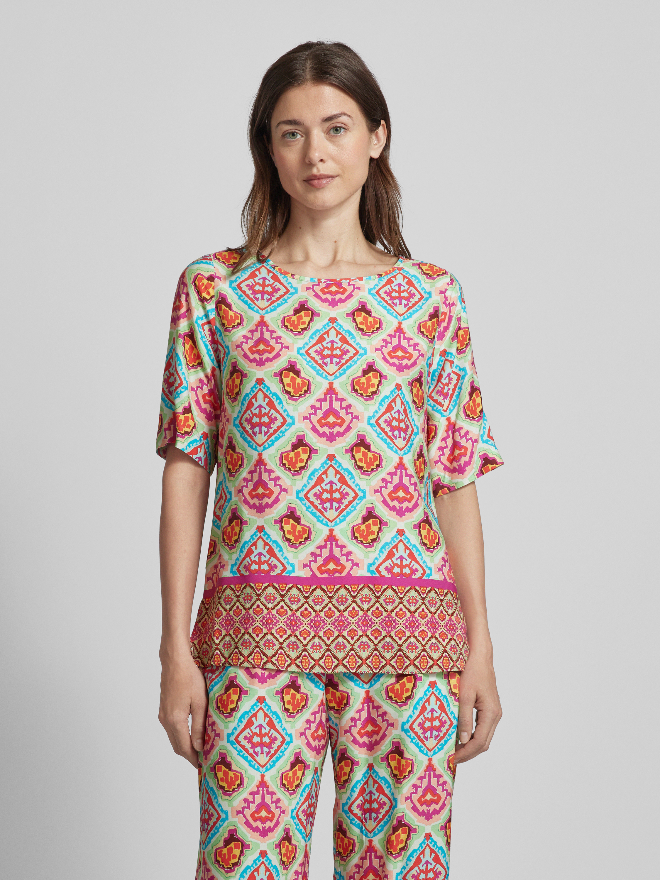 Die Bluse von MILANO ITALY aus reiner Viskose kombiniert ein lebendiges Allover-Muster mit einem lässigen, geraden Schnitt. Ein Rundhalsausschnitt und halblange Ärmel ergänzen das Design, das sich ideal für einen entspannten, aber stilvollen Auftritt im Alltag eignet.