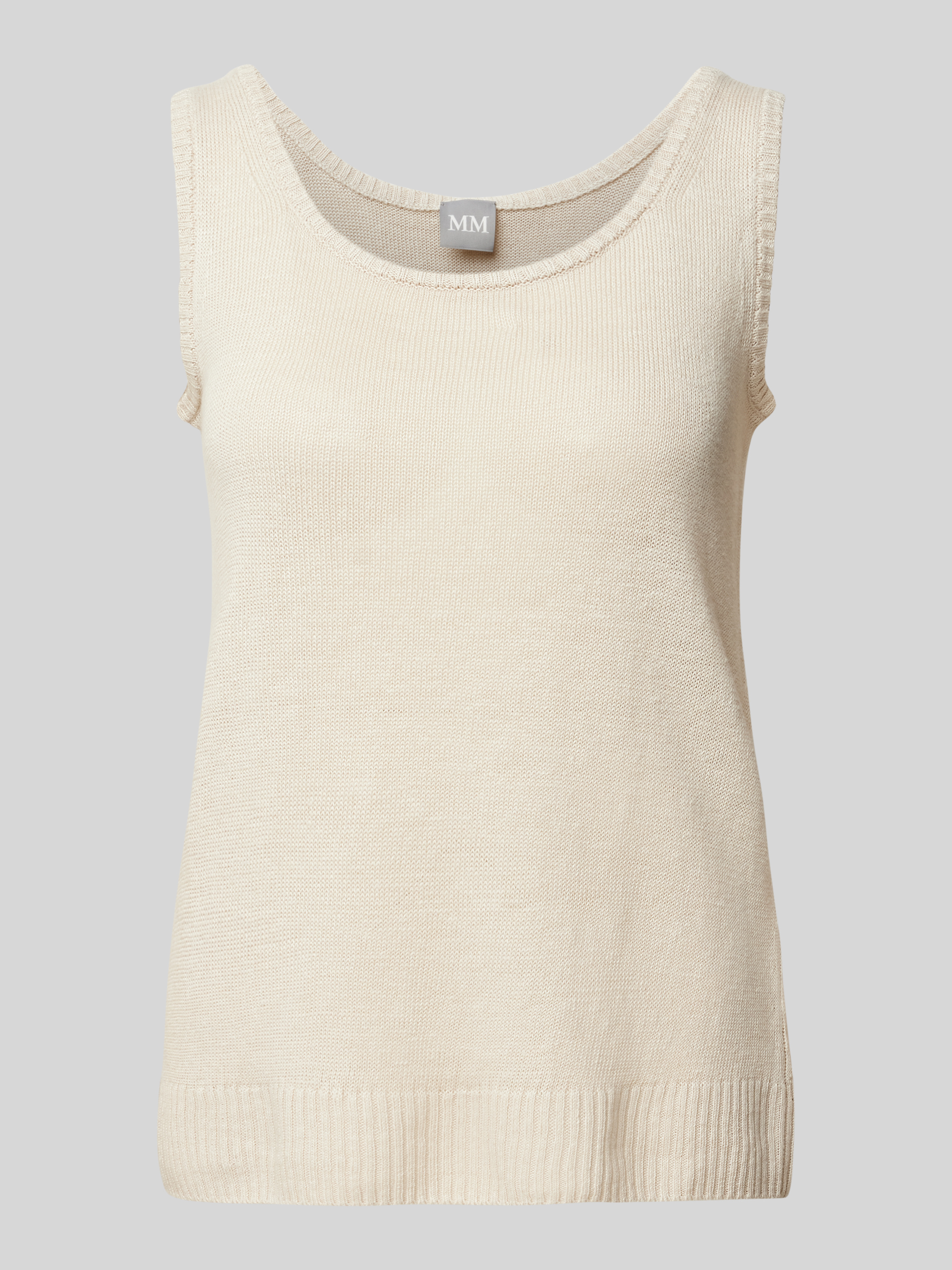 Das Leinenstricktop von MM, Modell 'BACCANO', überzeugt durch sein reines Leinenmaterial, das sich angenehm auf der Haut anfühlt und für eine gute Atmungsaktivität sorgt. Der gerade Schnitt und der Rundhalsausschnitt verleihen ihm eine zeitlose Eleganz. Gerippte Abschlüsse runden das Design harmonisch ab.