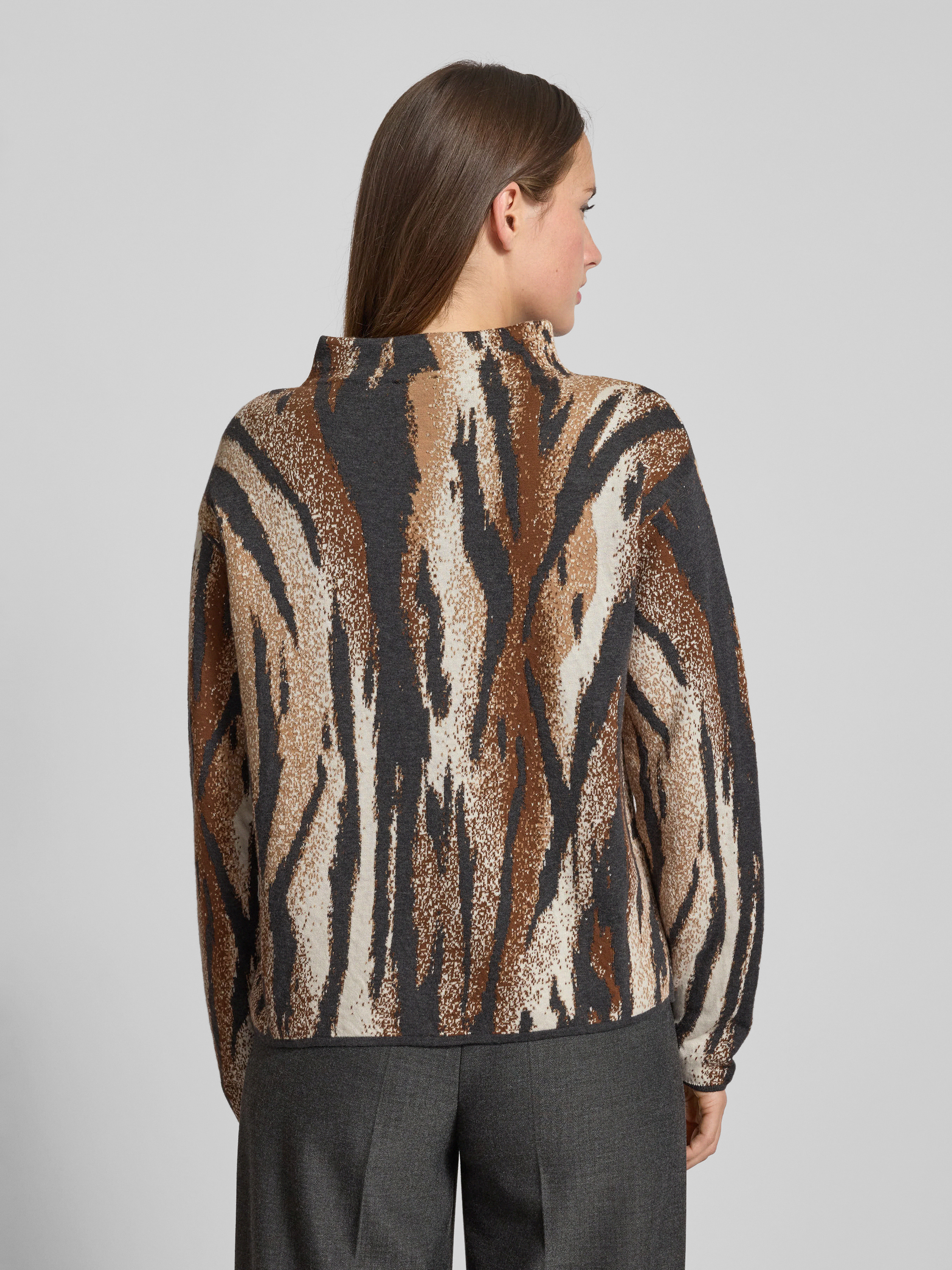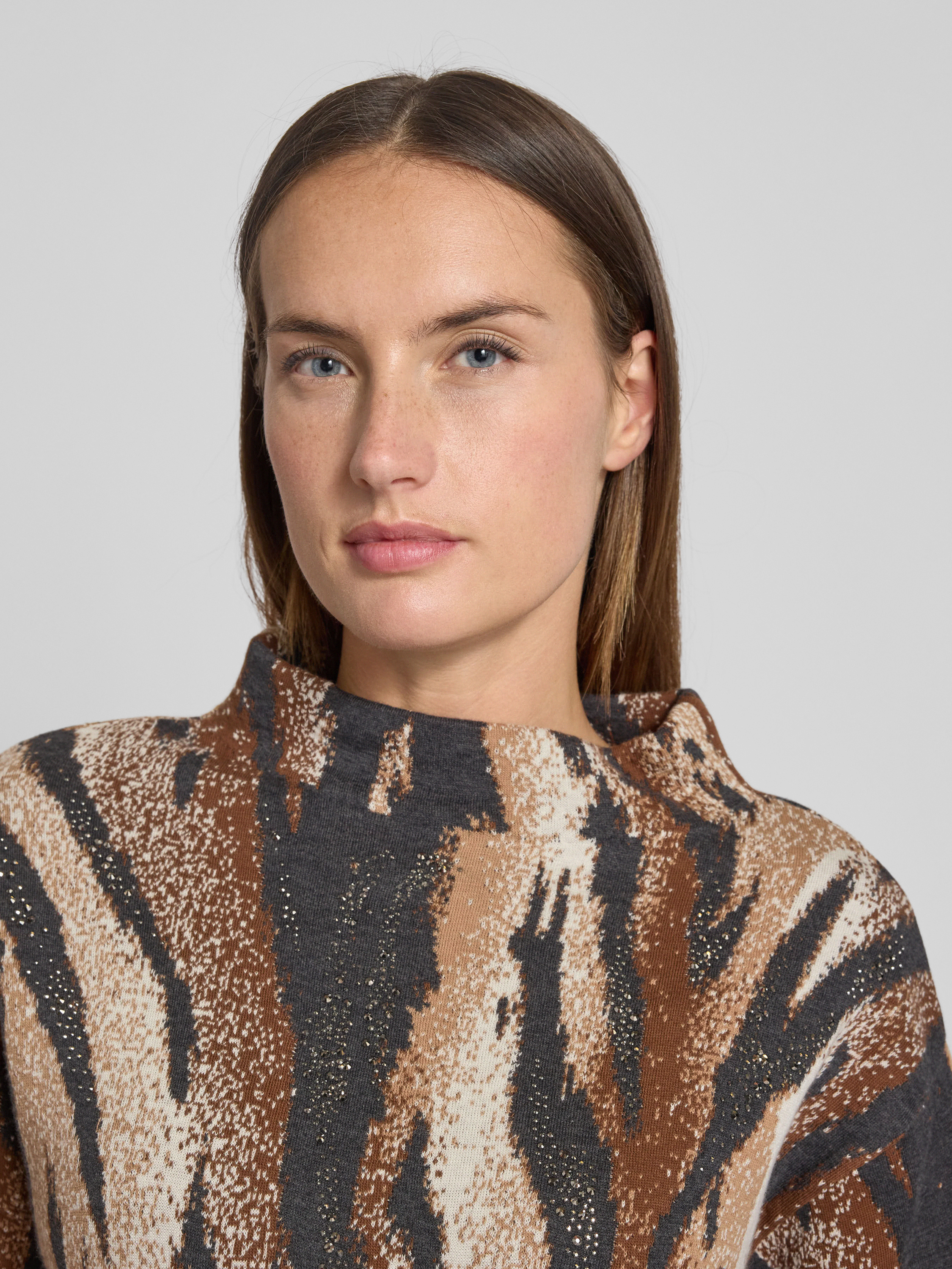 Der Damenpullover von monari aus reiner Baumwolle fällt durch seinen lockeren Schnitt angenehm lässig und sorgt für ein entspanntes Tragegefühl. Der Stehkragen setzt einen dezenten Akzent, wodurch das Modell vielseitig kombinierbar bleibt. Besonders an kühleren Tagen schätzt man den weichen Komfort.