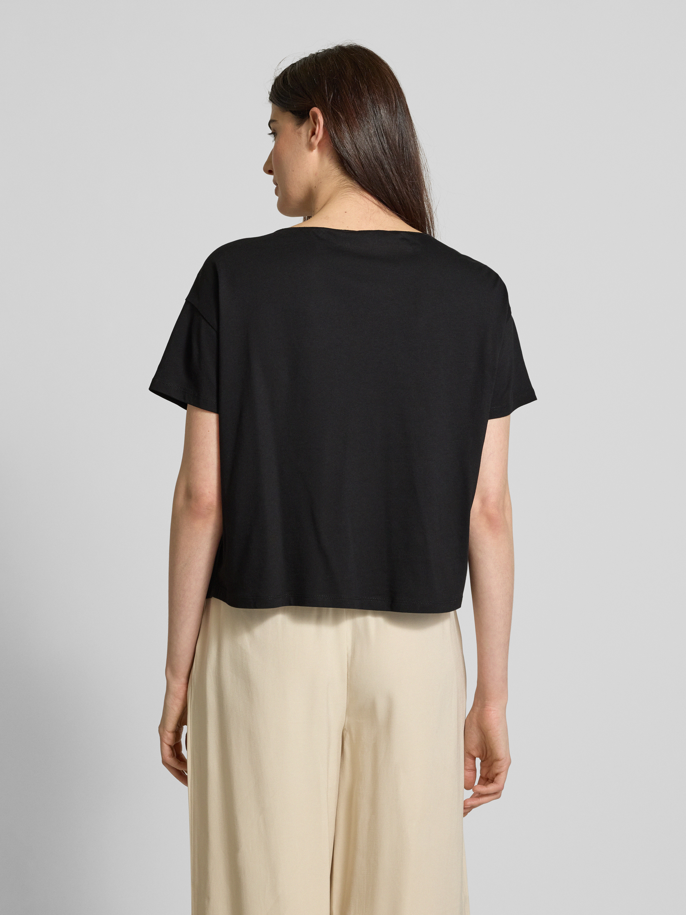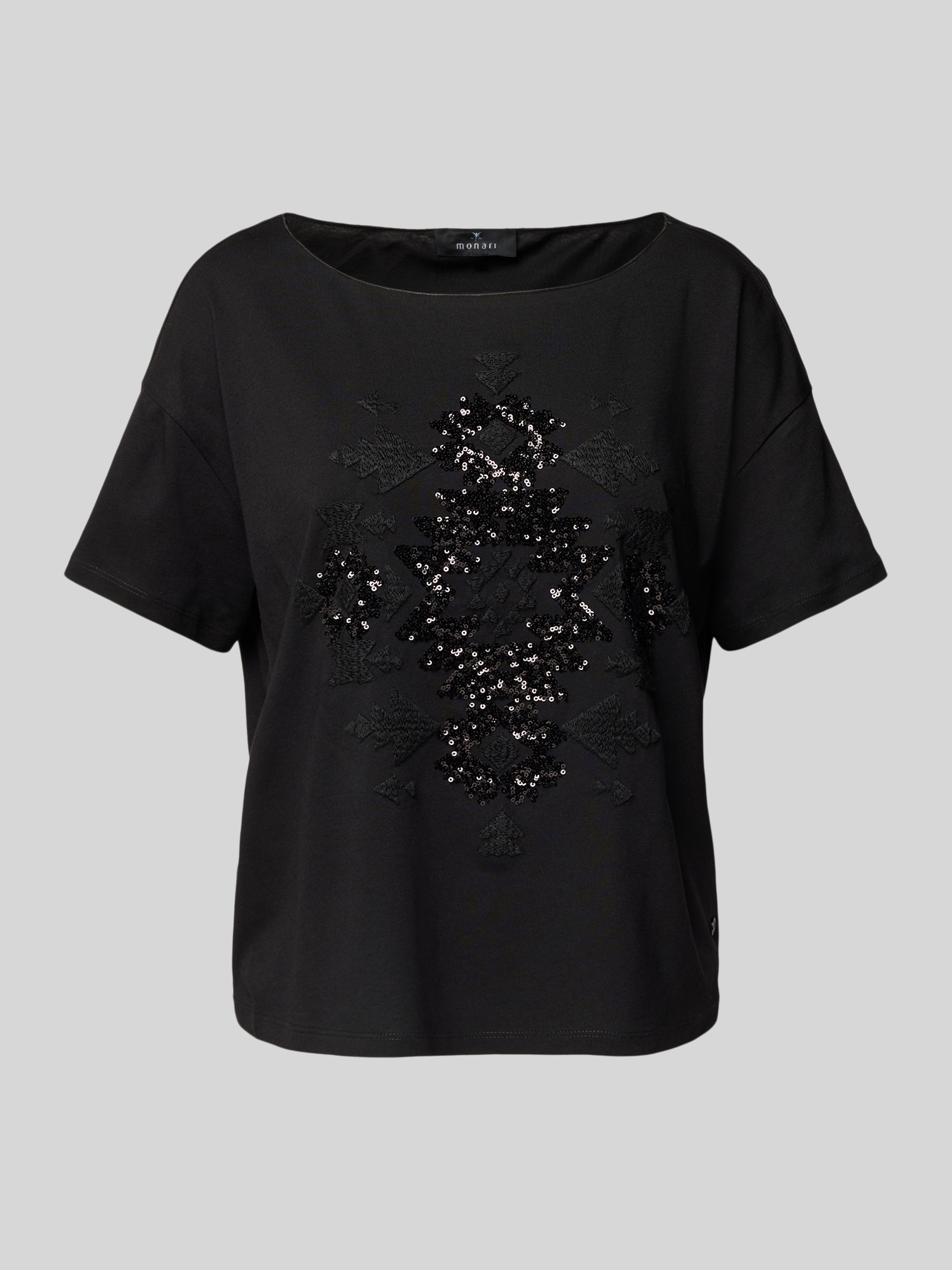 Das Damen T-Shirt von monari kombiniert einen weichen Baumwoll-Modal-Mix mit einem geraden Schnitt und einem klassischen Rundhalsausschnitt. Der Paillettenbesatz und das Motiv-Stitching sorgen für eine besondere Optik, während die überschnittenen Schultern eine lockere Passform ermöglichen. Ideal für modische Akzente im Alltag.