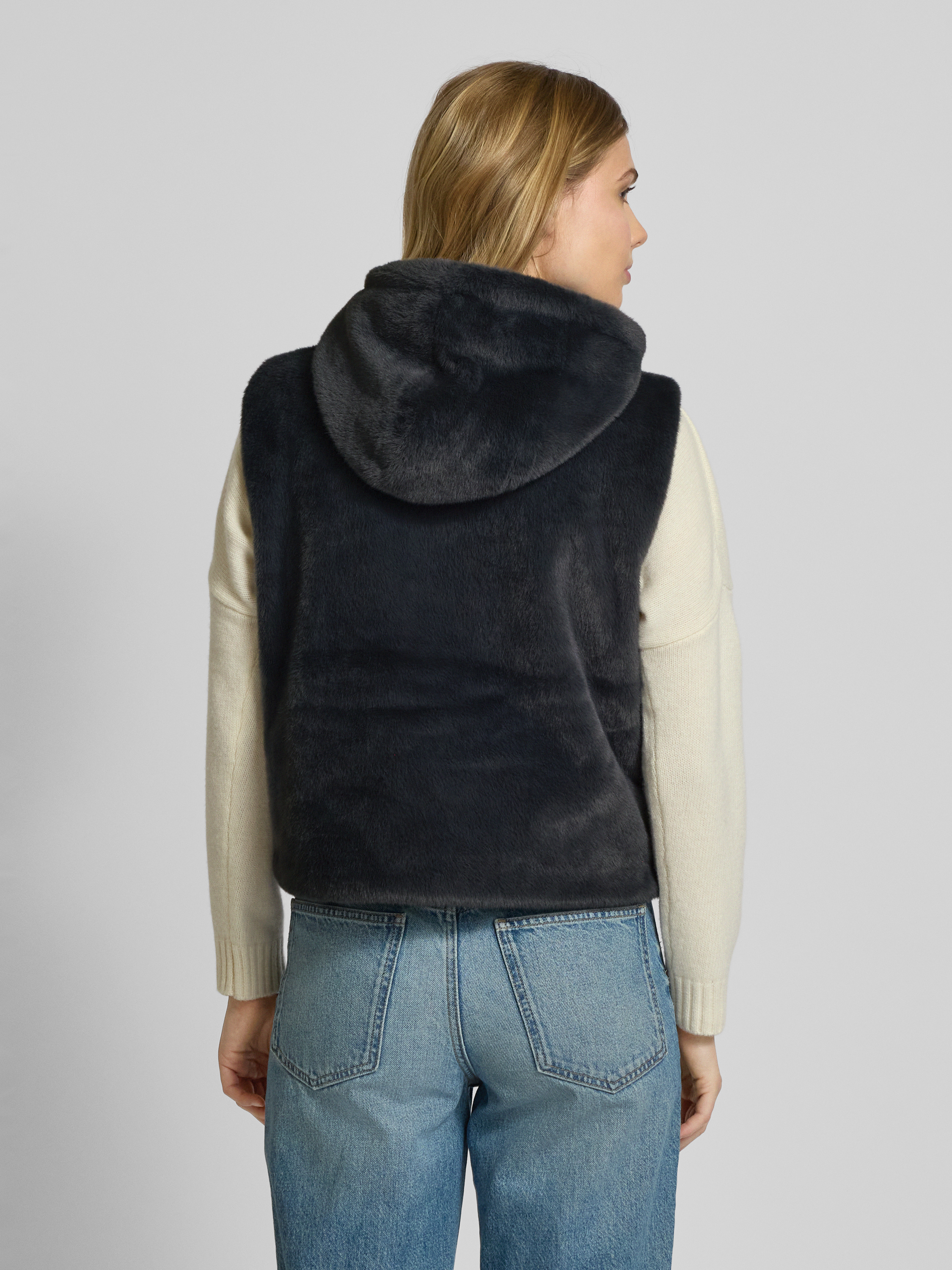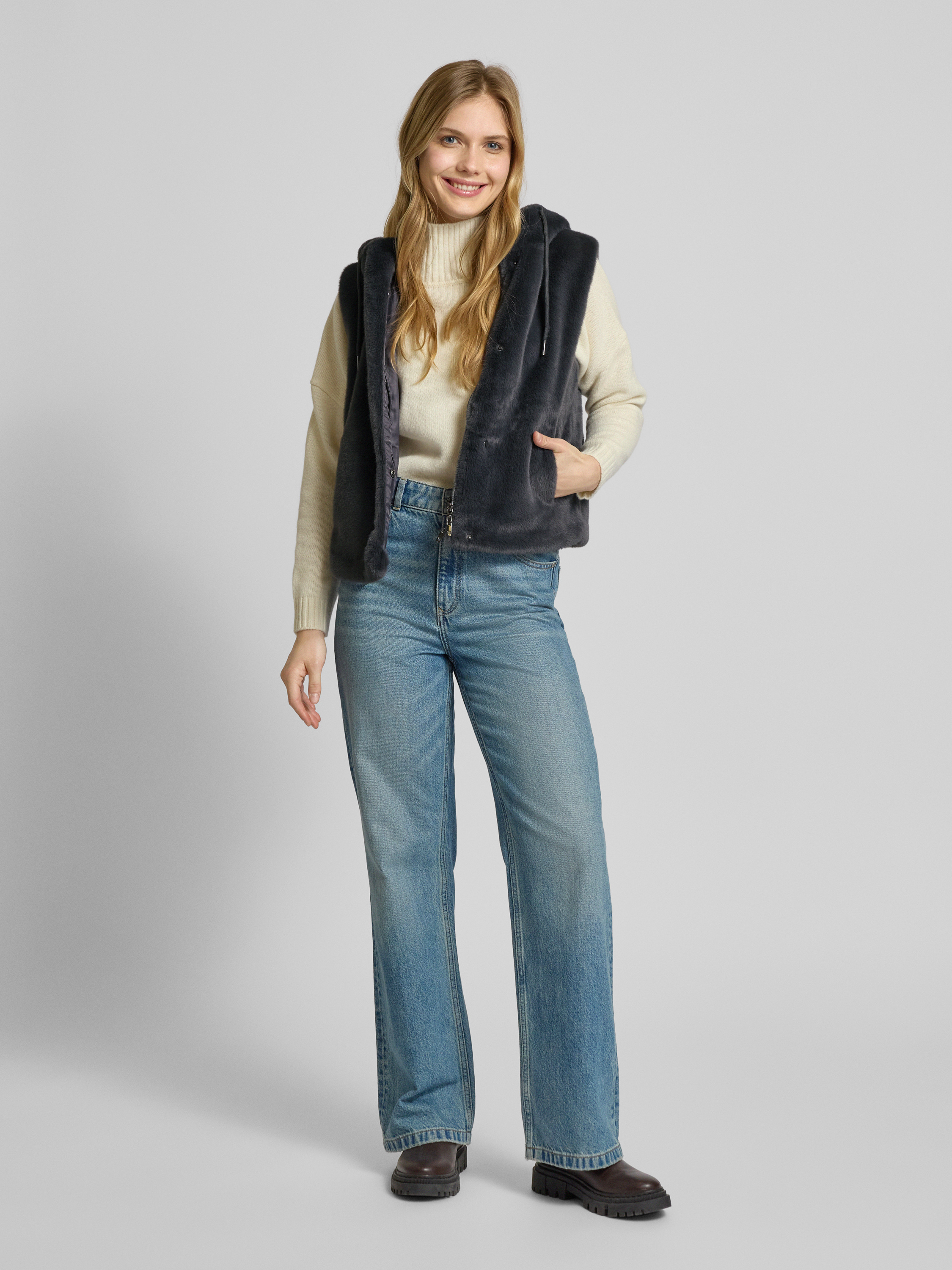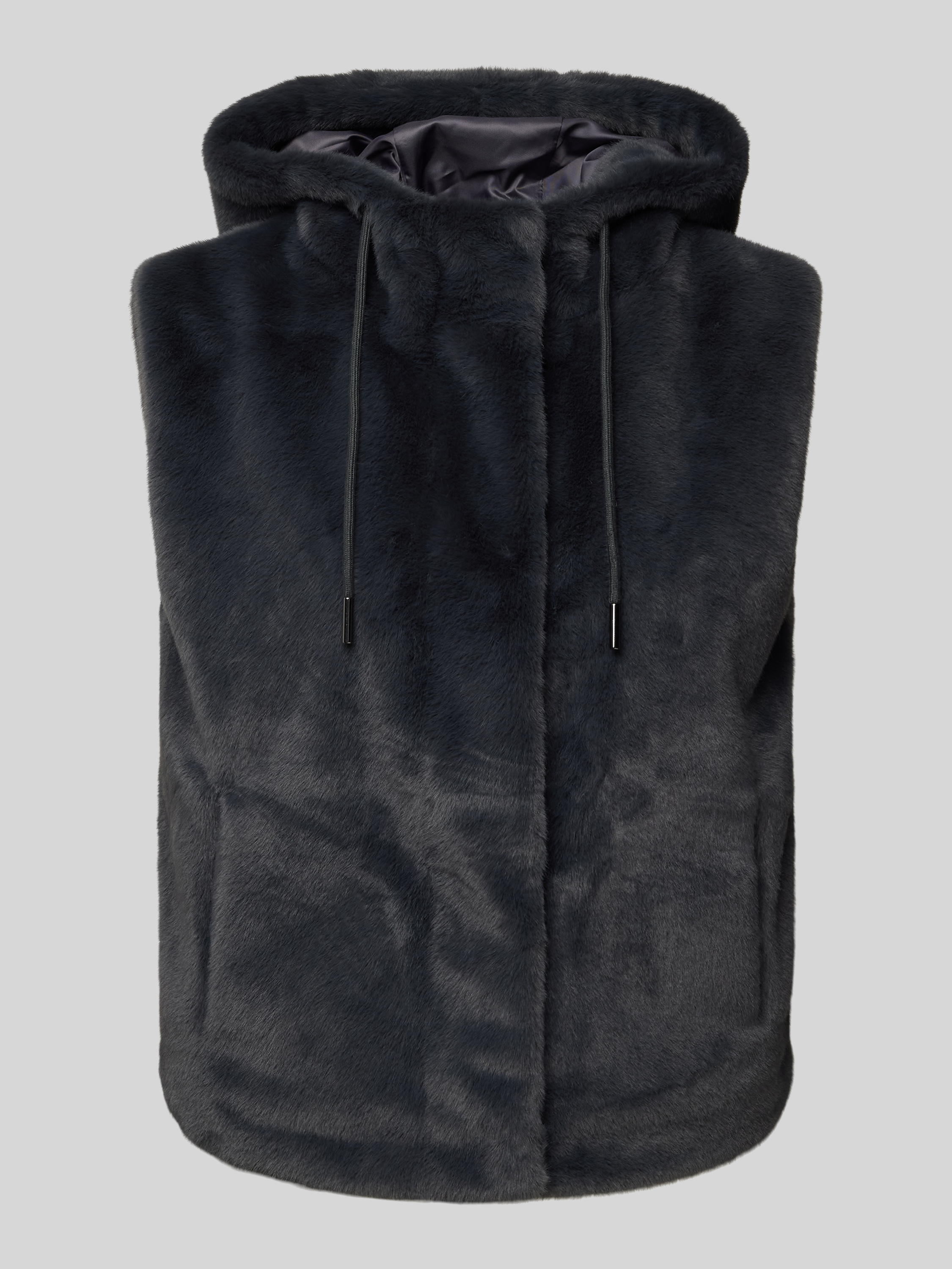 Die Damen Weste von monari vereint Komfort und Stil durch ihren geraden Schnitt und das weiche Kunstfell. Mit einer Kapuze, die per Tunnelzug angepasst werden kann, und praktischen seitlichen Eingrifftaschen eignet sie sich ideal für wechselhafte Wetterbedingungen.