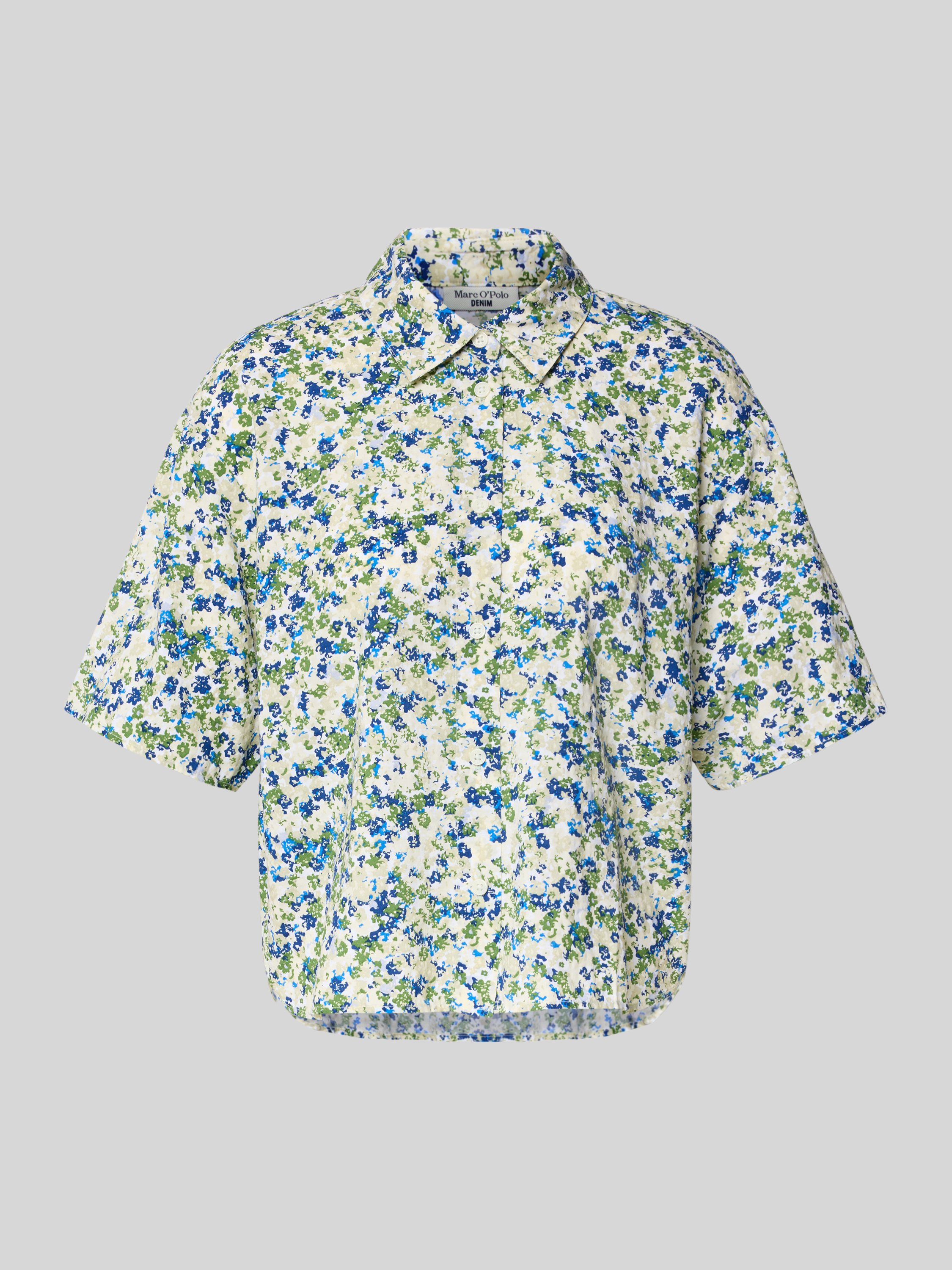 Die Regular Fit Bluse von Marc O'Polo Denim kombiniert einen Viskose-Baumwoll-Mix mit einem markanten Allover-Look, der jedem Outfit eine interessante Note verleiht. Der Hemdblusenkragen und die halblangen Ärmel sorgen für eine lässige Passform, die vielseitig einsetzbar ist.