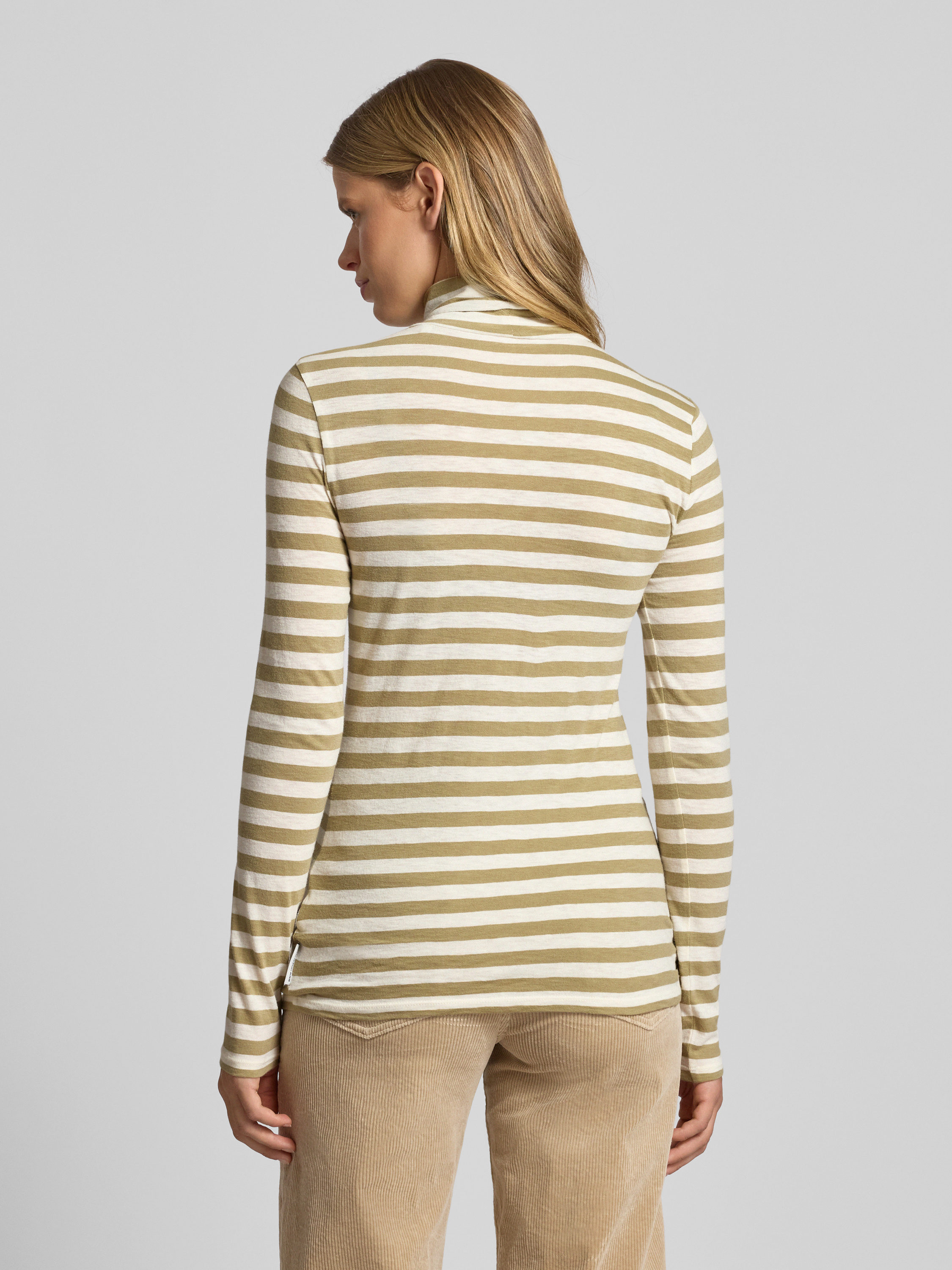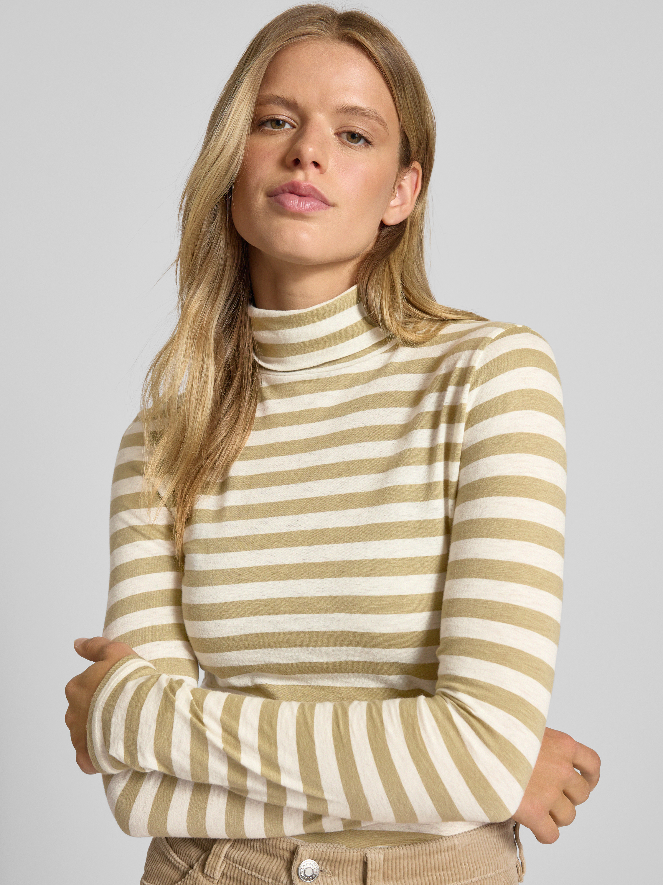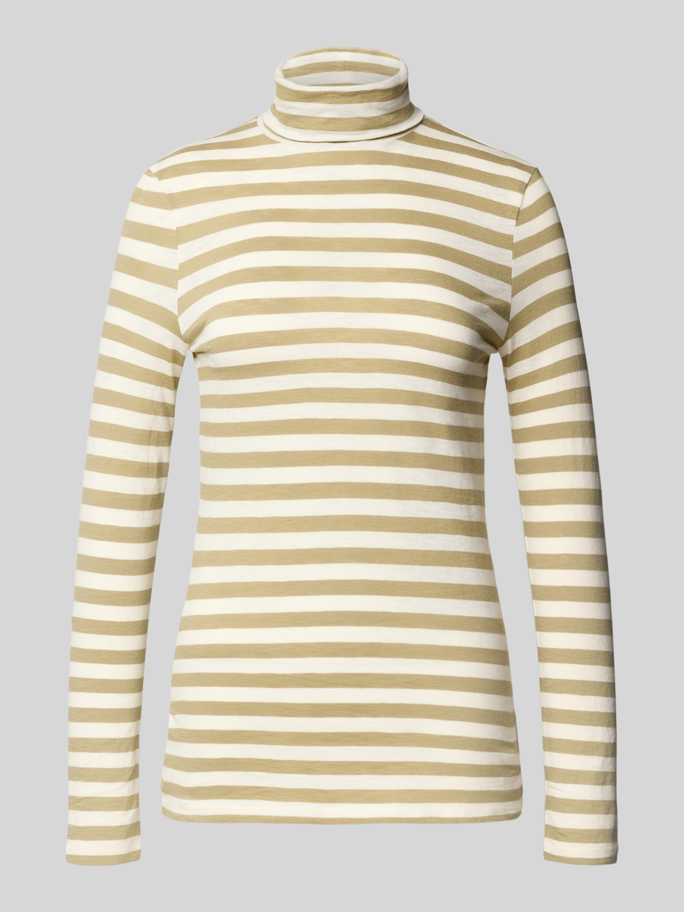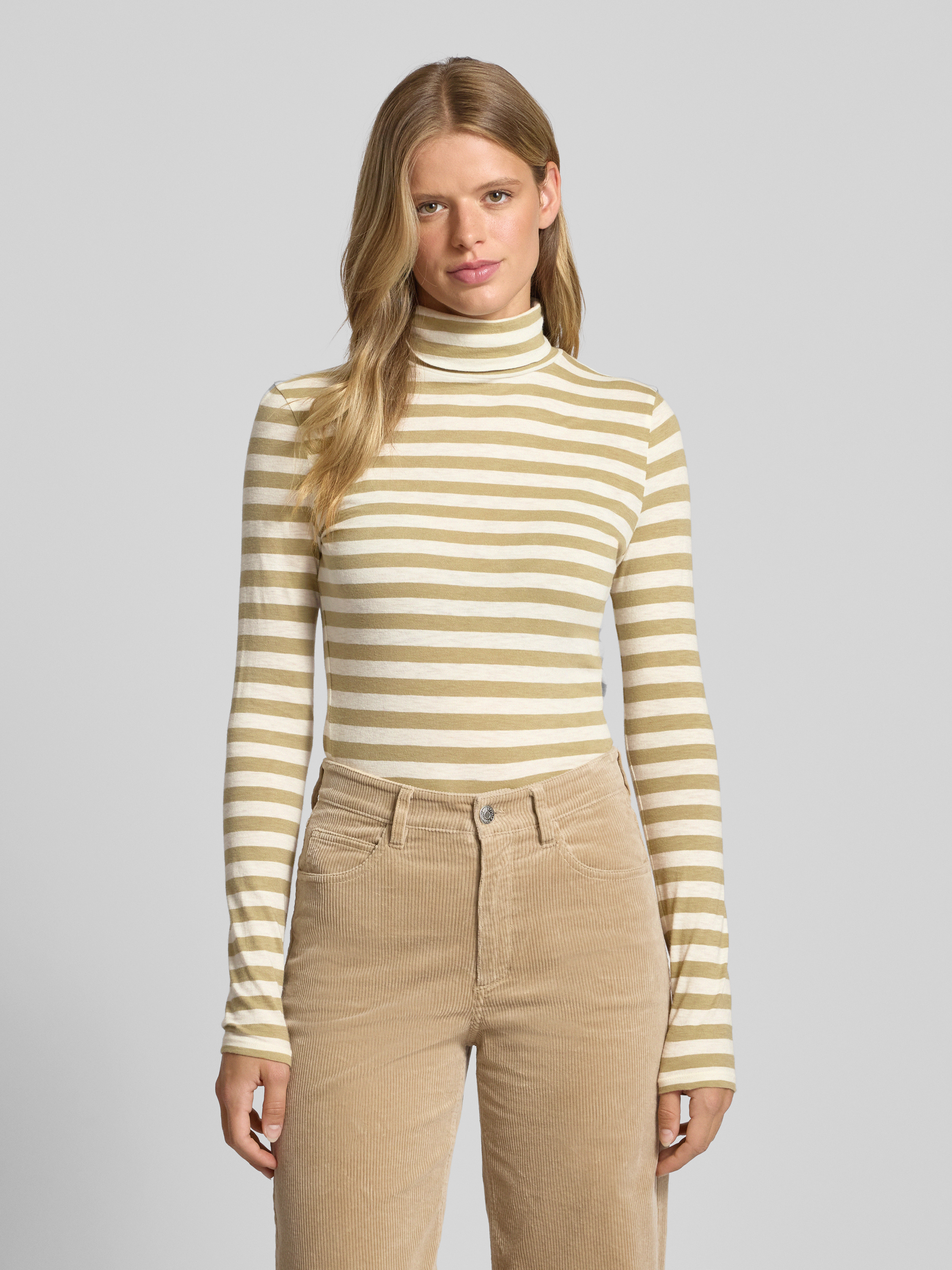 Das Damen Langarmshirt von Marc O’Polo Denim zeigt ein fein gestreiftes Allover-Muster, das den schmalen Schnitt betont. Aus reiner Baumwolle gefertigt, fühlt sich das Jersey angenehm auf der Haut an und sorgt für ein ausgeglichenes Tragegefühl – auch bei längeren Tagen. Der hochgeschlossene Ausschnitt rundet das Design ab.