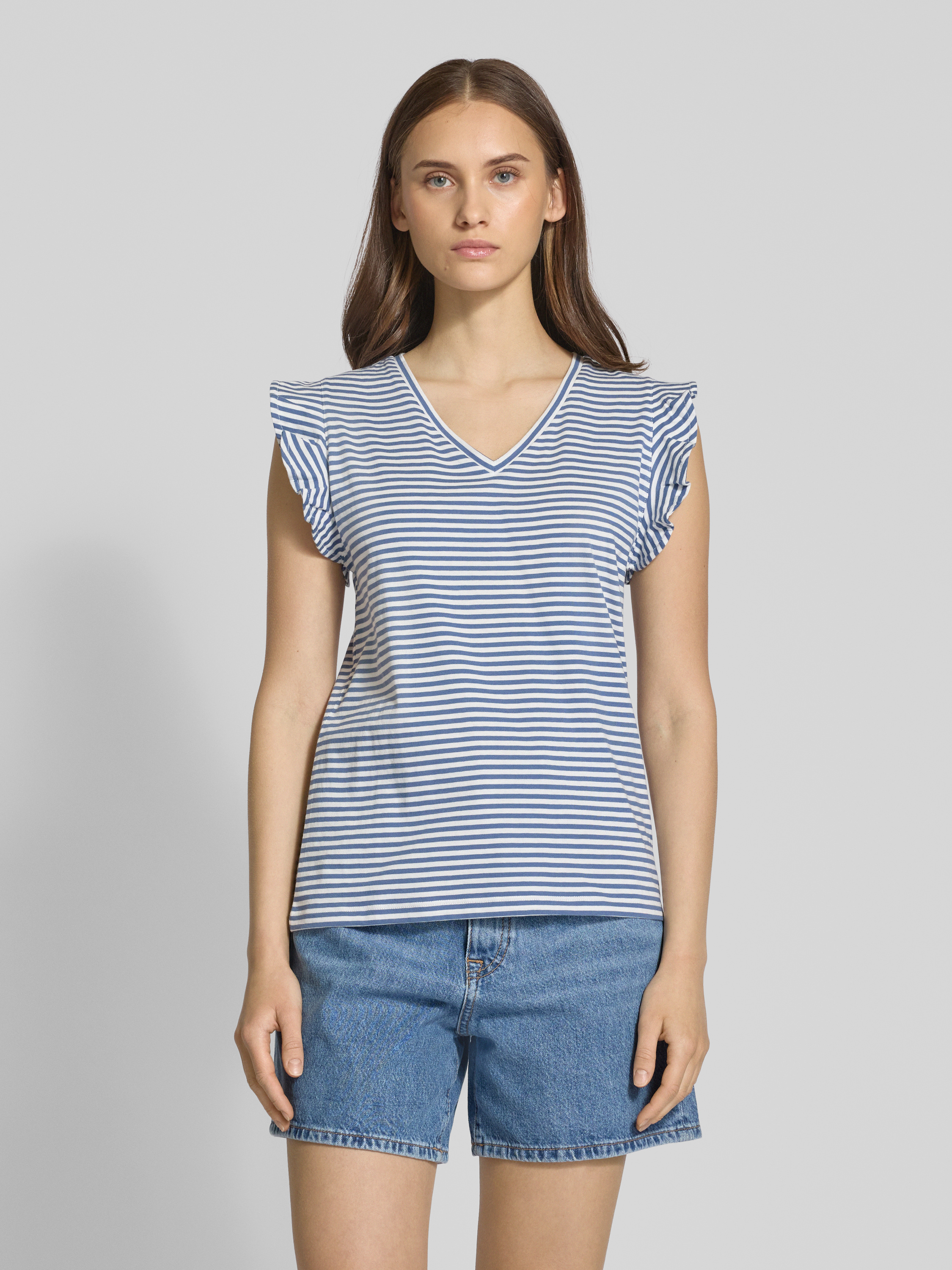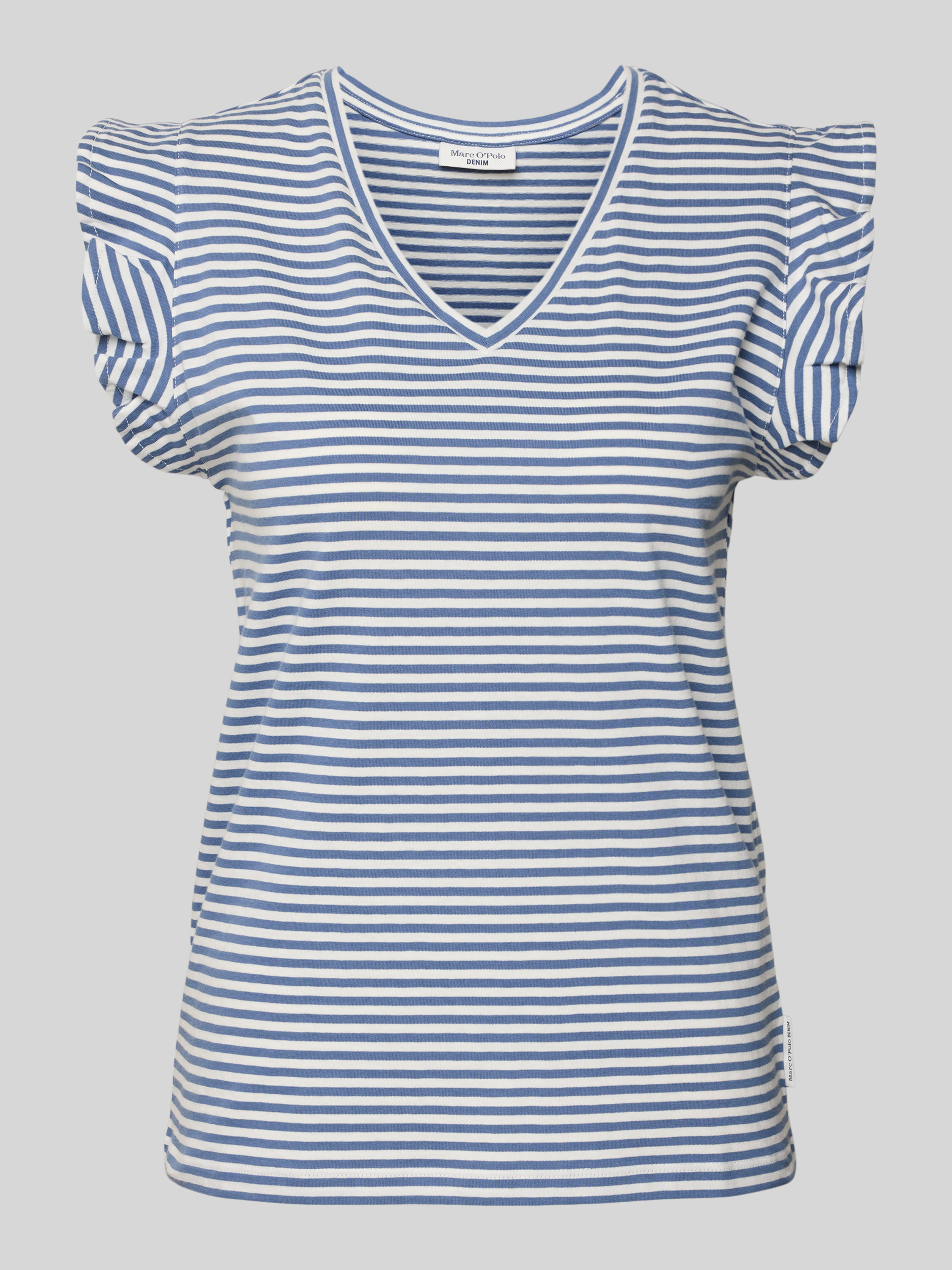 Das Damen-T-Shirt von Marc O’Polo Denim beeindruckt durch seine angenehme Passform und die verspielten Volantärmel. Aus reiner Baumwolle gefertigt, bietet es ein komfortables Tragegefühl für den Alltag. Der gerippte V-Ausschnitt verleiht dem Kleidungsstück eine dezente Eleganz.