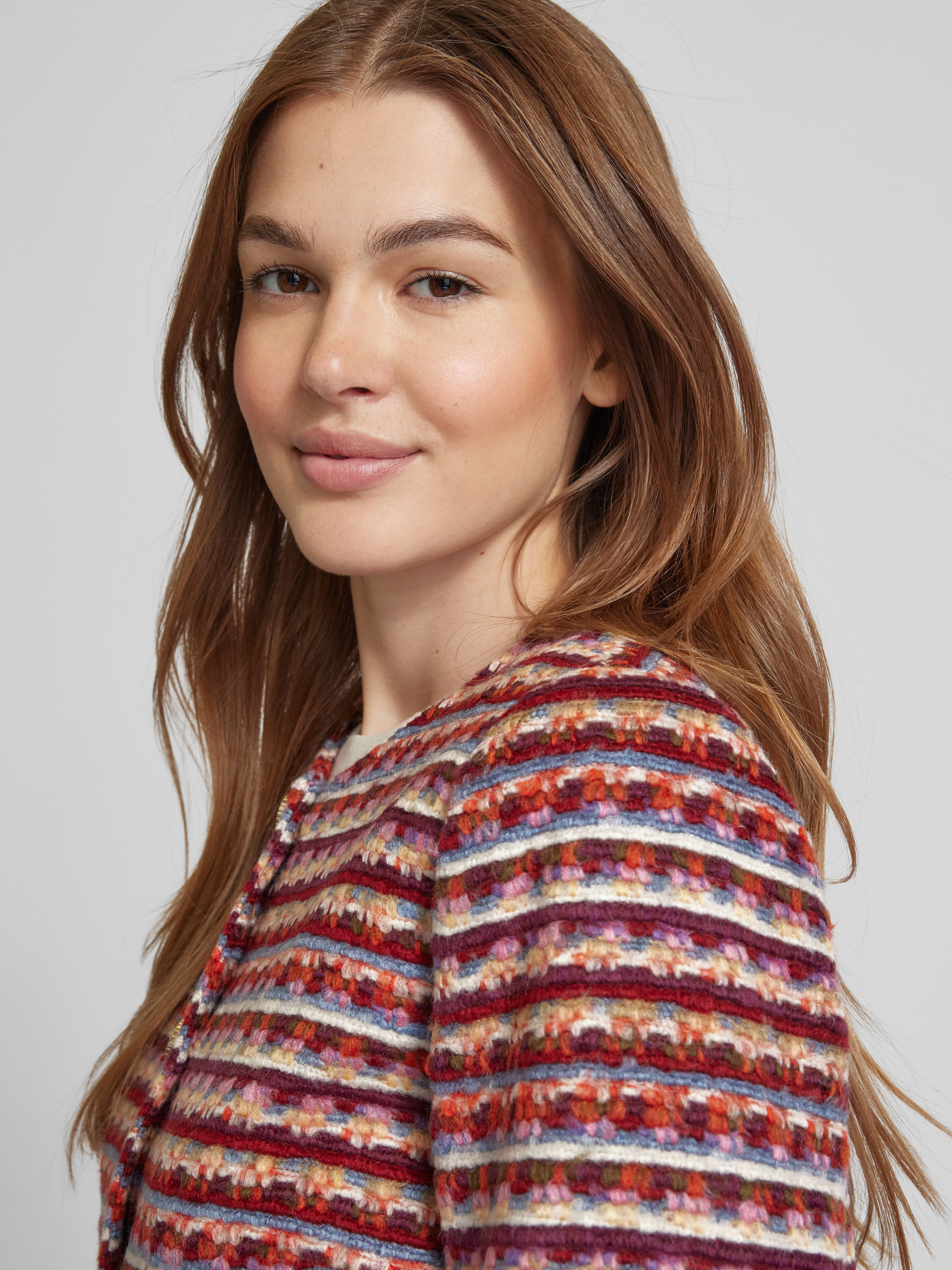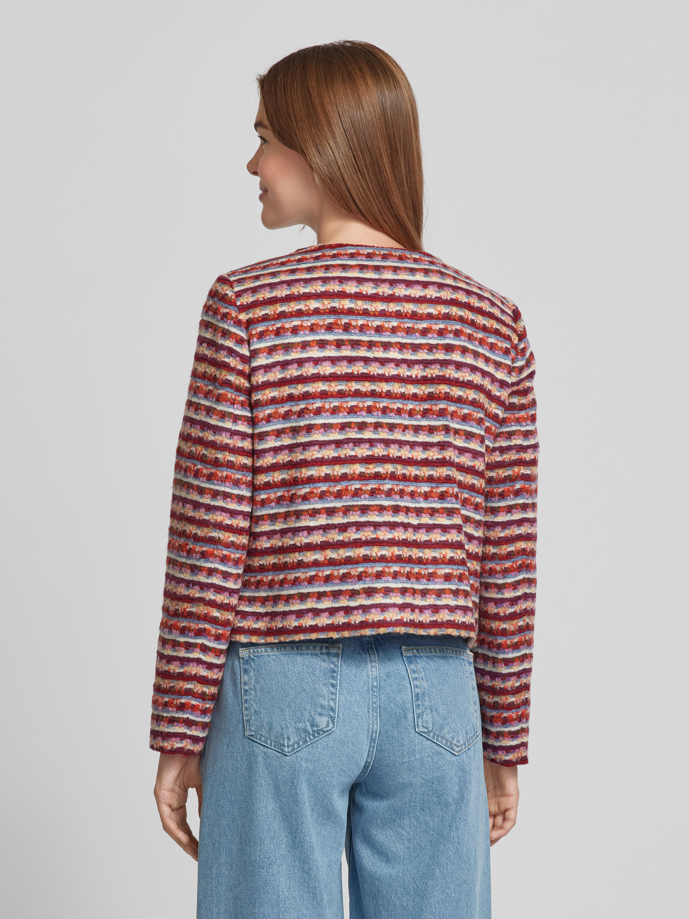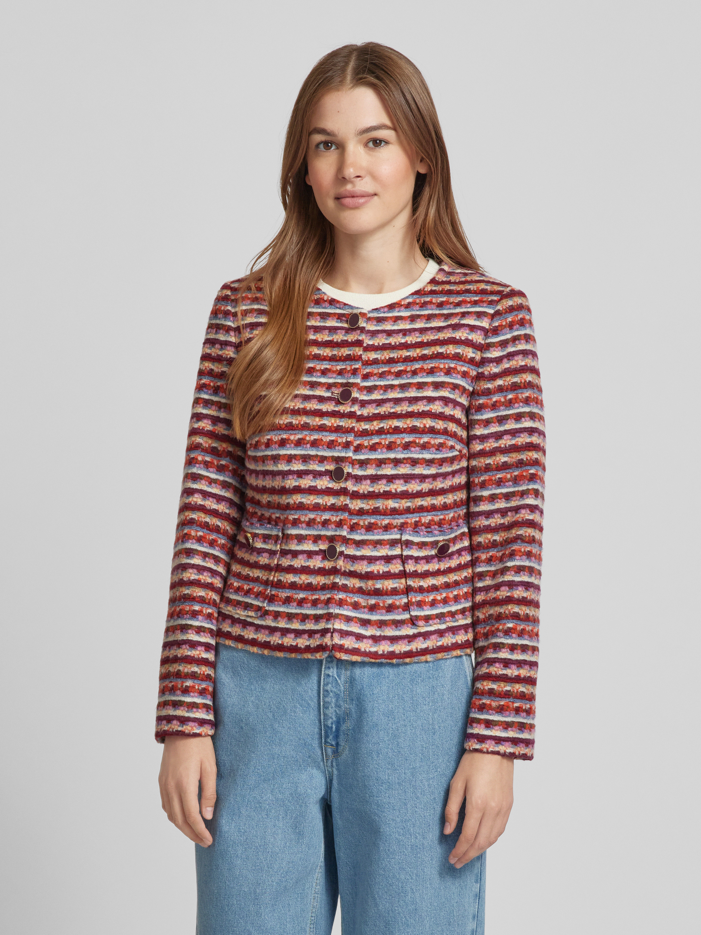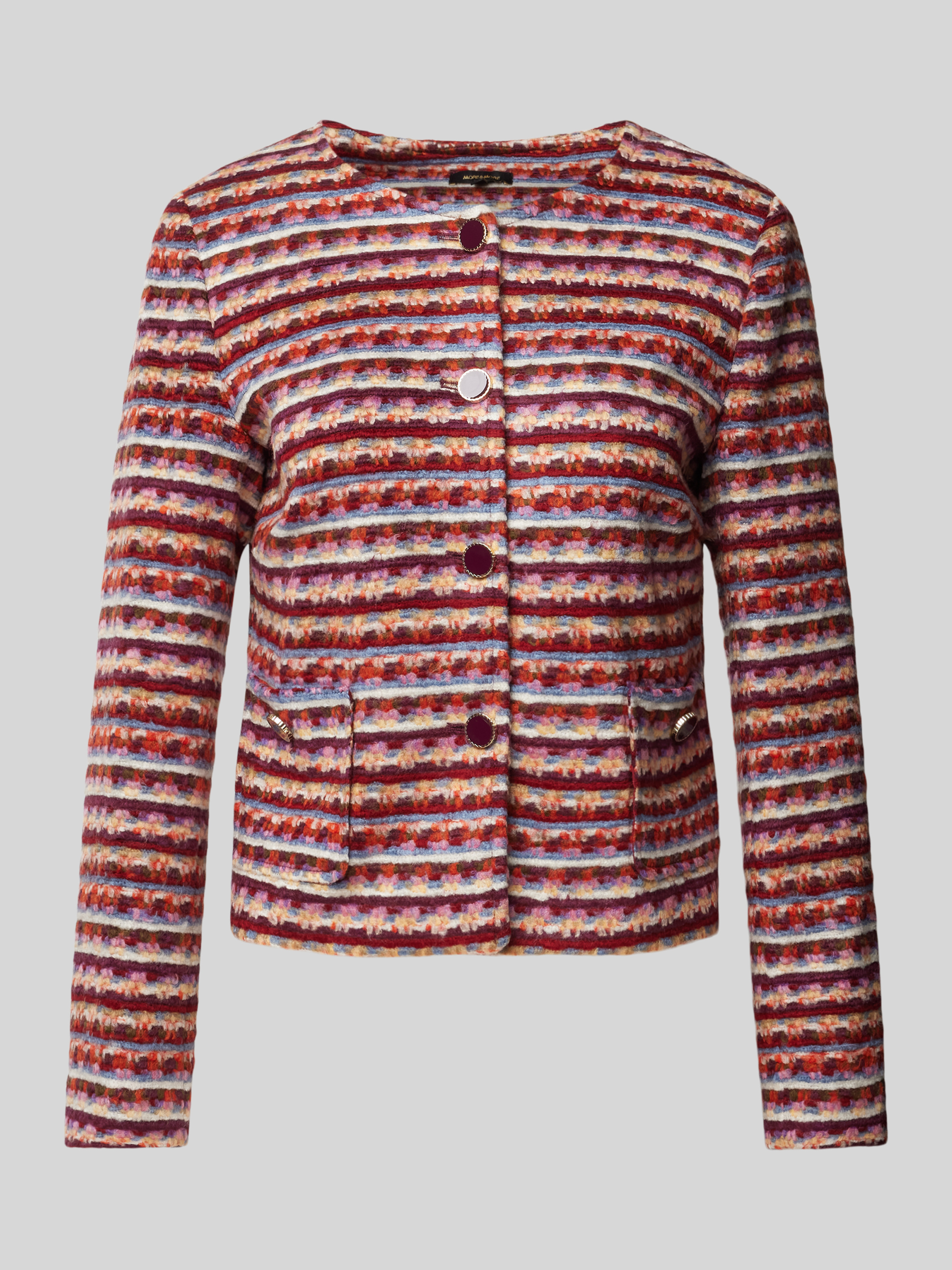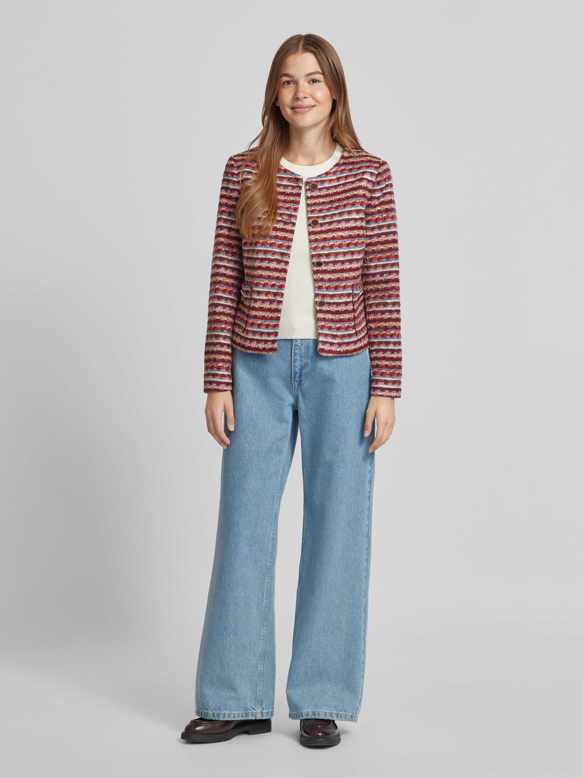 Der Blazer in Bouclé-Optik von MORE & MORE zeichnet sich durch seinen taillierten Schnitt und den eleganten Rundhalsausschnitt aus, wodurch eine feminine Silhouette entsteht. Die aufgesetzten Eingrifftaschen fügen praktische Details hinzu, während die strukturierte Bouclé-Optik dem Design eine ansprechende Textur verleiht.