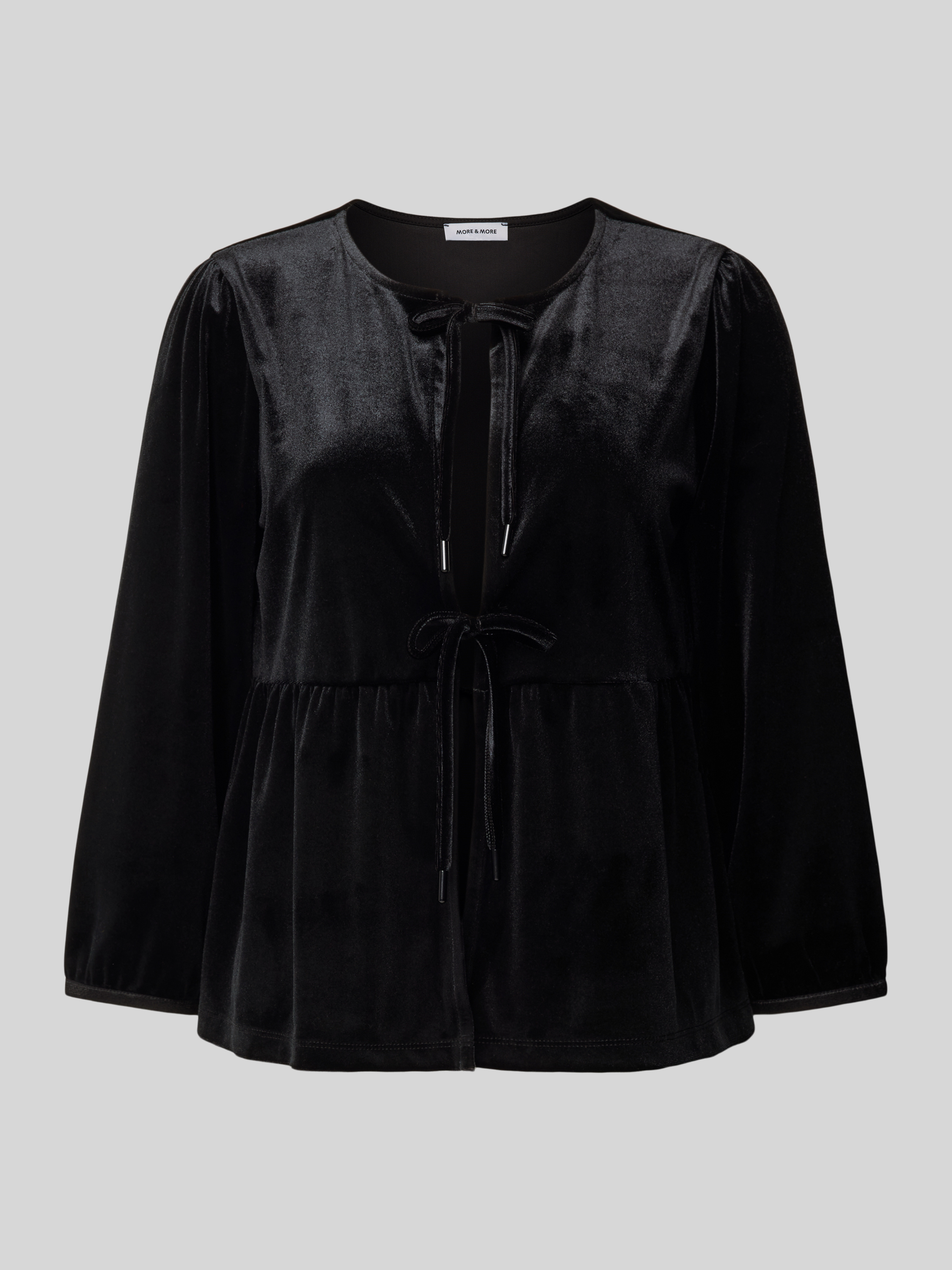 Das Damen Blusenshirt von More & More aus Samt zeigt sich im Regular-Fit und legt sich angenehm weich auf die Haut. Durch die Schnürung am Rundhalsausschnitt erhält das Oberteil eine dezente, individuelle Note. Die 3/4-Arm-Länge macht das Tragen im Alltag besonders unkompliziert.