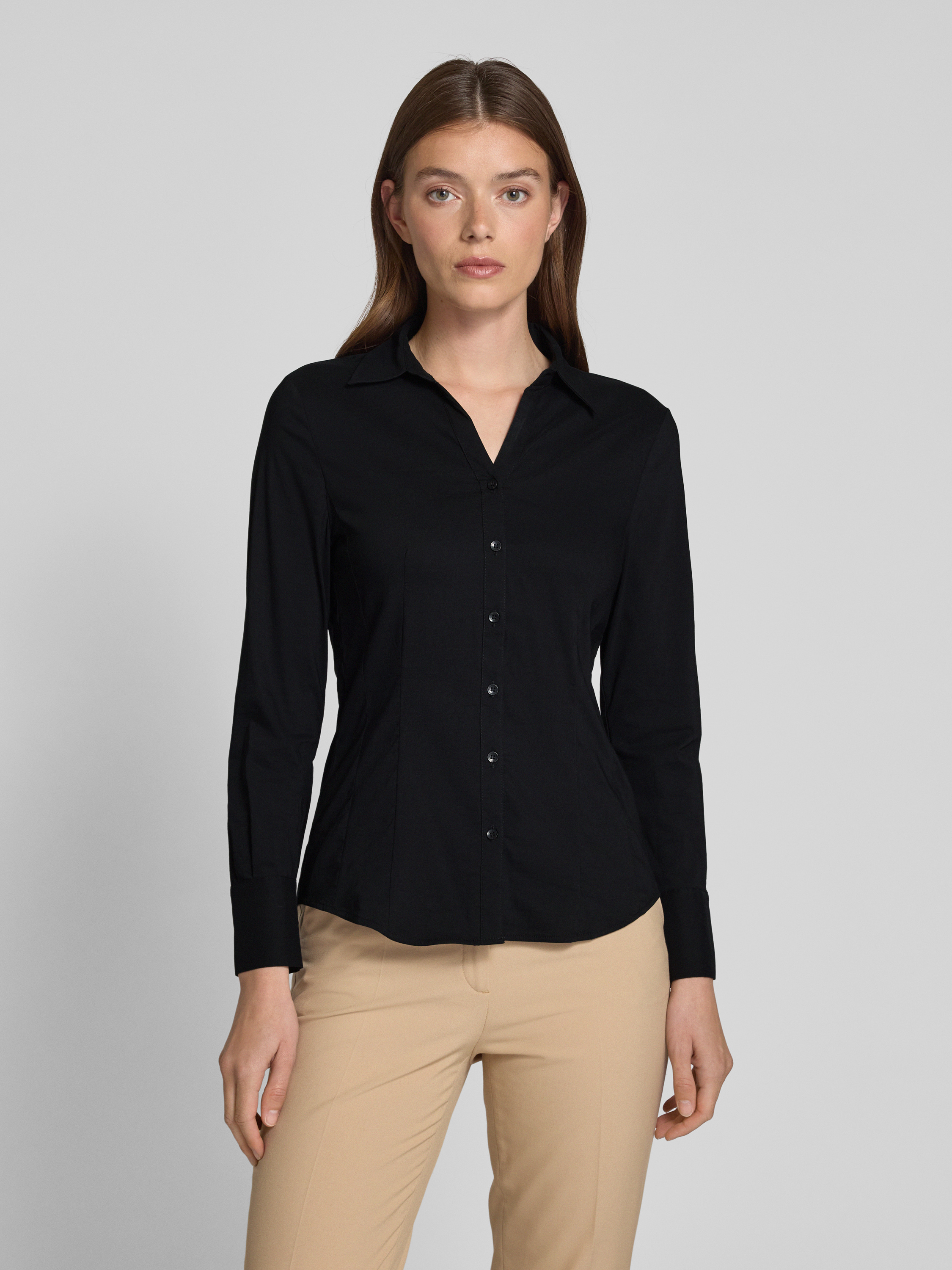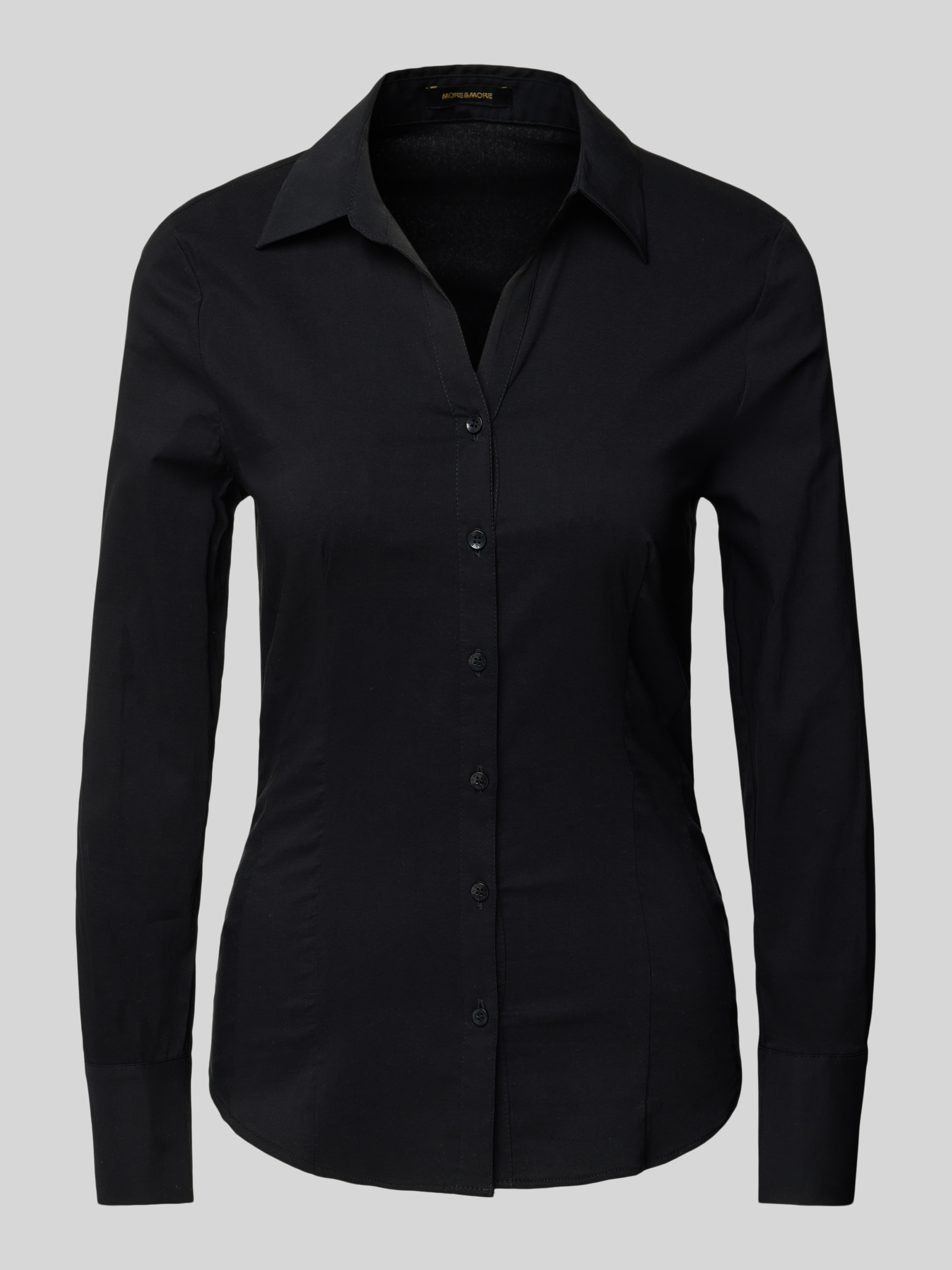 Die Hemdbluse von MORE & MORE verbindet den klassischen Hemdblusenkragen mit einem geraden Schnitt, der Bewegungsfreiheit und Komfort bietet. Das unifarbene Design und das dezente Label-Stitching verleihen der Bluse eine elegante Note. Der Baumwoll-Mix mit Elasthan sorgt für ein angenehmes Tragegefühl.