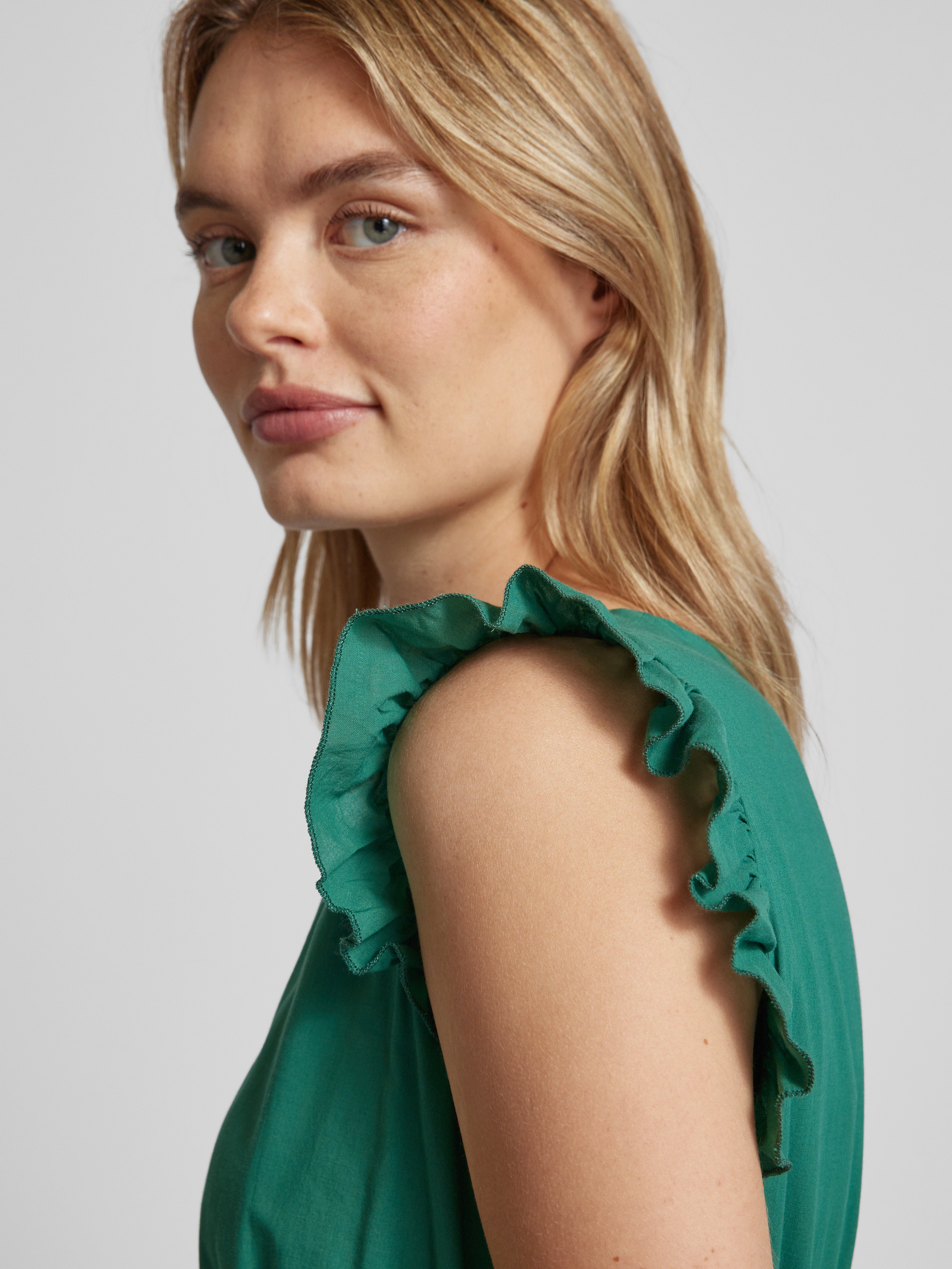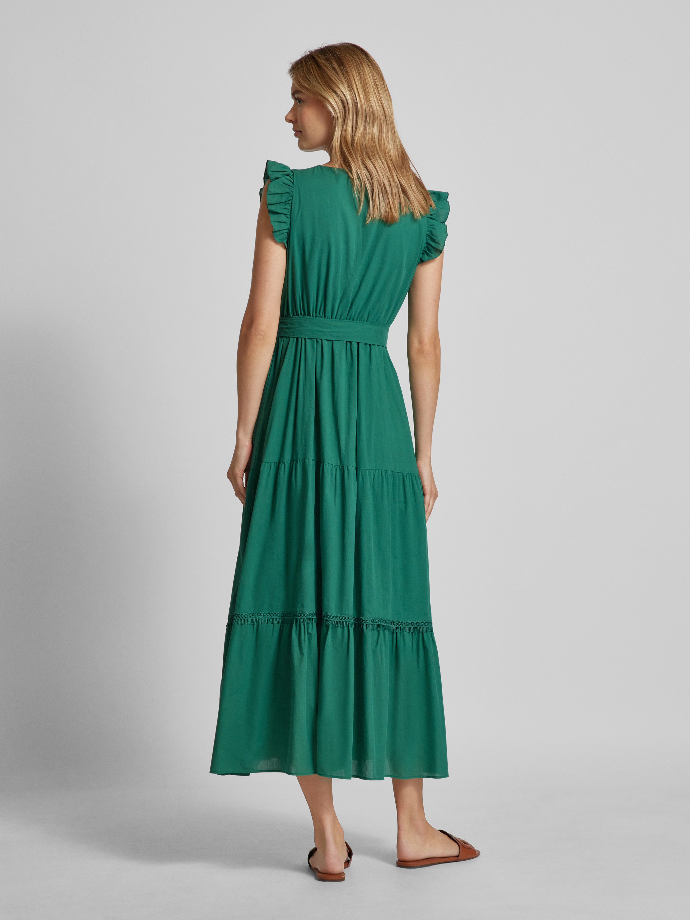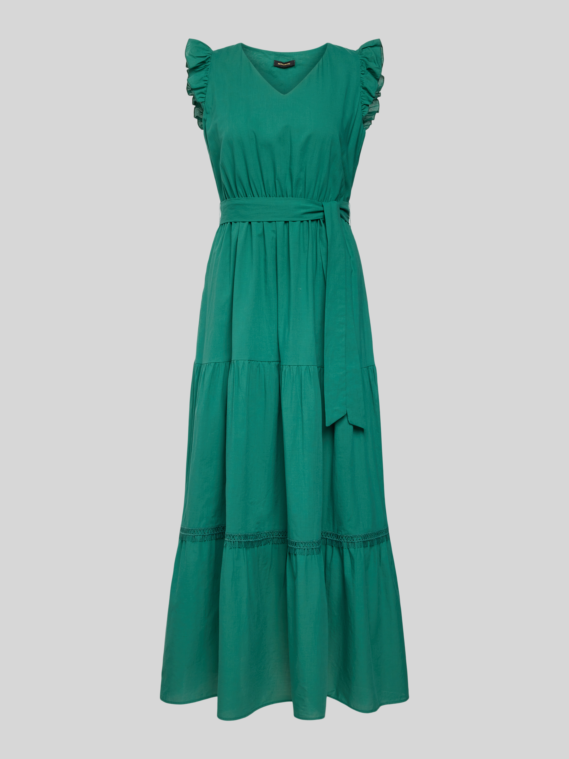 Das Midikleid von MORE & MORE aus reiner Baumwolle verbindet Komfort und Stil auf harmonische Weise. Mit seinem leicht ausgestellten Schnitt und dem V-Ausschnitt schmeichelt es der Figur, während der Bindegürtel eine flexible Anpassung ermöglicht. Der Stufen-Look mit Volants verleiht eine lässige Eleganz.