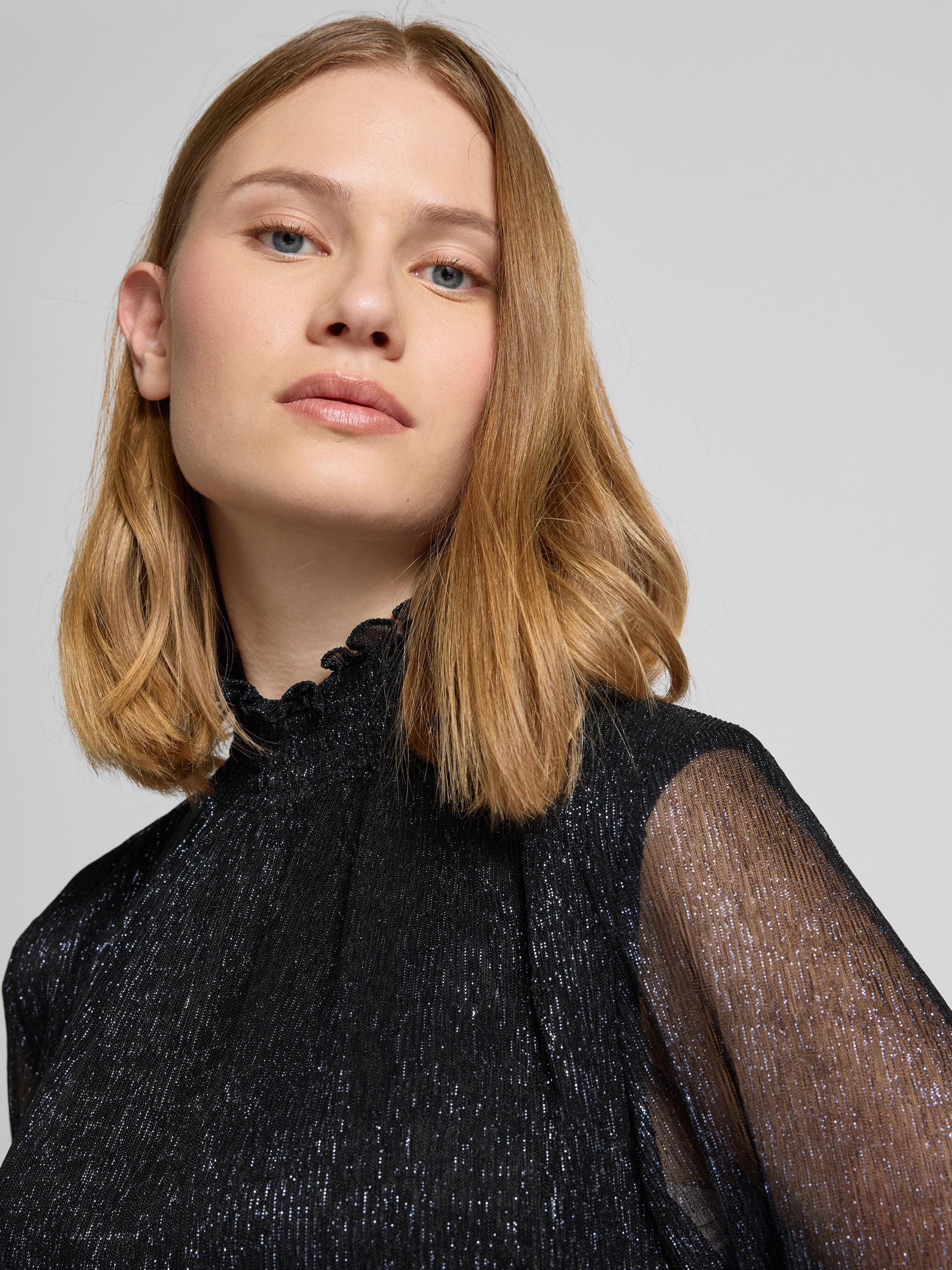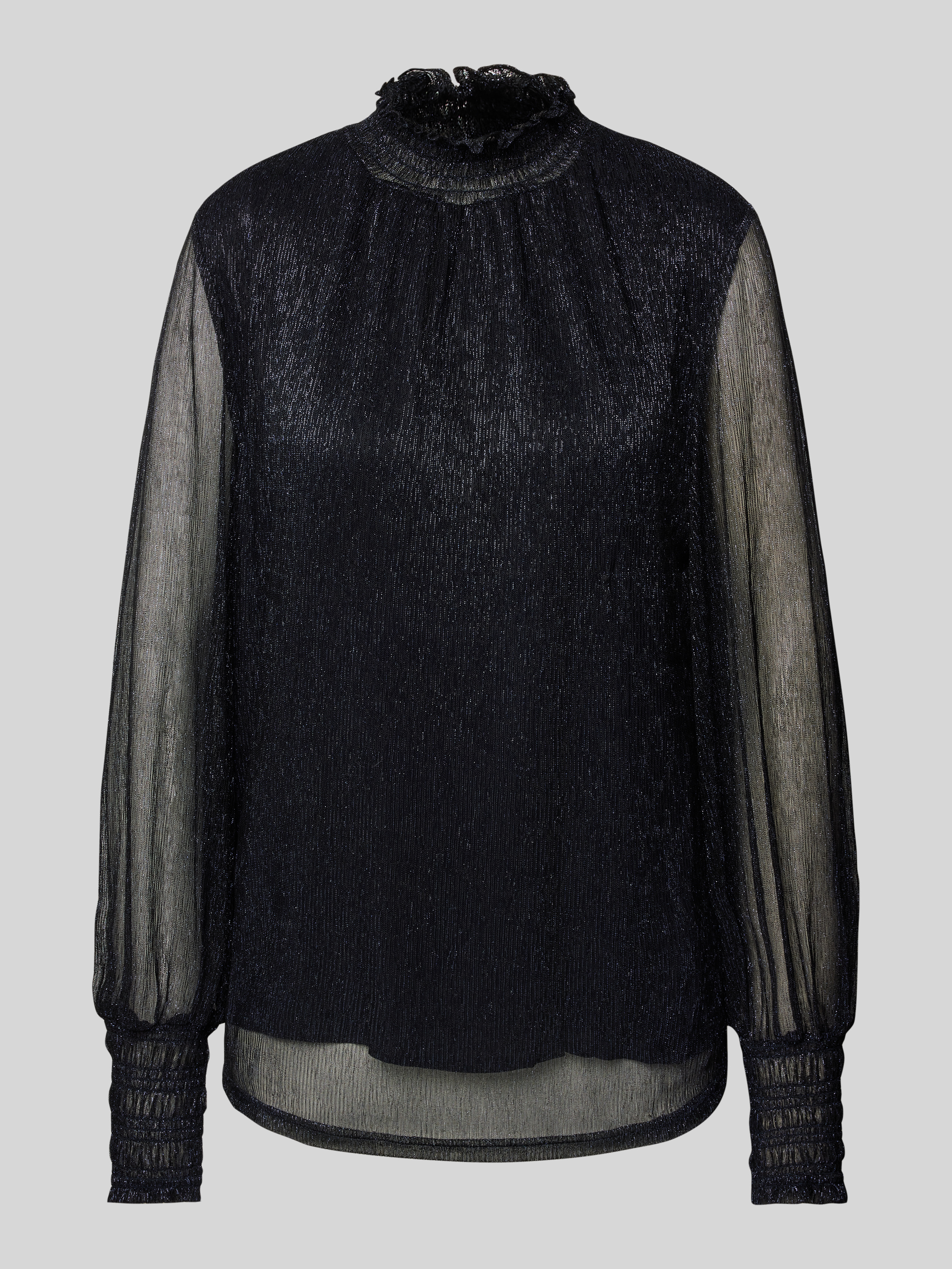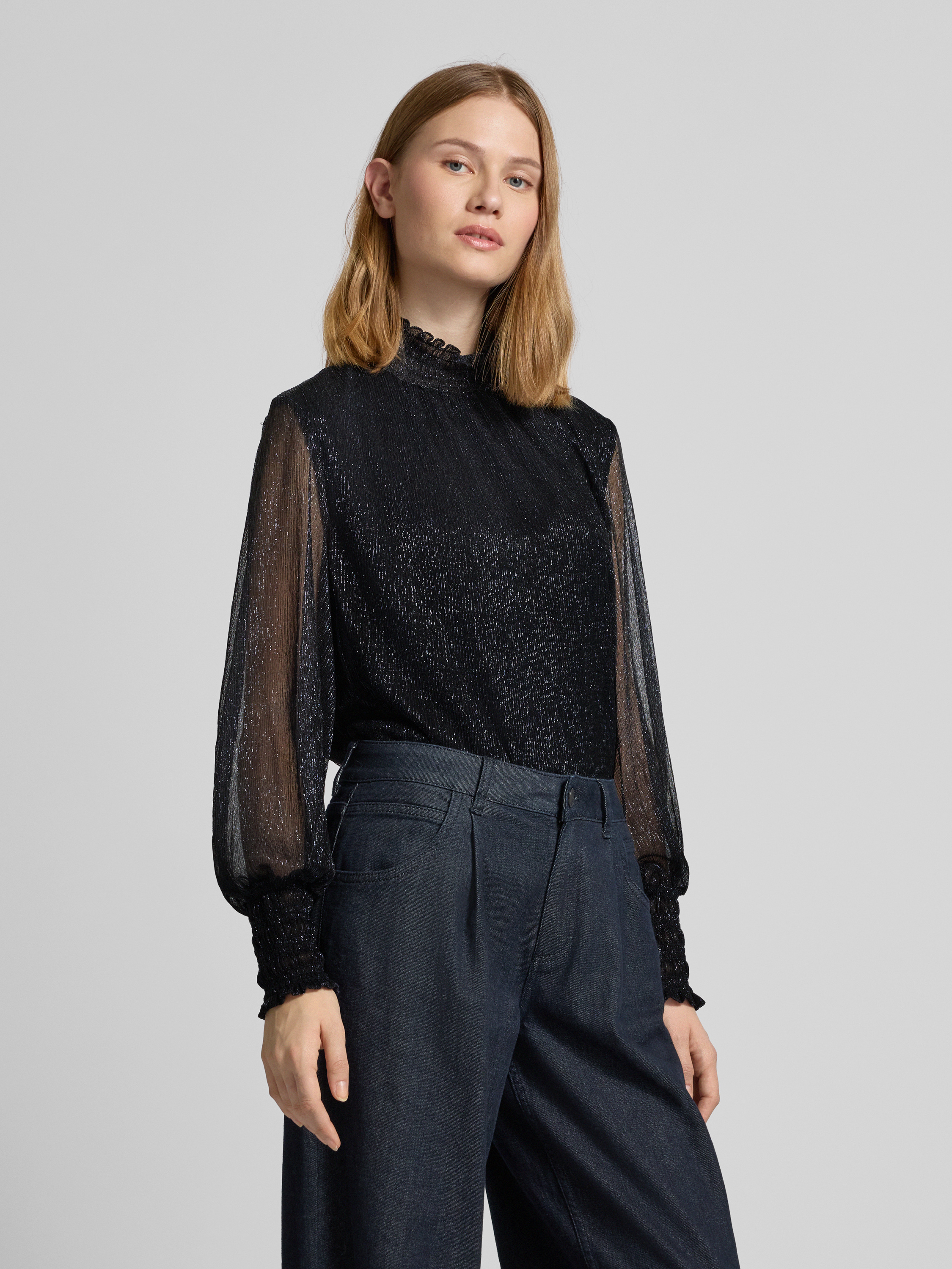 Die Bluse 'Ximena' von MOS MOSH kombiniert geschickt geraden Schnitt und feine Rüschungen, wodurch ein elegantes Erscheinungsbild entsteht. Durch den Stehkragen und semitransparente Partien erhält sie einen raffinierten Touch, während das blickdichte Unterteil für angenehmen Tragekomfort sorgt. Effektgarn verleiht zusätzliche Struktur und Lebendigkeit.