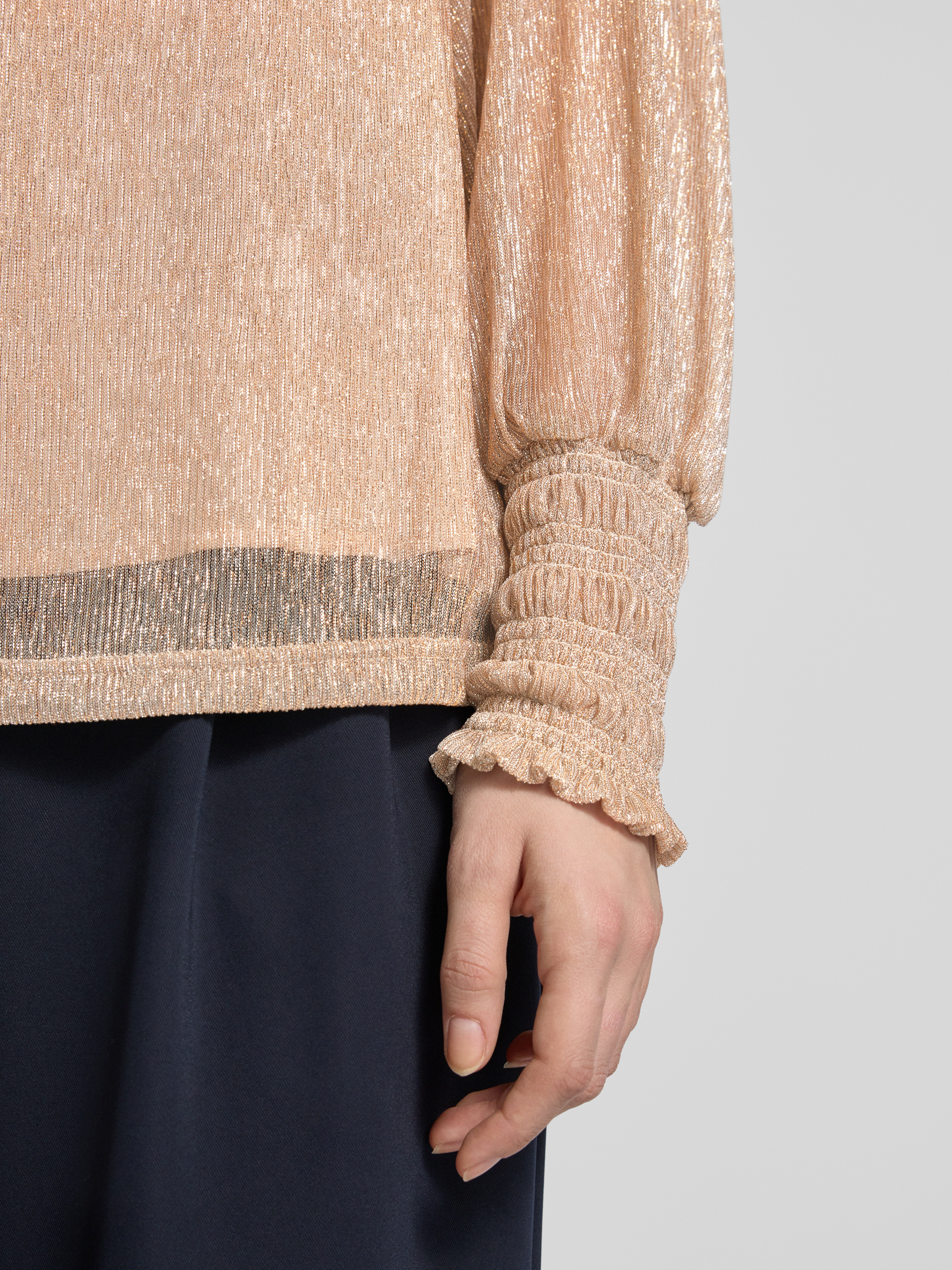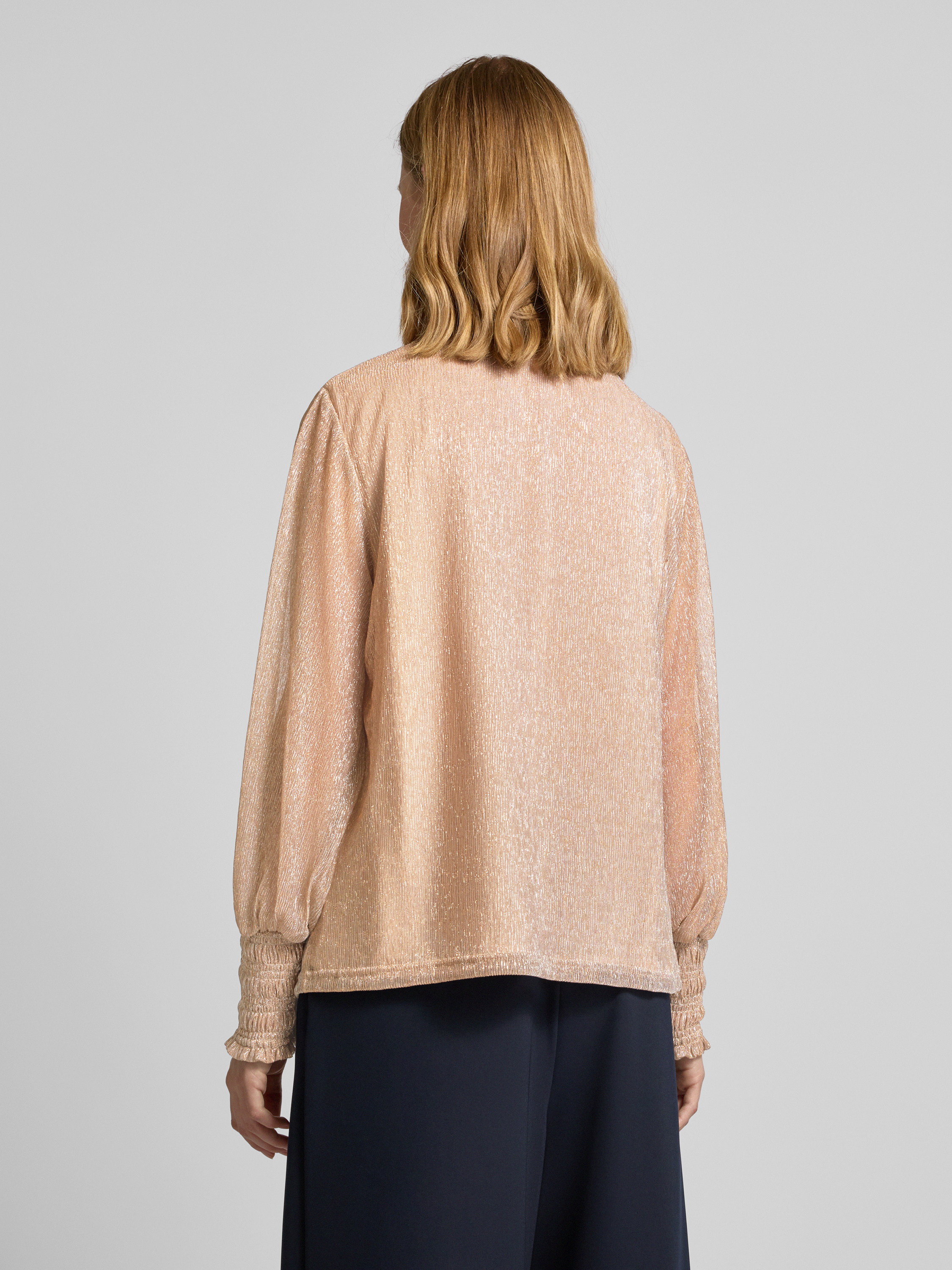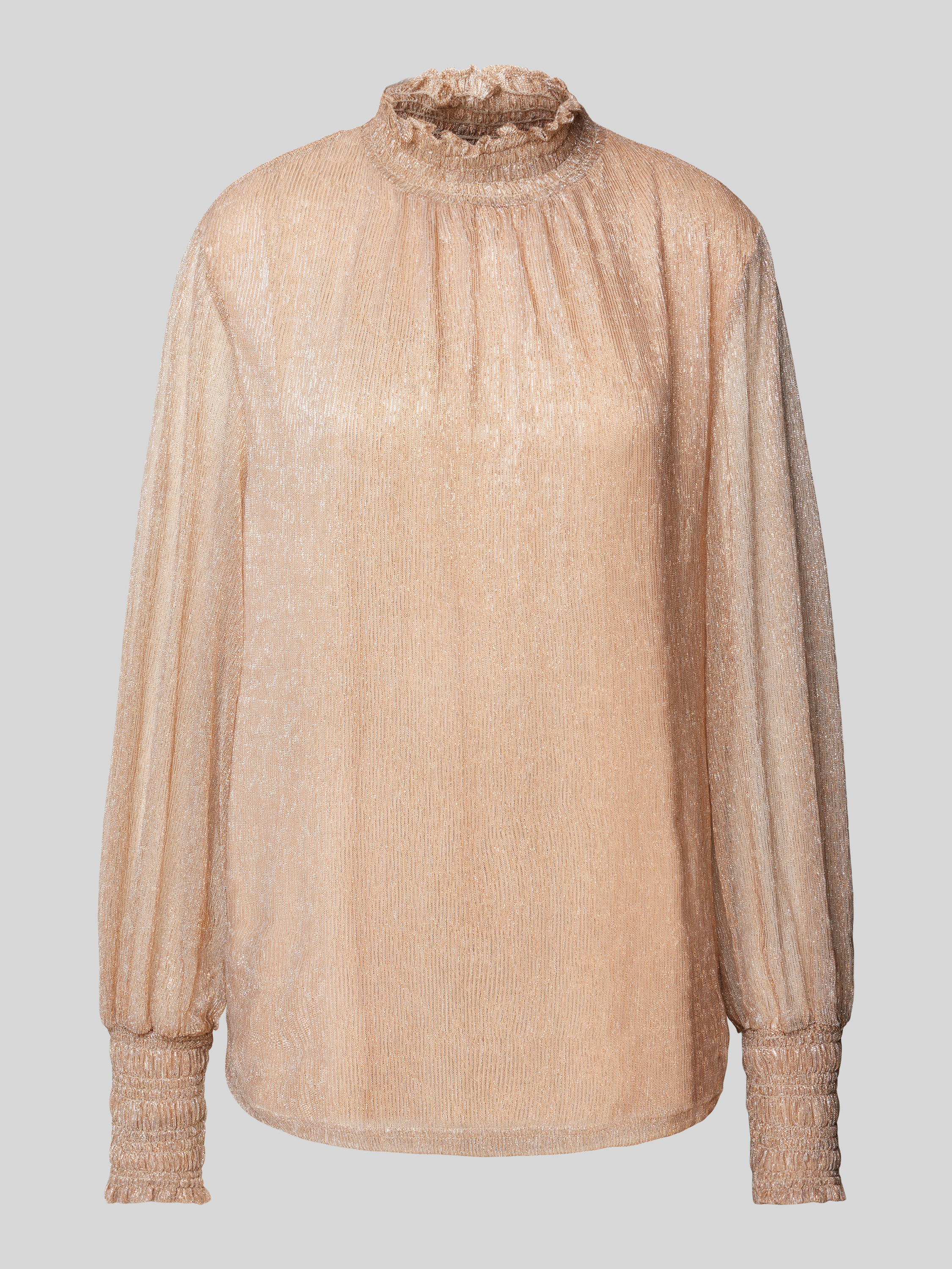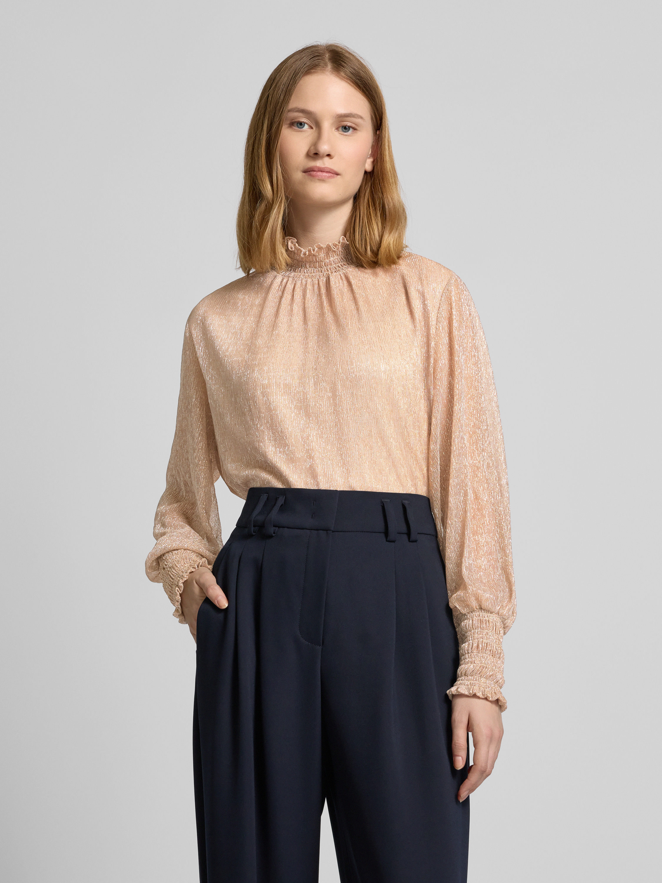Die Bluse 'Ximena' von MOS MOSH kombiniert geschickt geraden Schnitt und feine Rüschungen, wodurch ein elegantes Erscheinungsbild entsteht. Durch den Stehkragen und semitransparente Partien erhält sie einen raffinierten Touch, während das blickdichte Unterteil für angenehmen Tragekomfort sorgt. Effektgarn verleiht zusätzliche Struktur und Lebendigkeit.