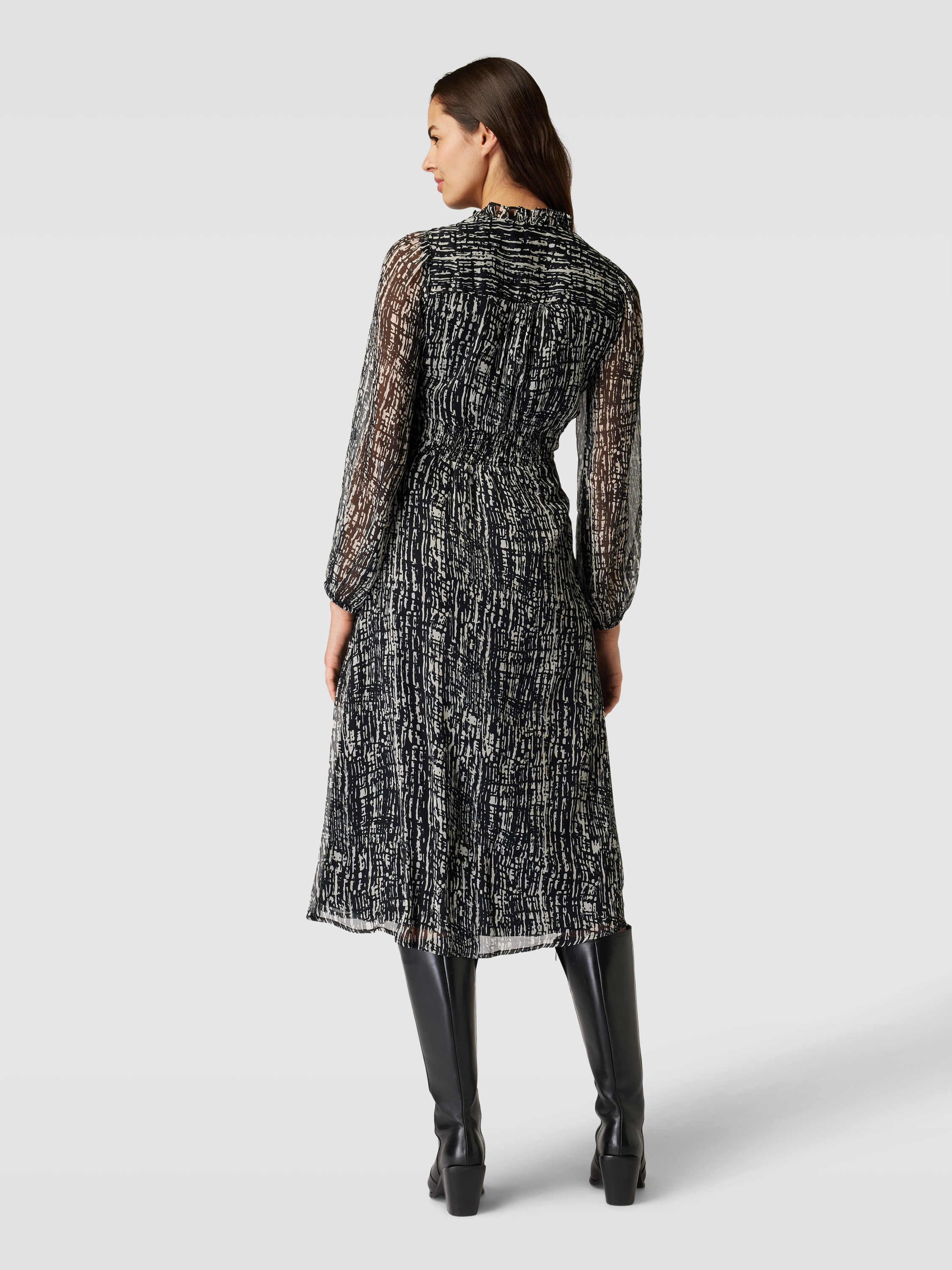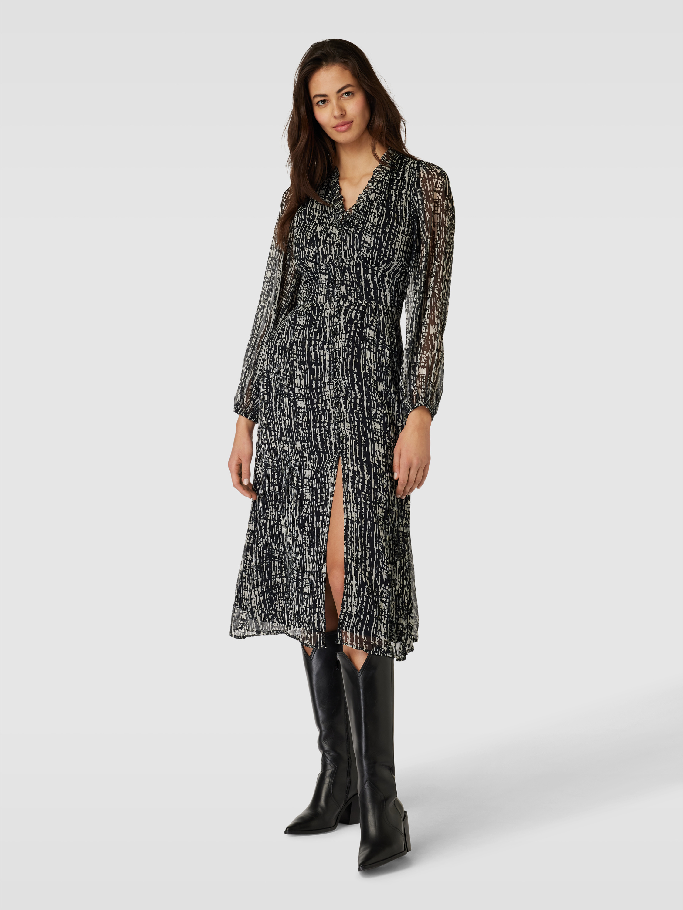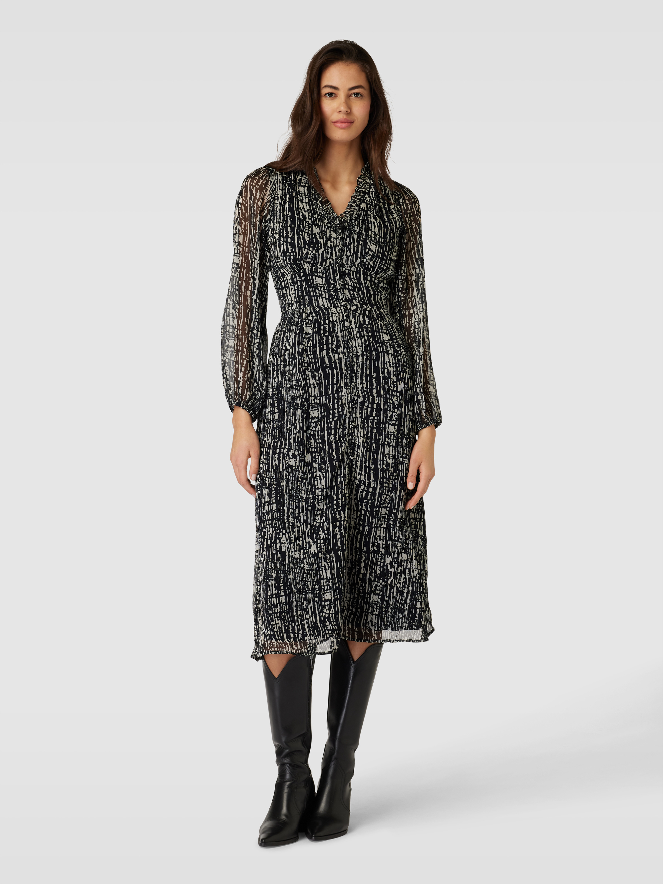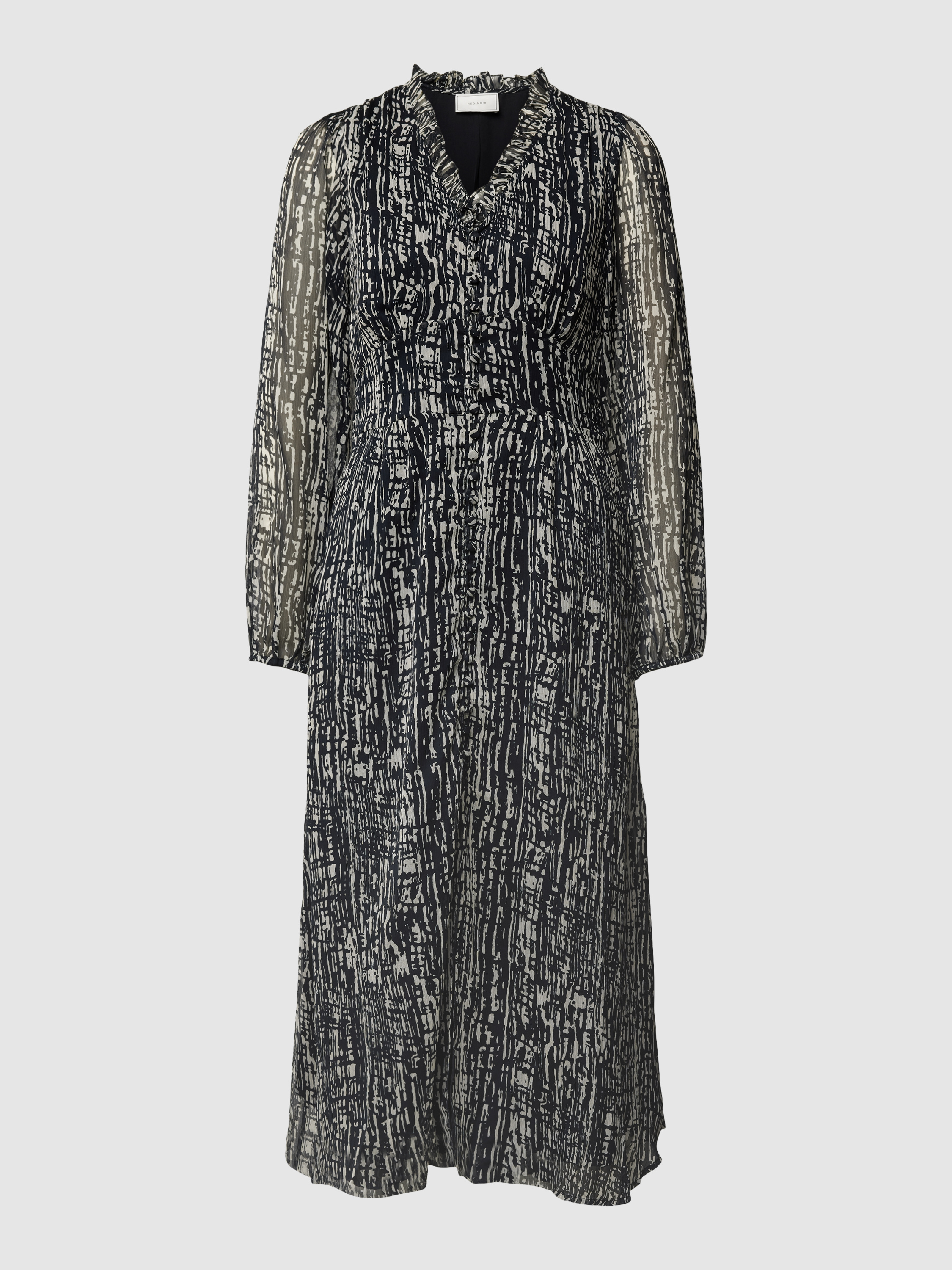 Das Blusenkleid 'NIMES' von Neo Noir vereint eleganten Chiffon mit einem femininen, taillierten Schnitt. Der V-Ausschnitt und die Puffärmel schaffen eine raffinierte Silhouette, während der ausgestellte Rockteil Bewegungsfreiheit bietet. Ideal für Anlässe, bei denen Stil und Komfort gefragt sind.