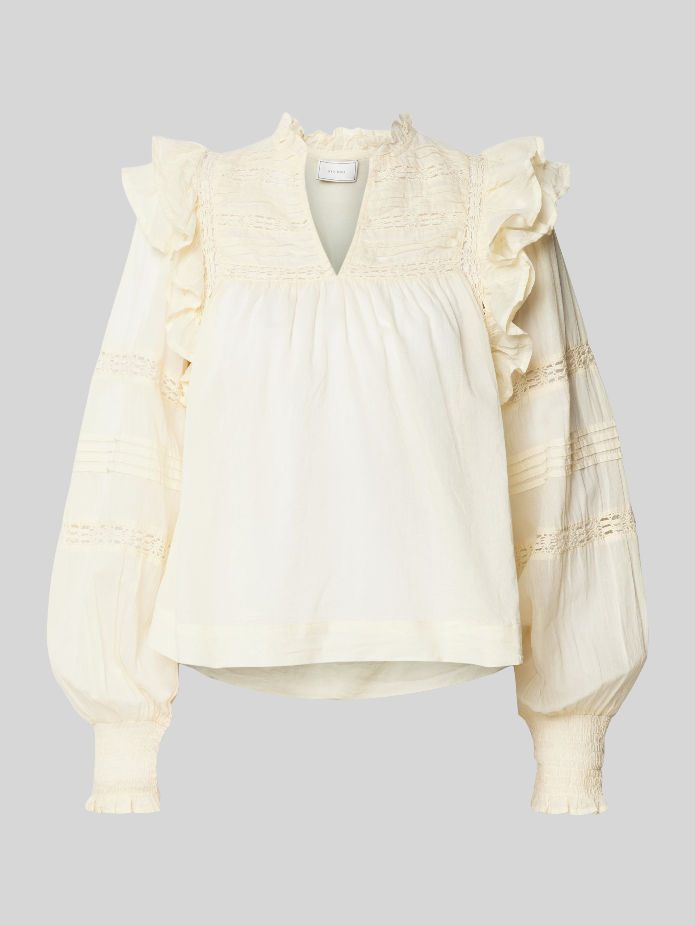 Die Regular Fit Bluse 'Mauri' von Neo Noir vereint elegante Häkelspitze mit der Leichtigkeit reiner Baumwolle. Der V-Ausschnitt und zarte Rüschen setzen stilvolle Akzente, während der bequeme Schnitt für ein angenehmes Tragegefühl sorgt. Ein vielseitiges Kleidungsstück für diverse Anlässe.