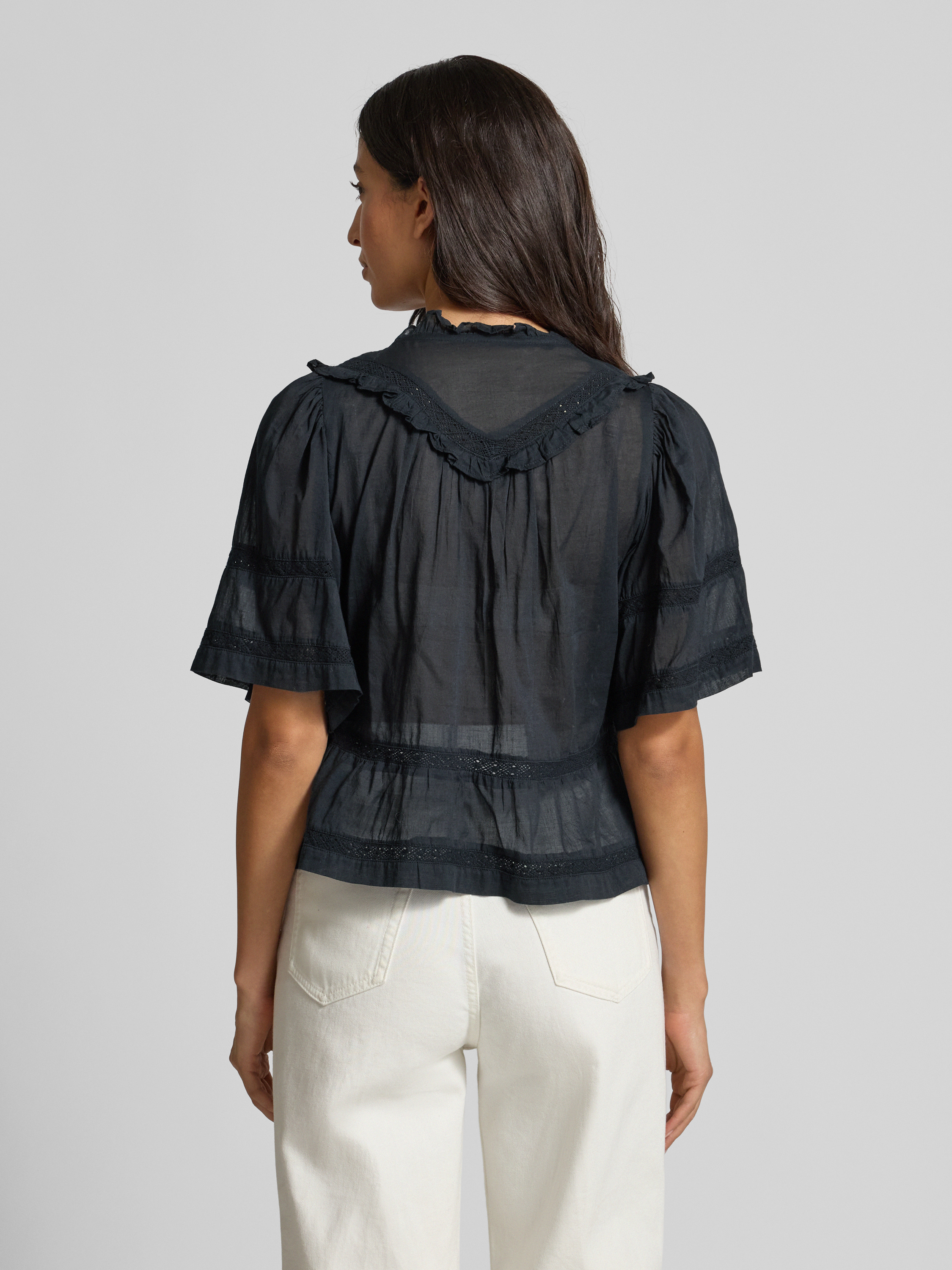 Die Regular Fit Bluse mit V-Ausschnitt Modell 'Evienne' von Neo Noir kombiniert reine Baumwolle mit einer lockeren Passform, wodurch sie angenehm auf der Haut liegt. Feine Rüschen und Häkelspitze setzen verspielte Akzente, während der V-Ausschnitt den Look auflockert. So lässt sich der Alltag mühelos stilvoll gestalten.