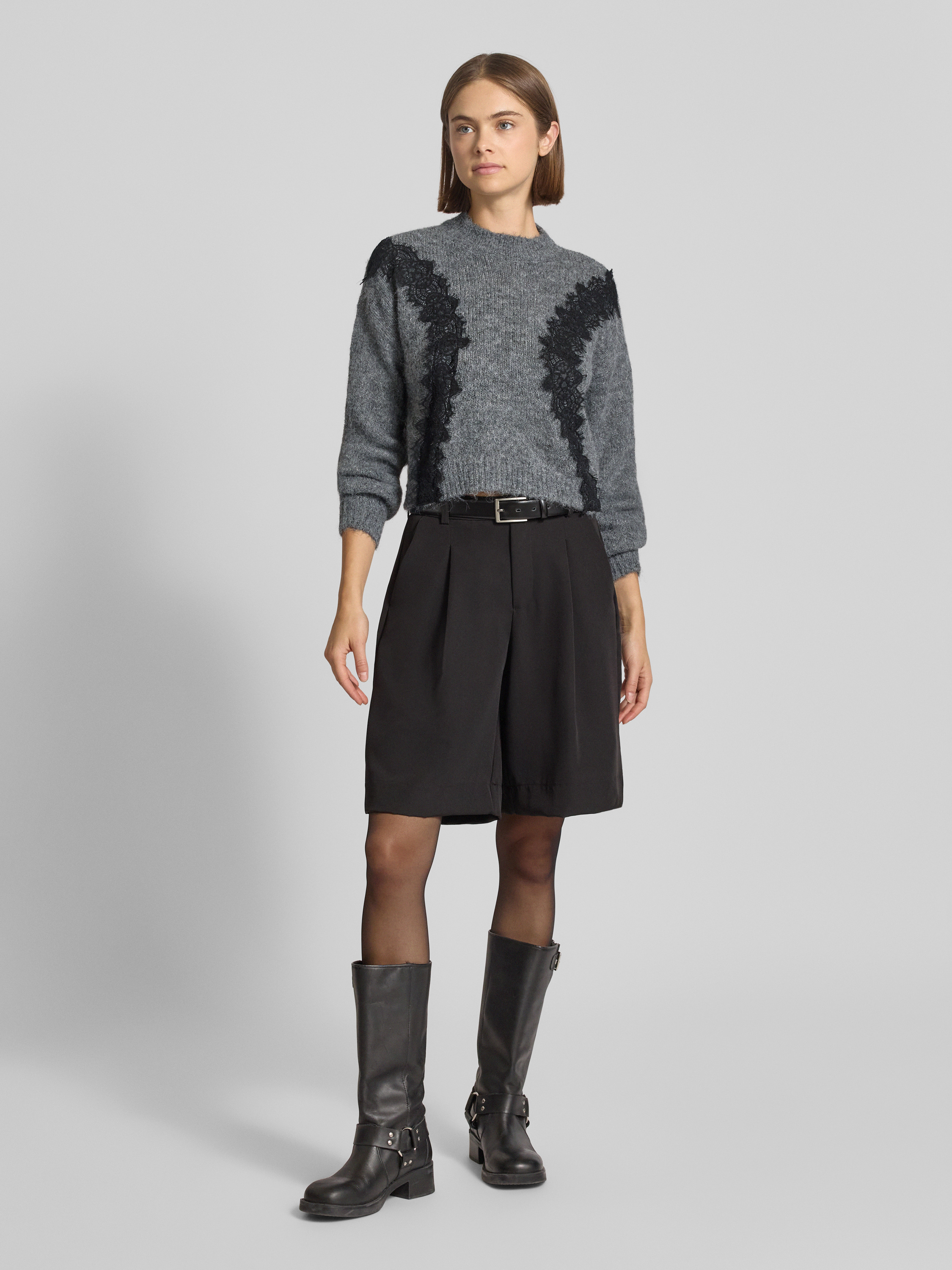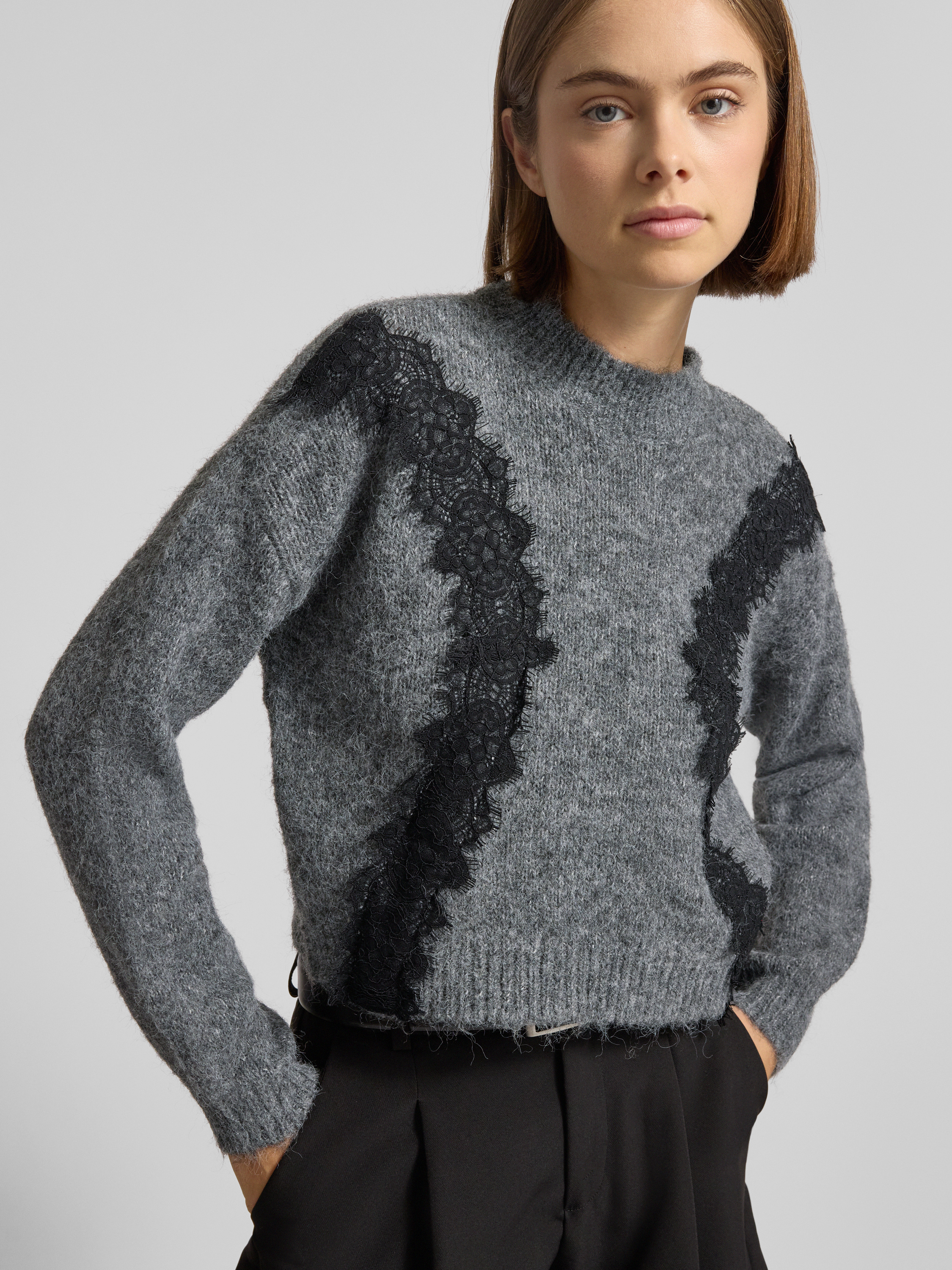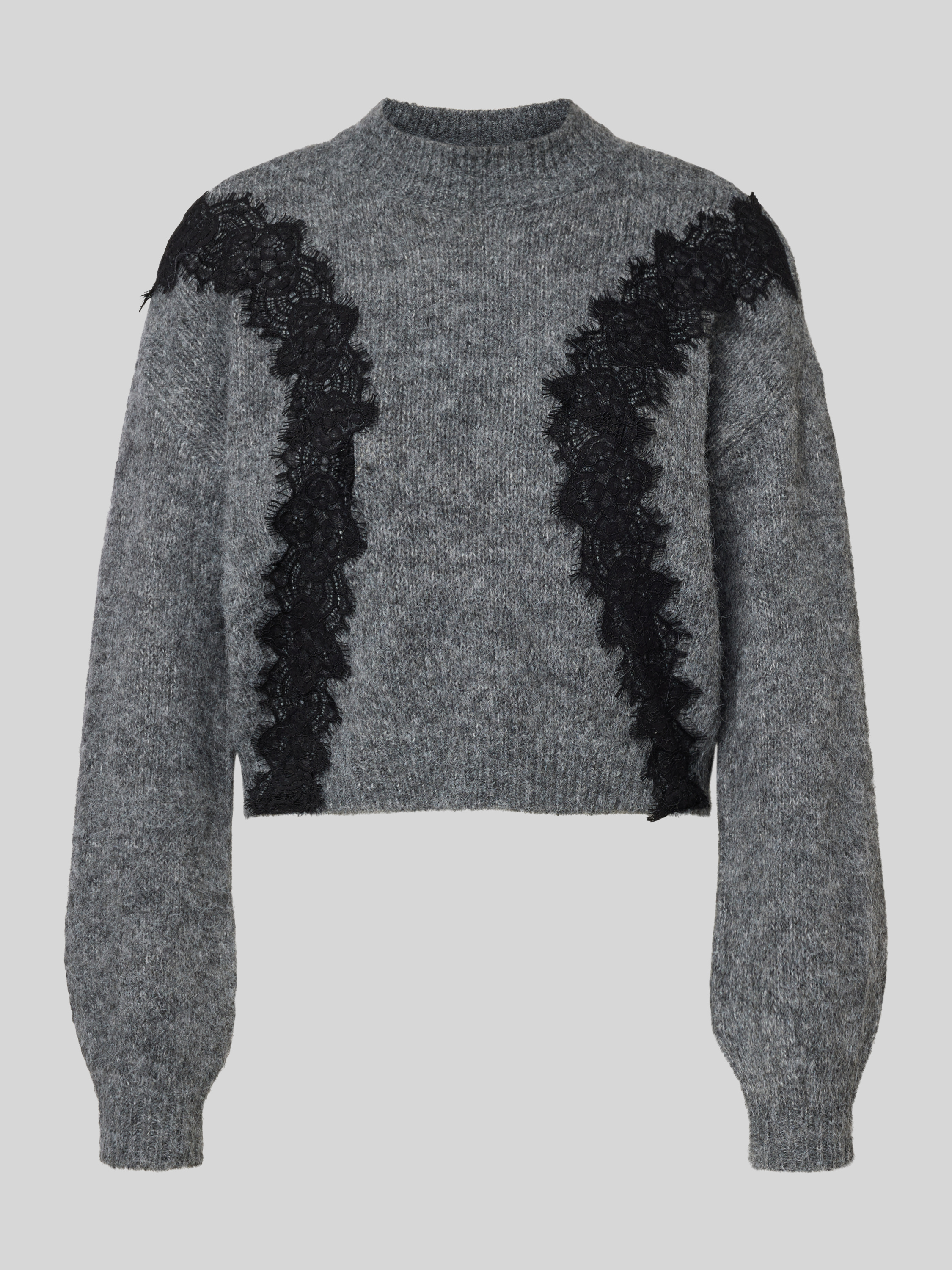 Noisy MayCropped Strickpullover mit Spitzenbesatz Modell 'SUTTON' in mittelgrau melange