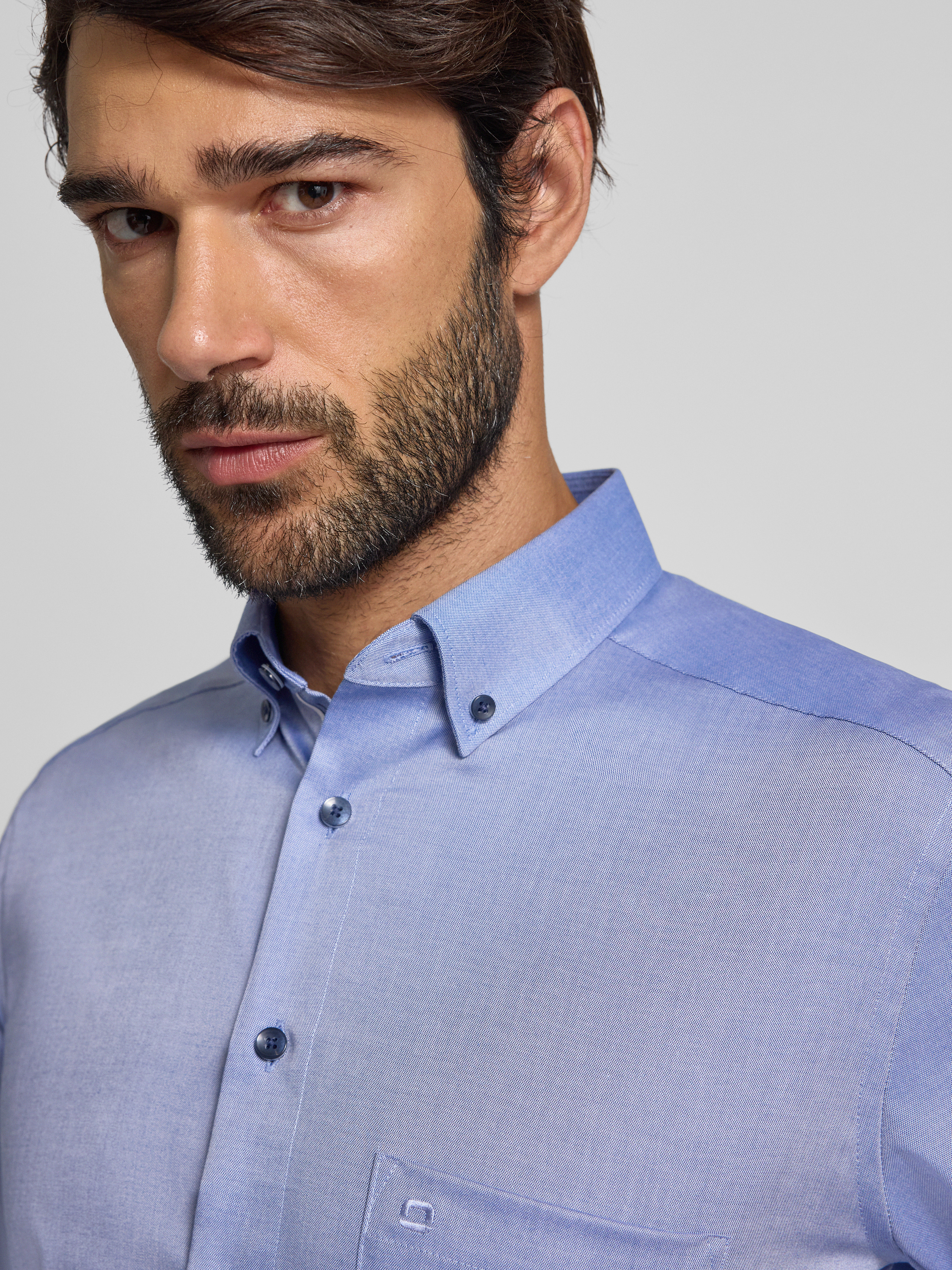 Das Herrenhemd Modern Fit von OLYMP verbindet eine körpernahe Passform mit einem Button-Down-Kragen, der dem Business-Look eine dezente Note verleiht. Reine Baumwolle sorgt für angenehmen Tragekomfort im Alltag. Die Brusttasche unterstreicht die praktische Ausrichtung dieses Modells.
