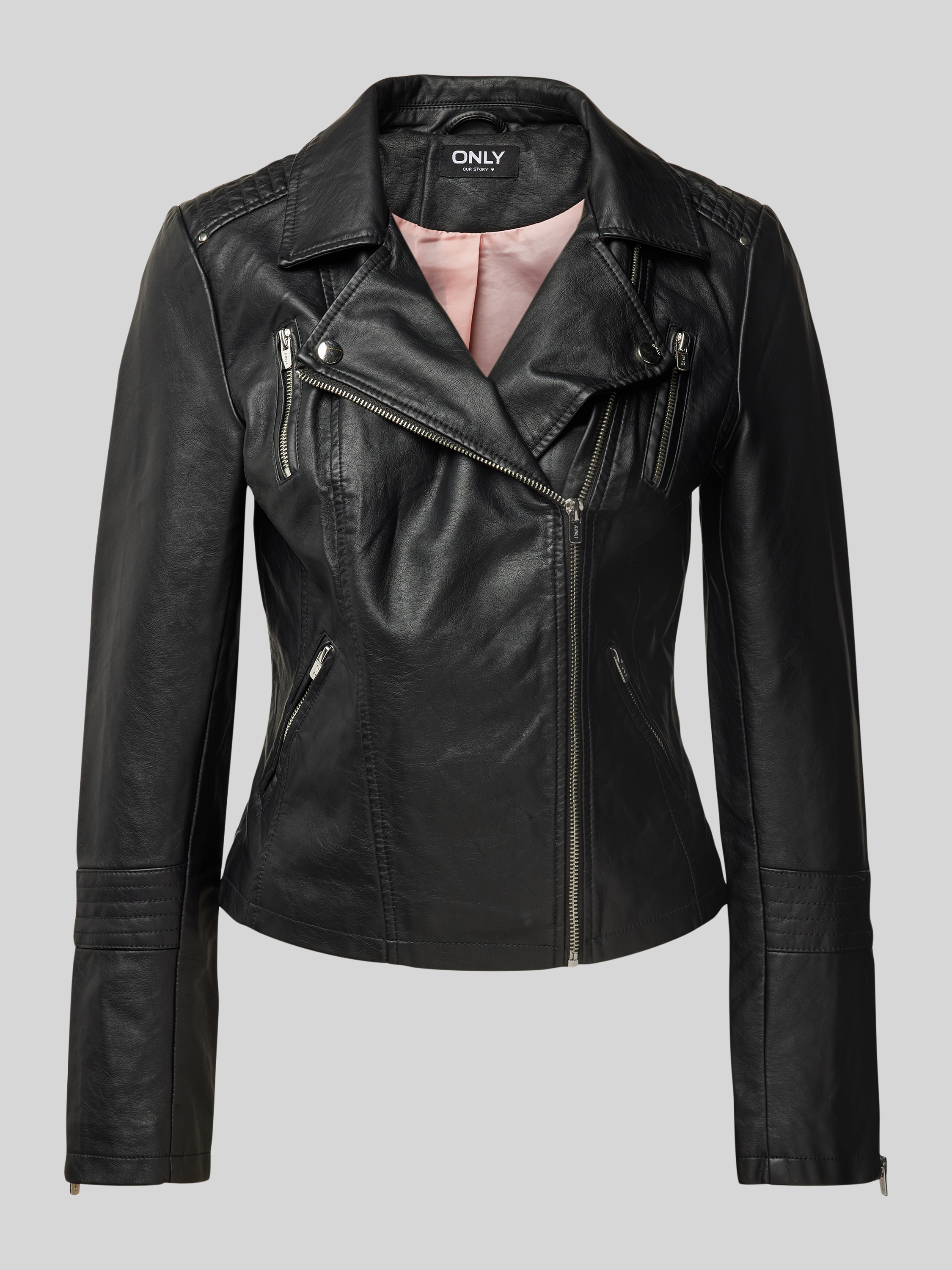 Die Bikerjacke von ONLY, Modell 'Gemma', besticht durch ihre raffinierte Leder-Optik und den taillierten Schnitt, der eine feminine Silhouette unterstreicht. Der variable Reverskragen ermöglicht vielseitige Styling-Optionen. Dank der Viskosemischung fühlt sich die Jacke angenehm leicht an.