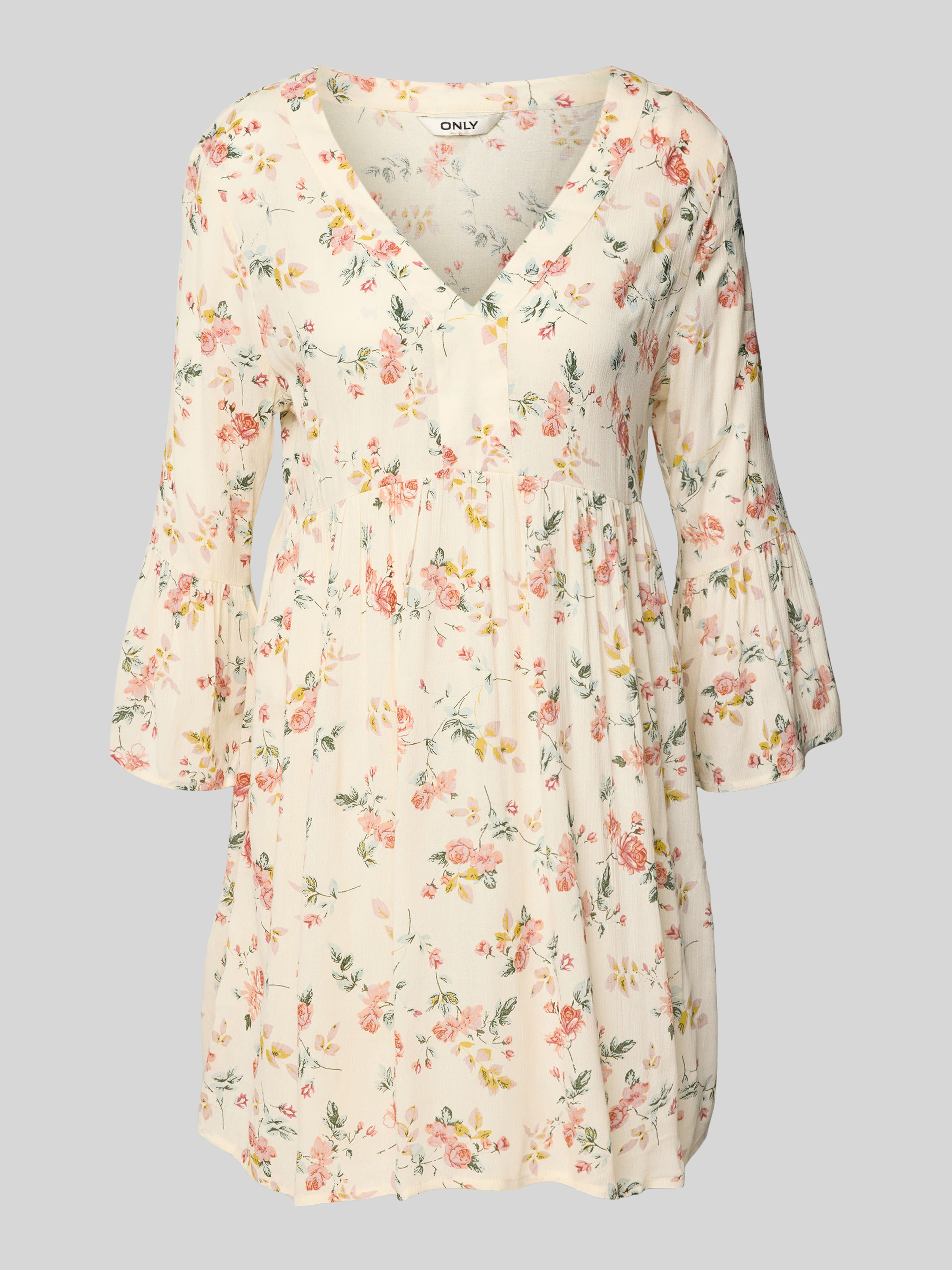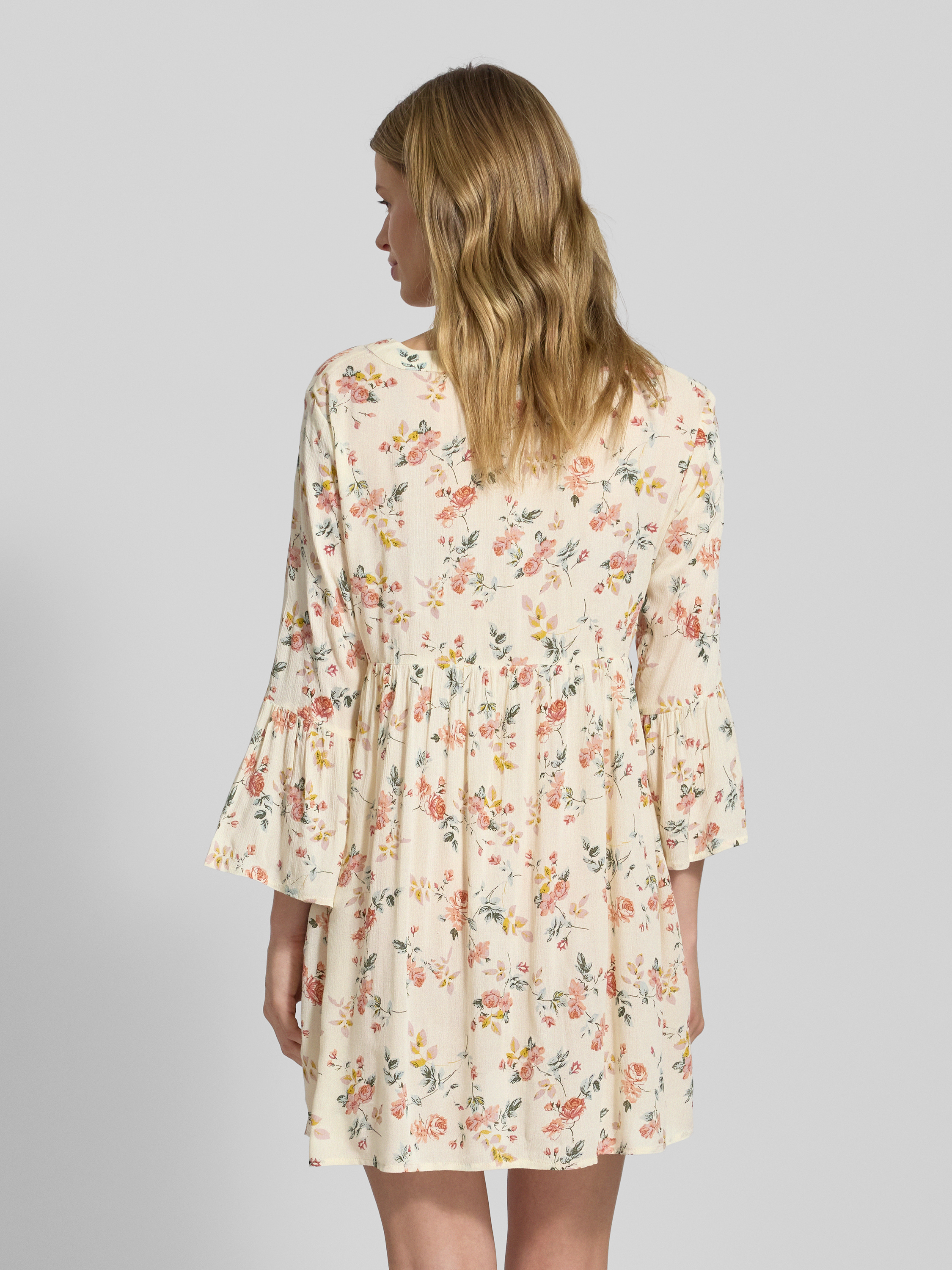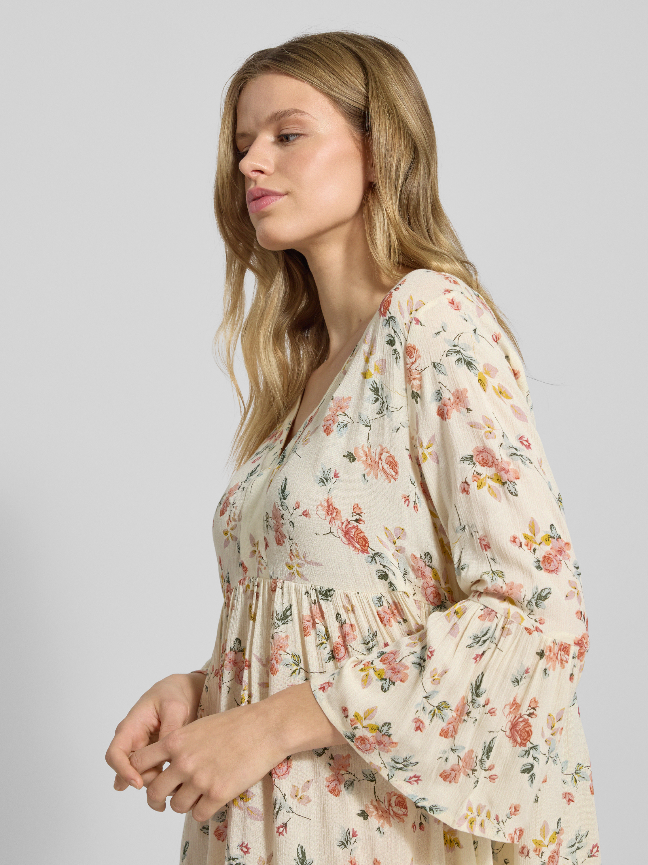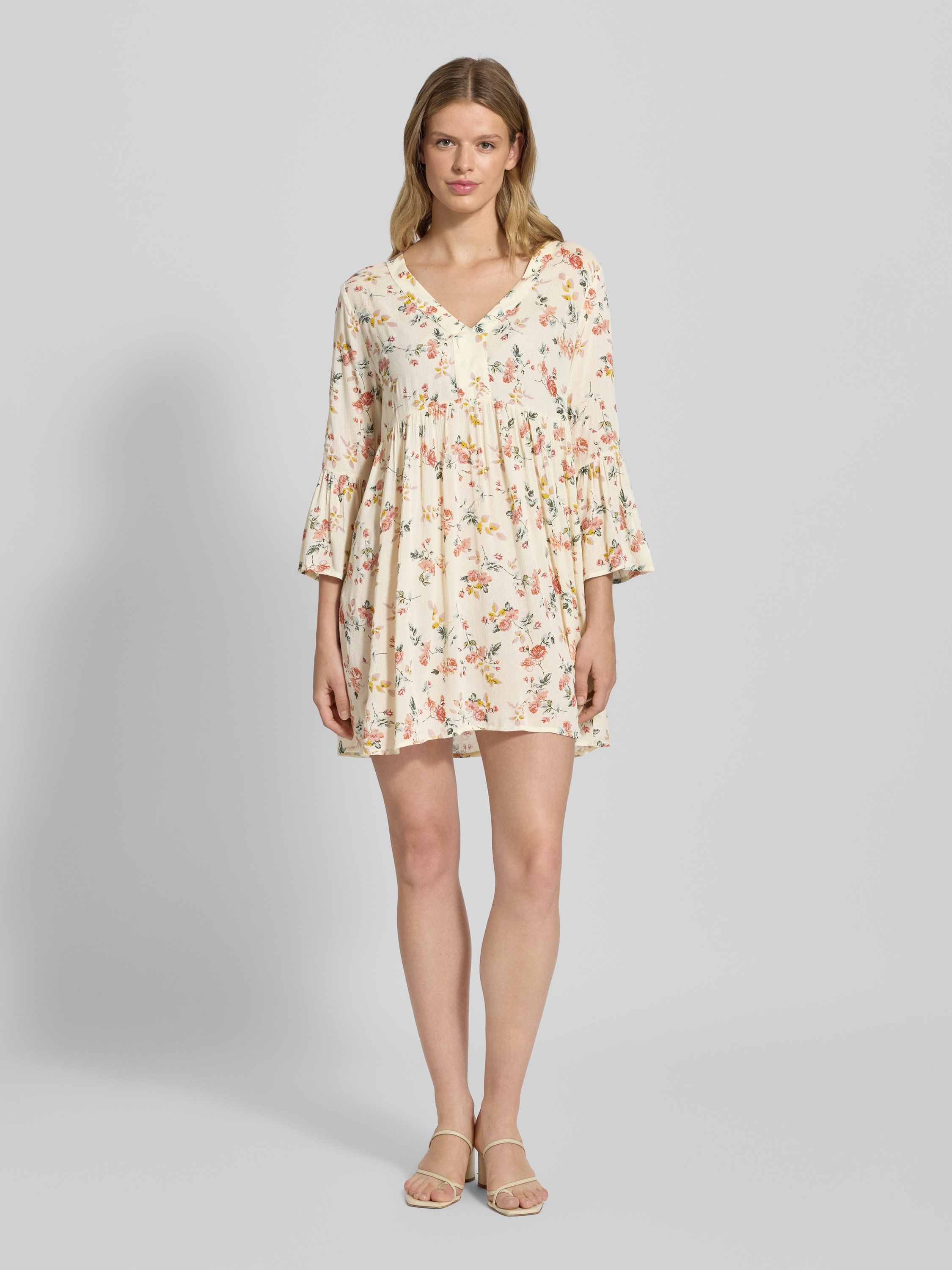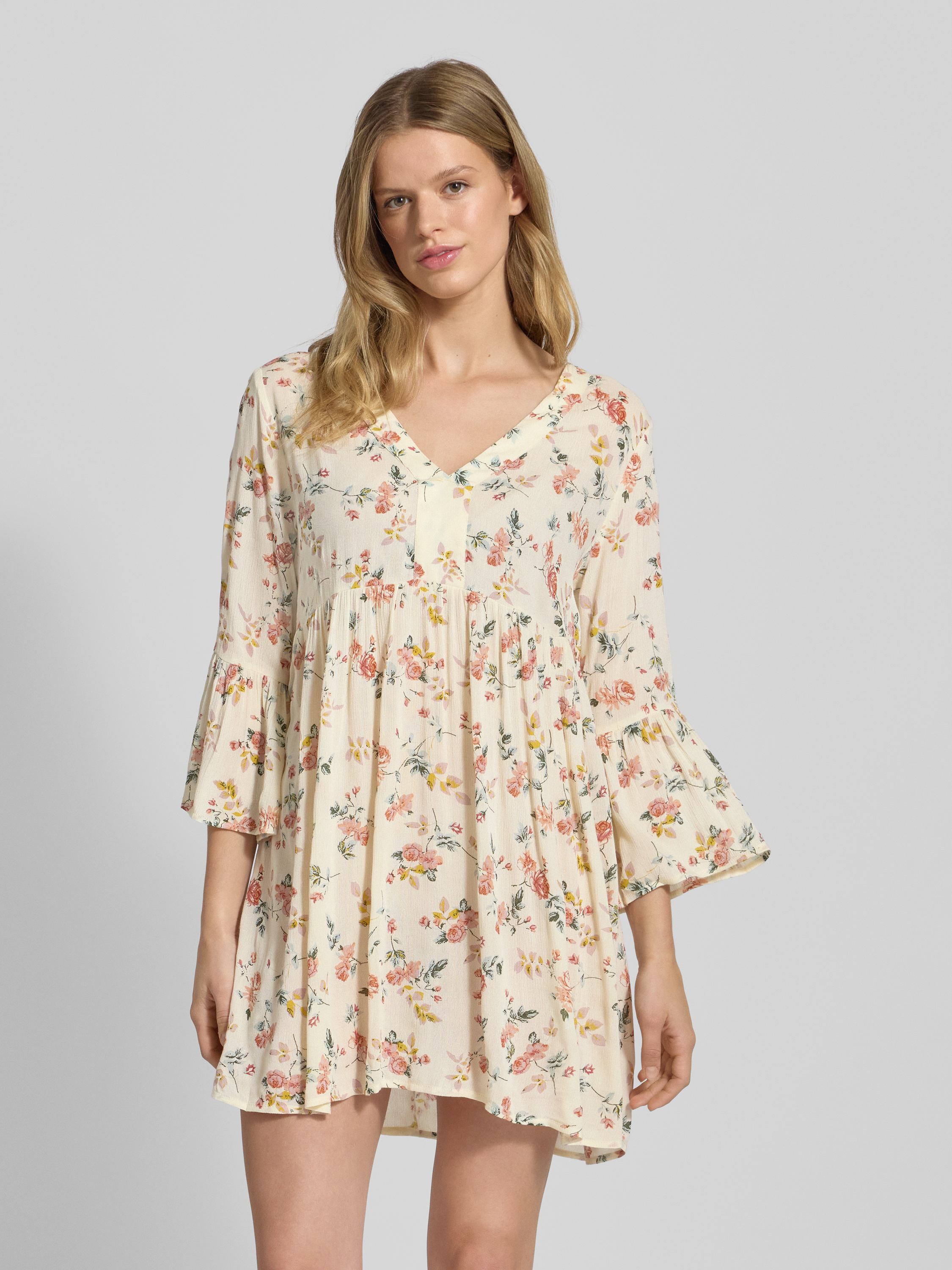 Das Damen Tunikakleid von Only, Modell Vickey, legt sich in leichter Viskose locker um die Figur und schafft angenehme Bewegungsfreiheit. Das florale Allover-Muster und der V-Ausschnitt verleihen dem Kleid eine lebendige Ausstrahlung. 3/4-Ärmel mit Volant setzen einen dezenten Akzent.