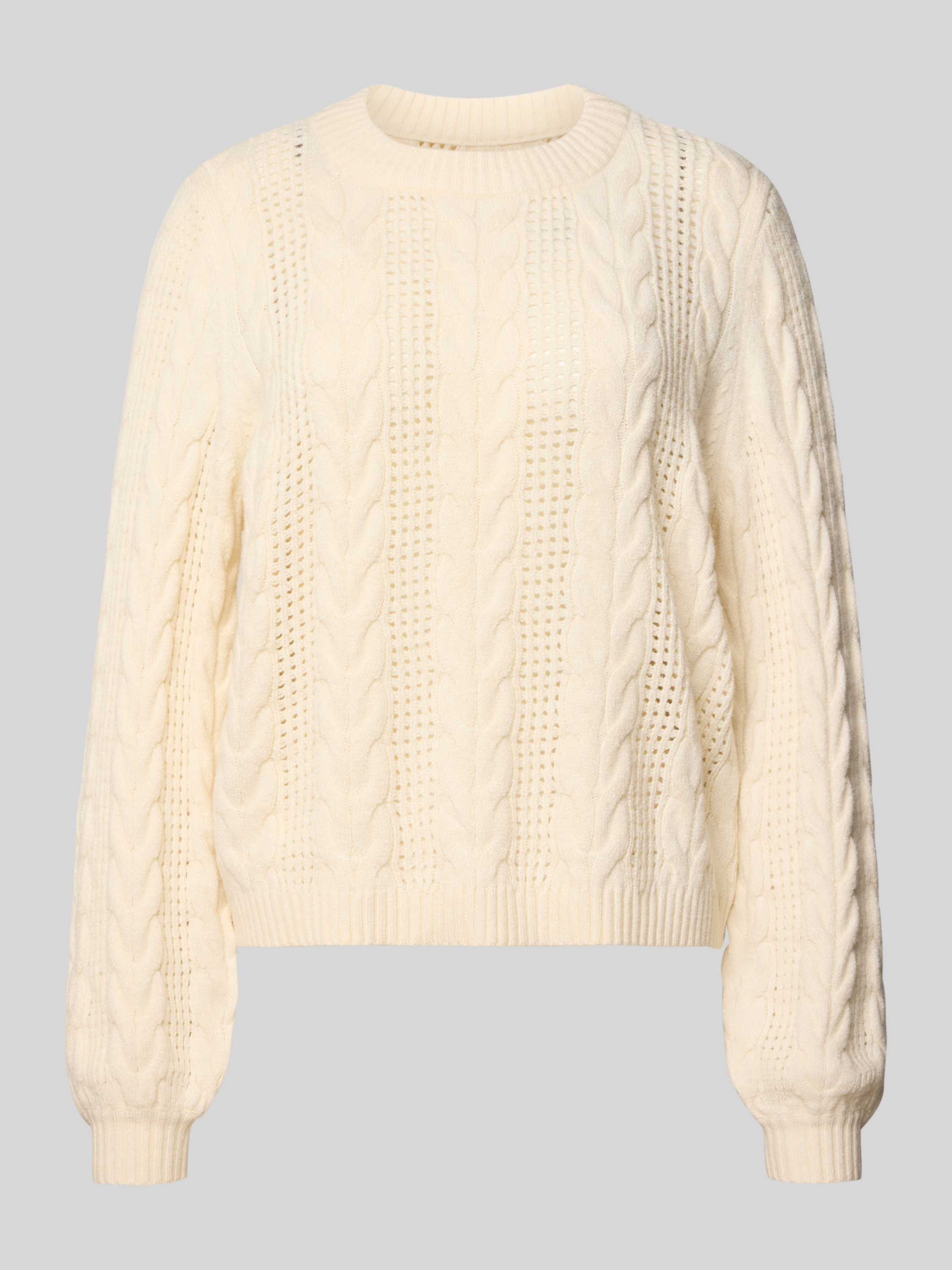 Der Damenpullover von Only, Modell Rubina, kombiniert Regular Fit mit einem Zopfmuster und feinem Lochstrick. Dank Ballonärmeln und Crew Neck entsteht ein lockerer, moderner Eindruck, der vielseitig tragbar bleibt. Durch den soften Viskose-Mix fühlt sich das Strickteil angenehm leicht auf der Haut an.
