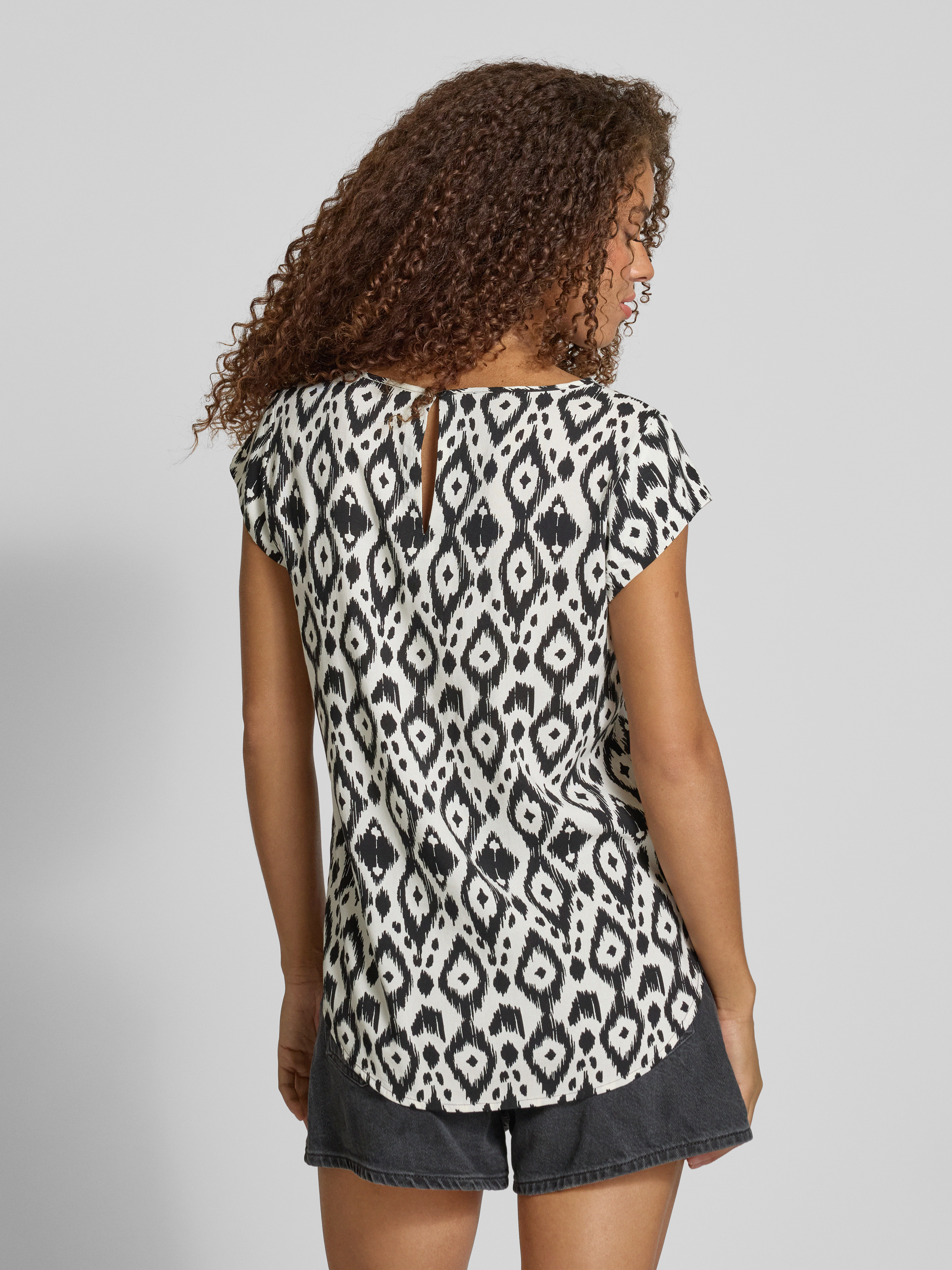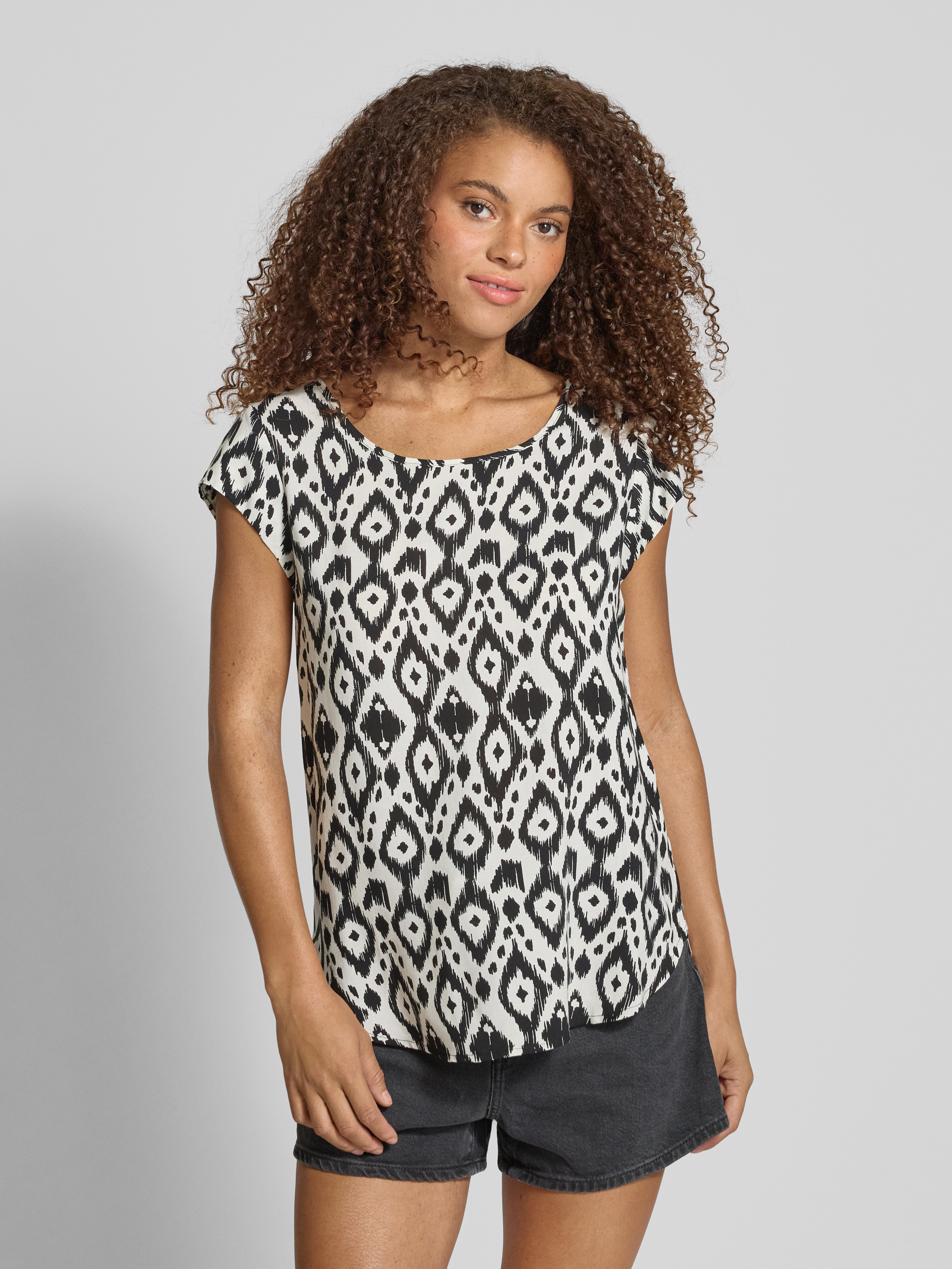 Das Damen Blusenshirt von Only, Modell Nova, zeigt sich in Regular-Fit und bringt durch das Allover-Muster frischen Schwung in den Alltag. Die feine Webstruktur aus reiner Viskose sorgt für ein angenehmes Tragegefühl, während der Schlüsselloch Rückenausschnitt einen dezenten Akzent setzt. Mit seinem kurzen Arm und dem klassischen Rundhals-Ausschnitt eignet sich das T-Shirt für viele Gelegenheiten und lässt sich unkompliziert kombinieren.