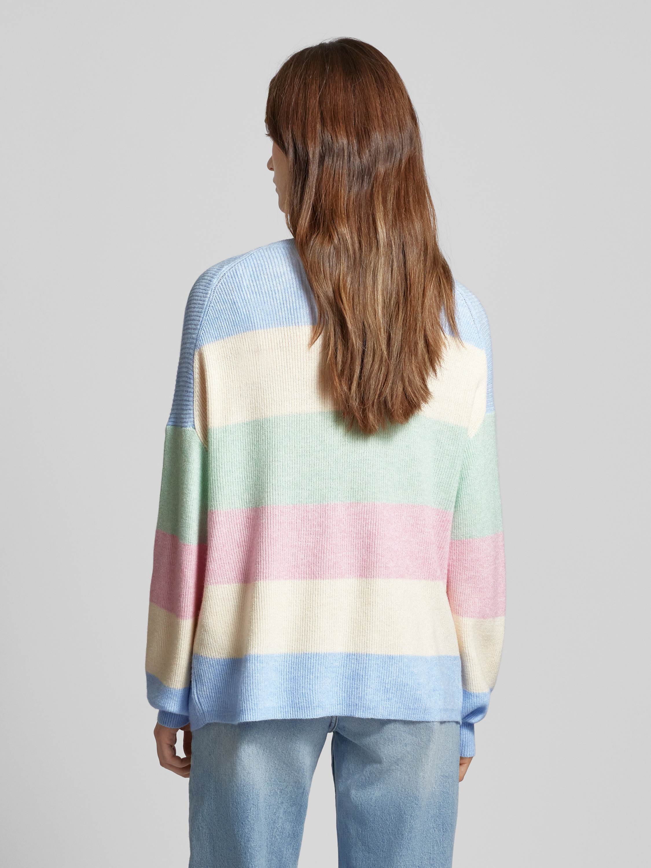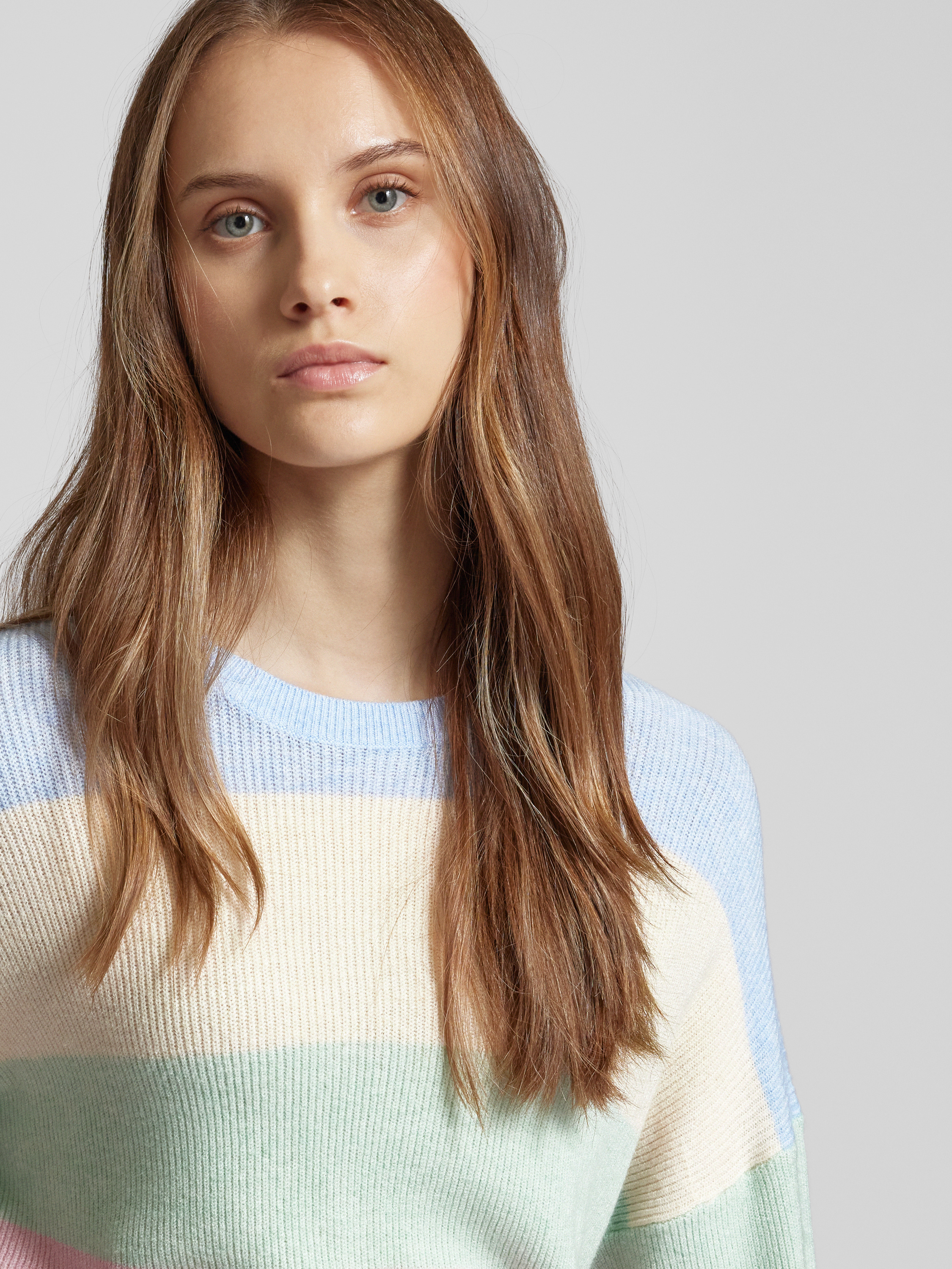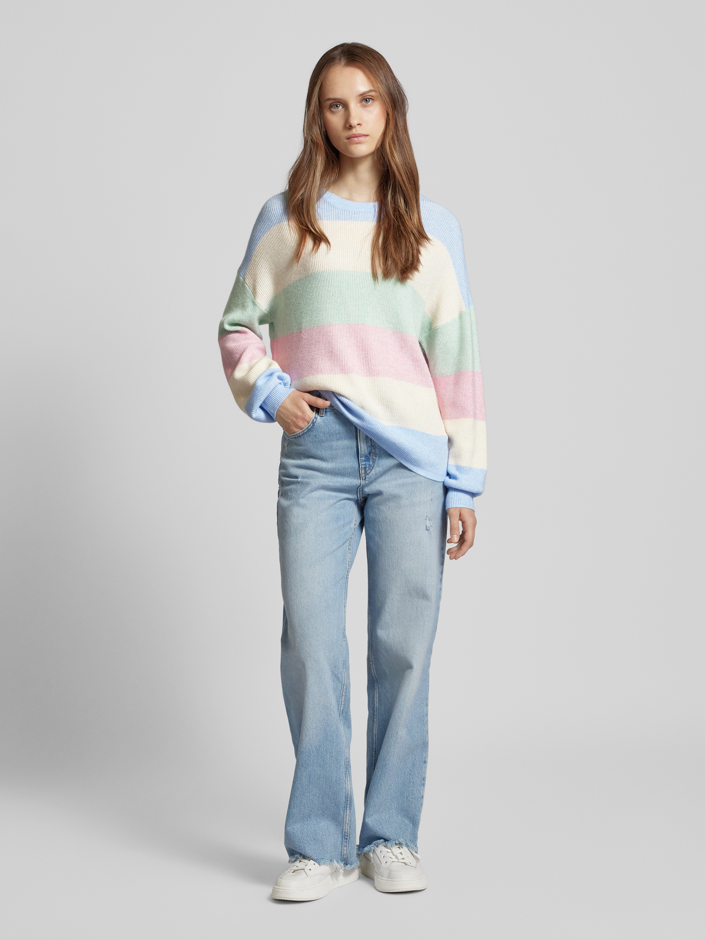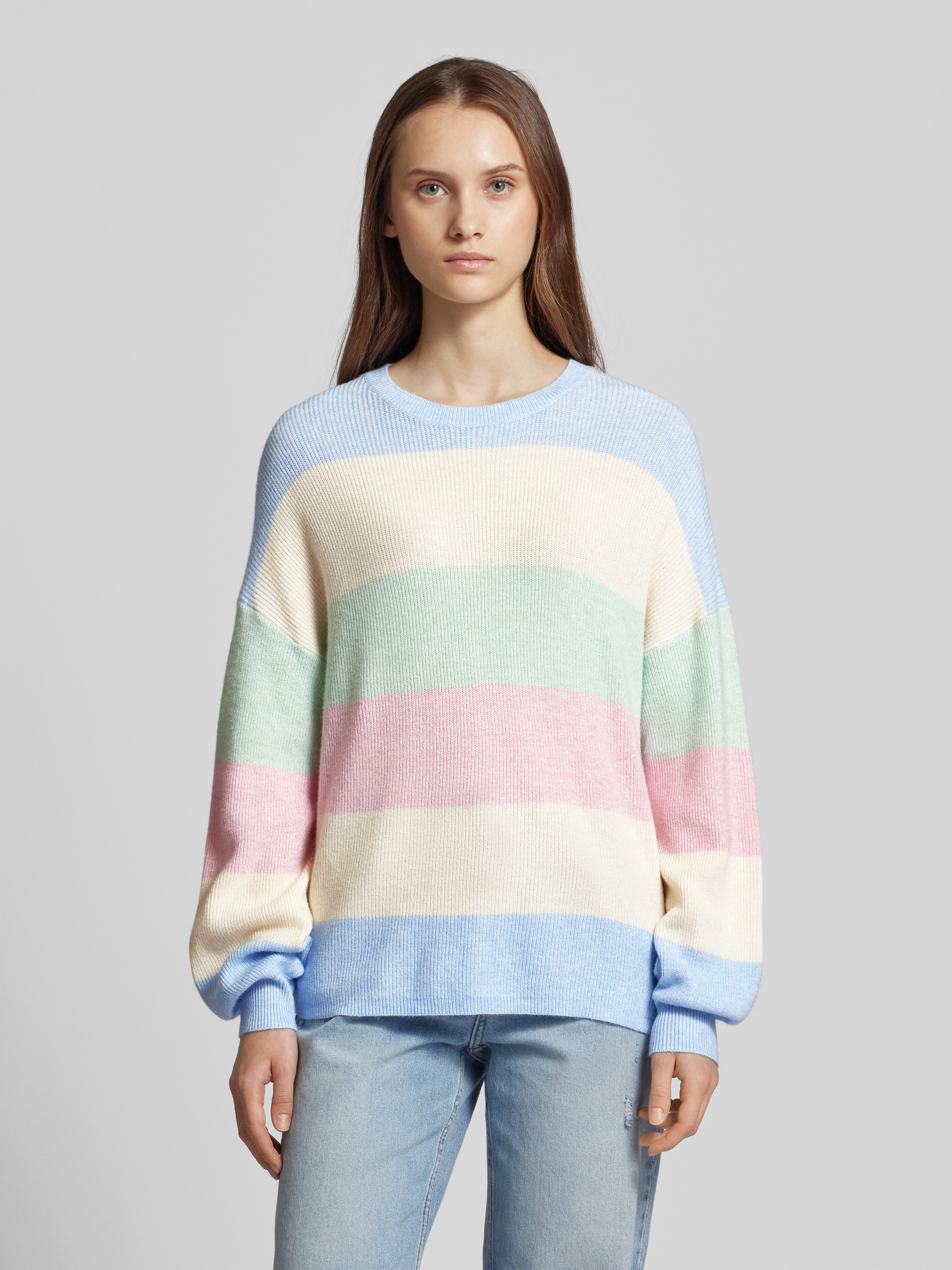 Der Damen Strickpullover von Only, Modell 'Atia', beeindruckt mit seiner entspannten Passform und den modischen Ballonärmeln. Das gestreifte Allover-Muster und die überschnittenen Schultern schaffen eine lässige Optik. Der Viskose-Mix sorgt für ein angenehmes Tragegefühl.