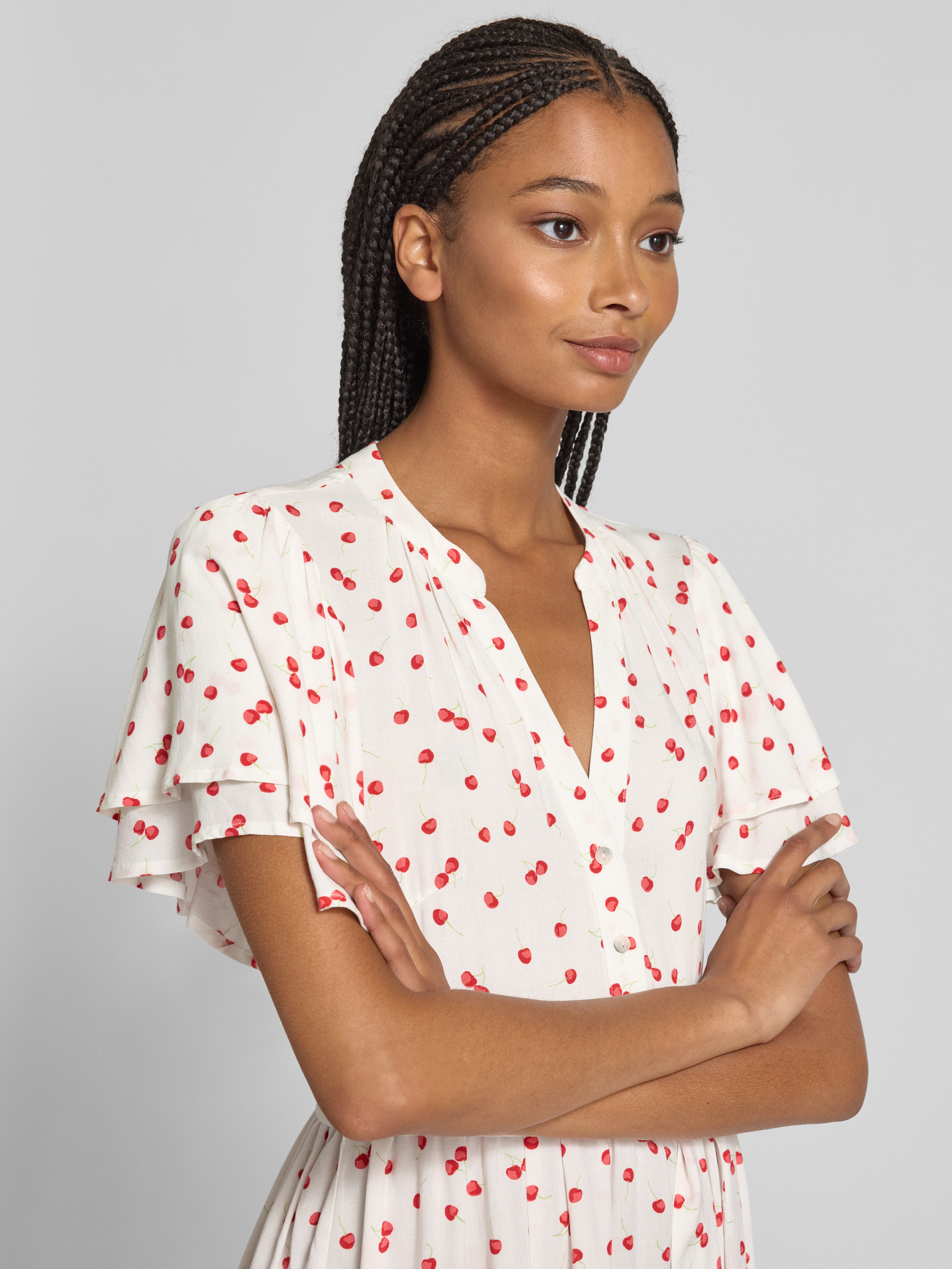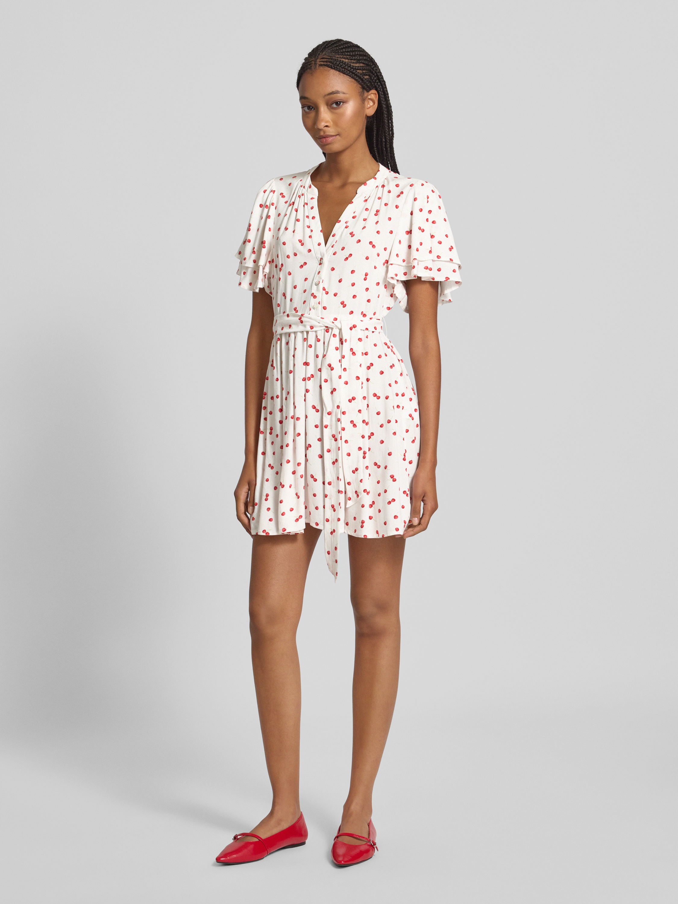 Das taillierte Minikleid 'Nova' von Only kombiniert ein lebendiges Allover-Muster mit einem schmeichelhaften V-Ausschnitt und doppellagigen Volantärmeln. Die feine Webstruktur aus reiner Viskose sorgt für ein angenehmes Tragegefühl, während der Bindegürtel die Silhouette elegant betont. Ideal für besondere Anlässe oder entspannte Tage.