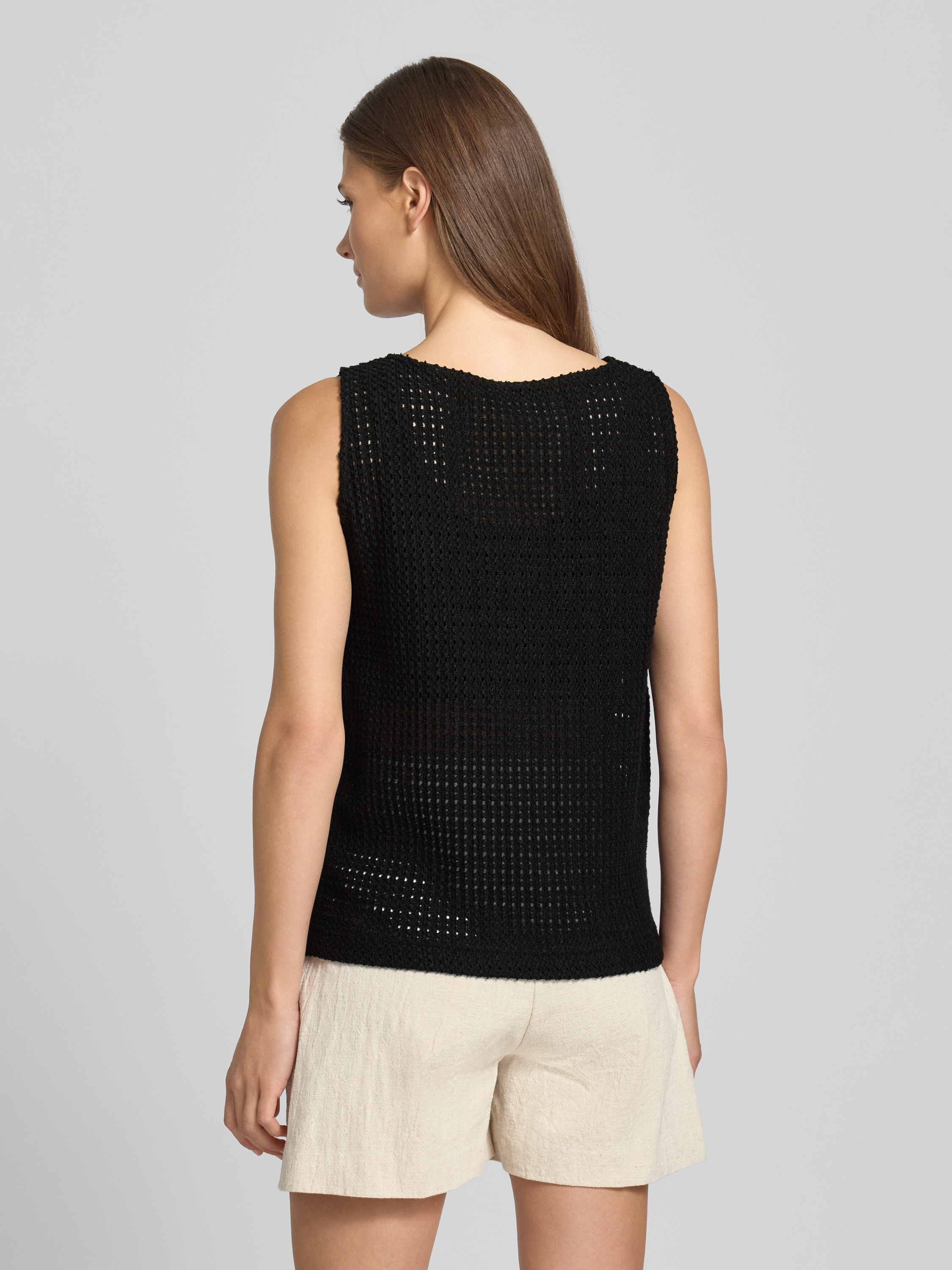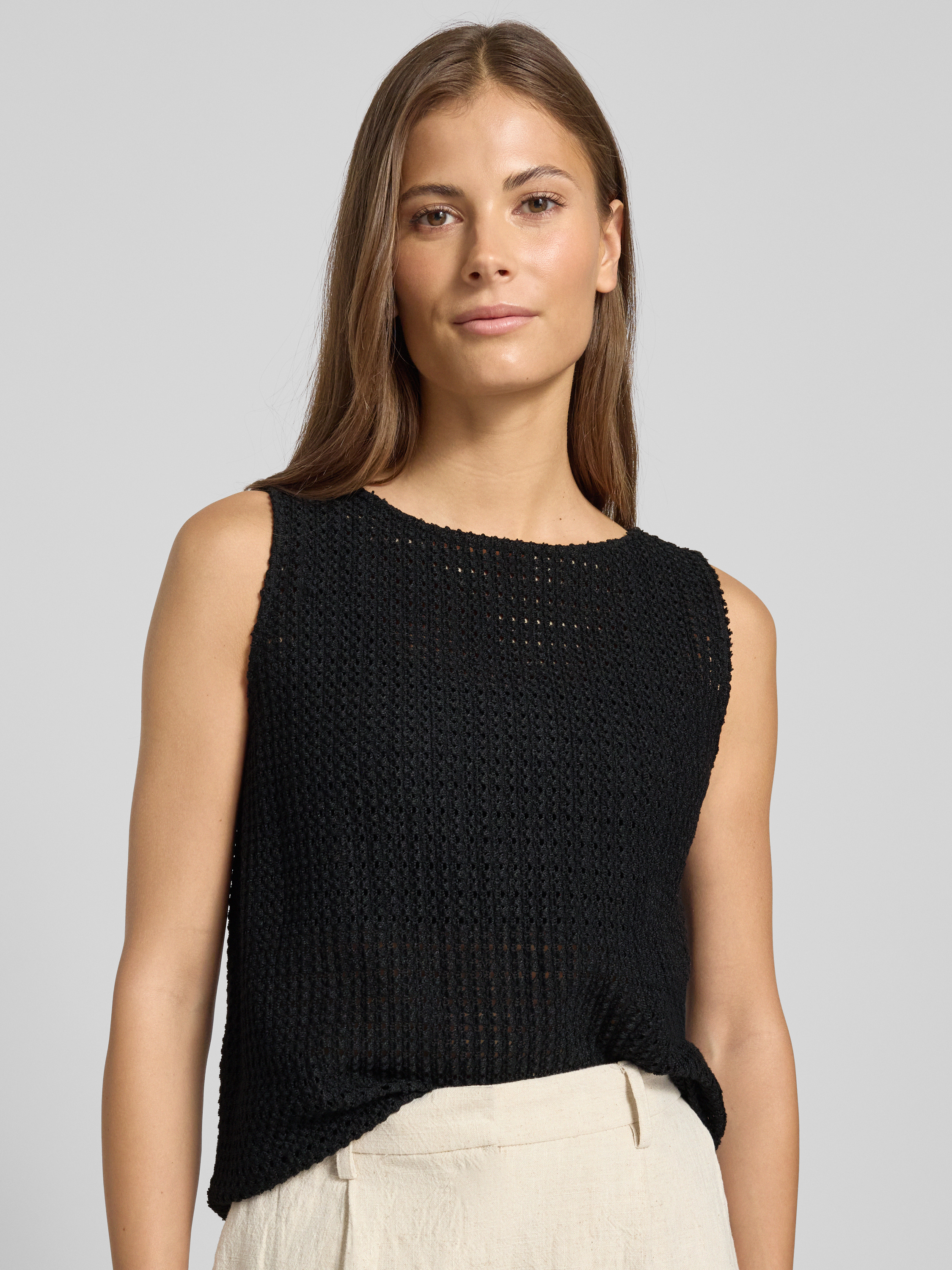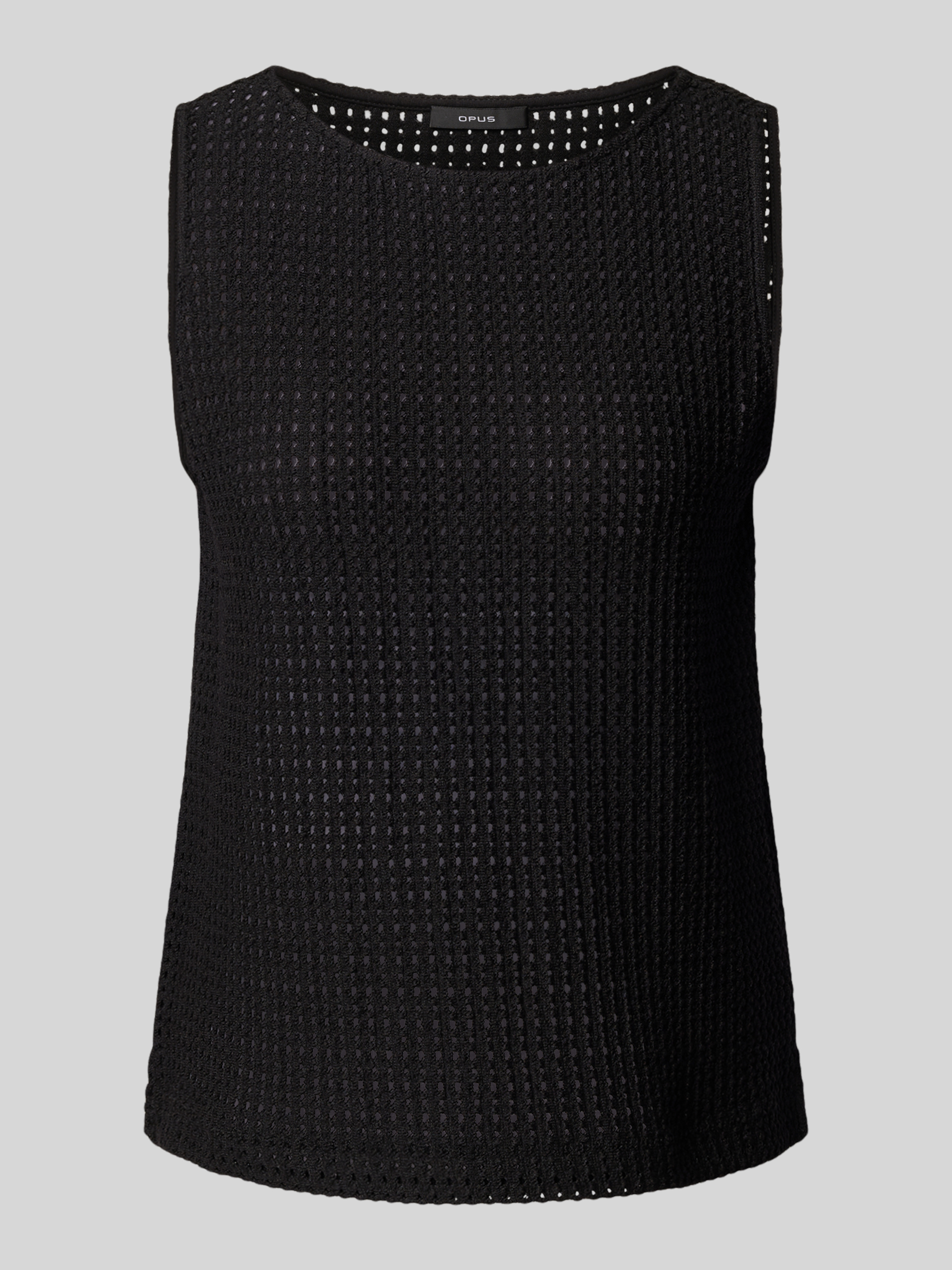 Das ärmellose Top 'Idali' von OPUS kombiniert eine bequeme Regular Fit Passform mit einem Baumwoll-Mix, der durch seinen Stretch-Anteil Flexibilität bietet. Das semitransparente Design mit Lochmuster verleiht dem Rundhalsausschnitt eine interessante Struktur und sorgt für eine leichte Strick-Optik. Ideal für vielseitige Kombinationen.