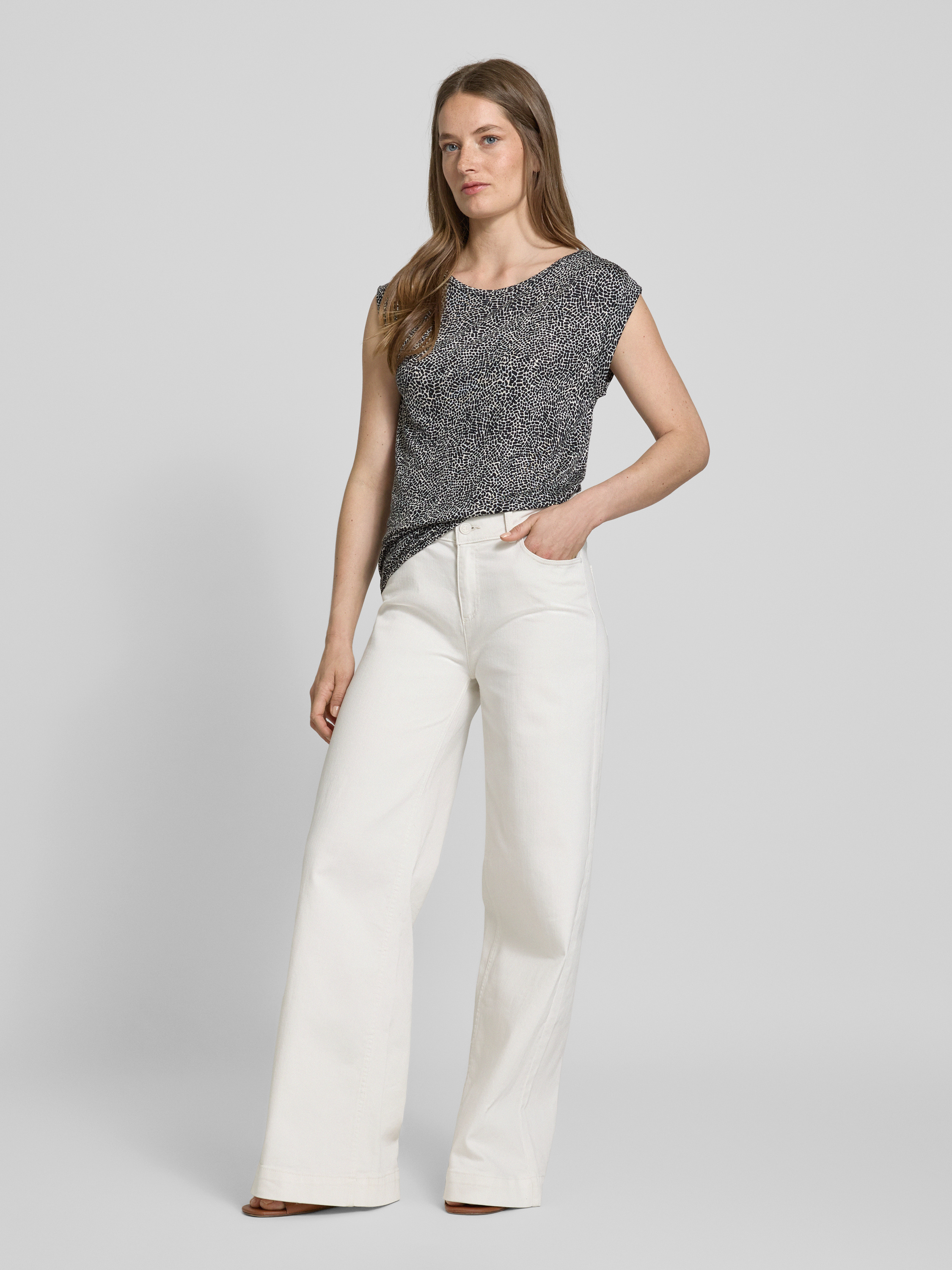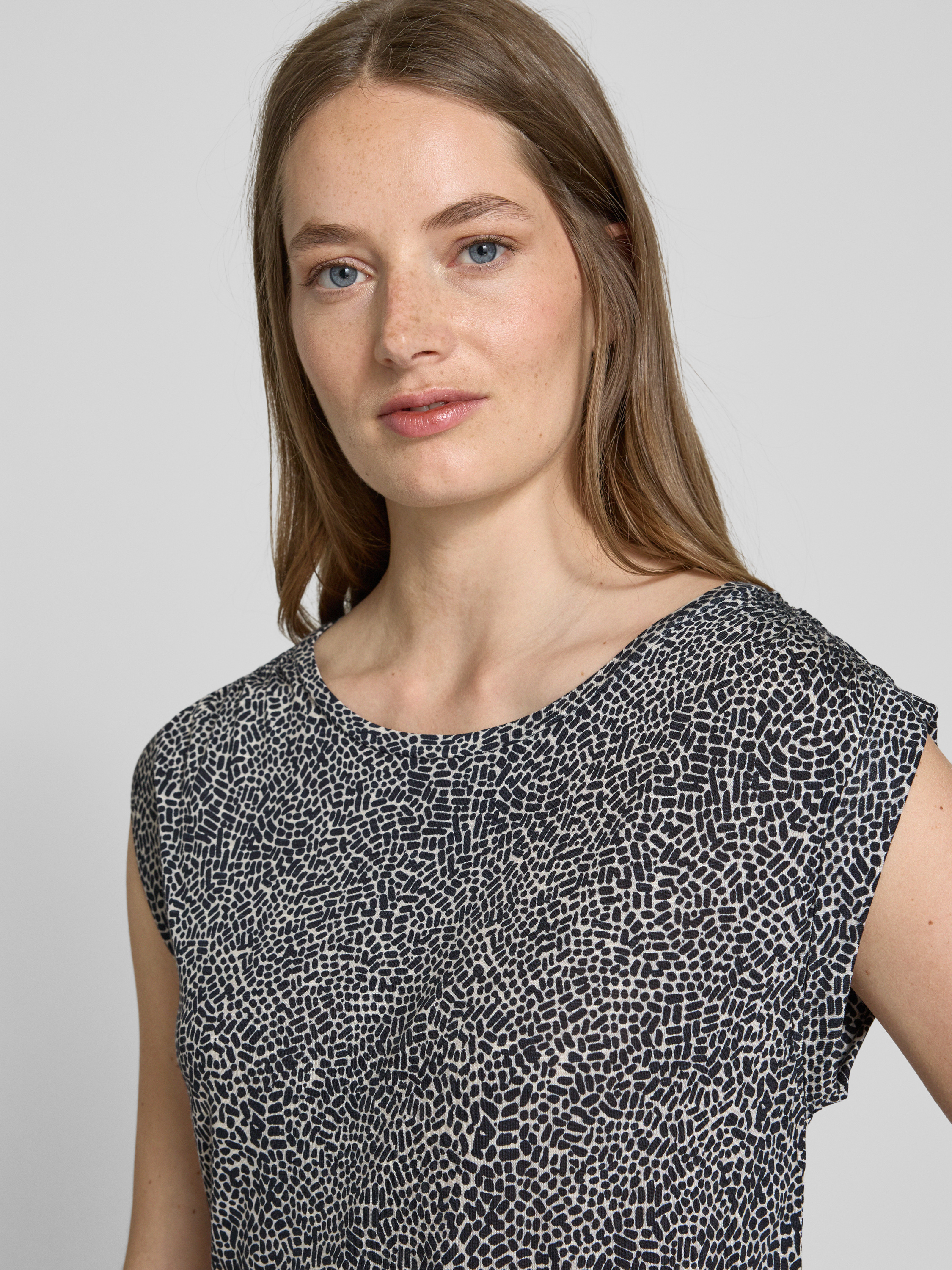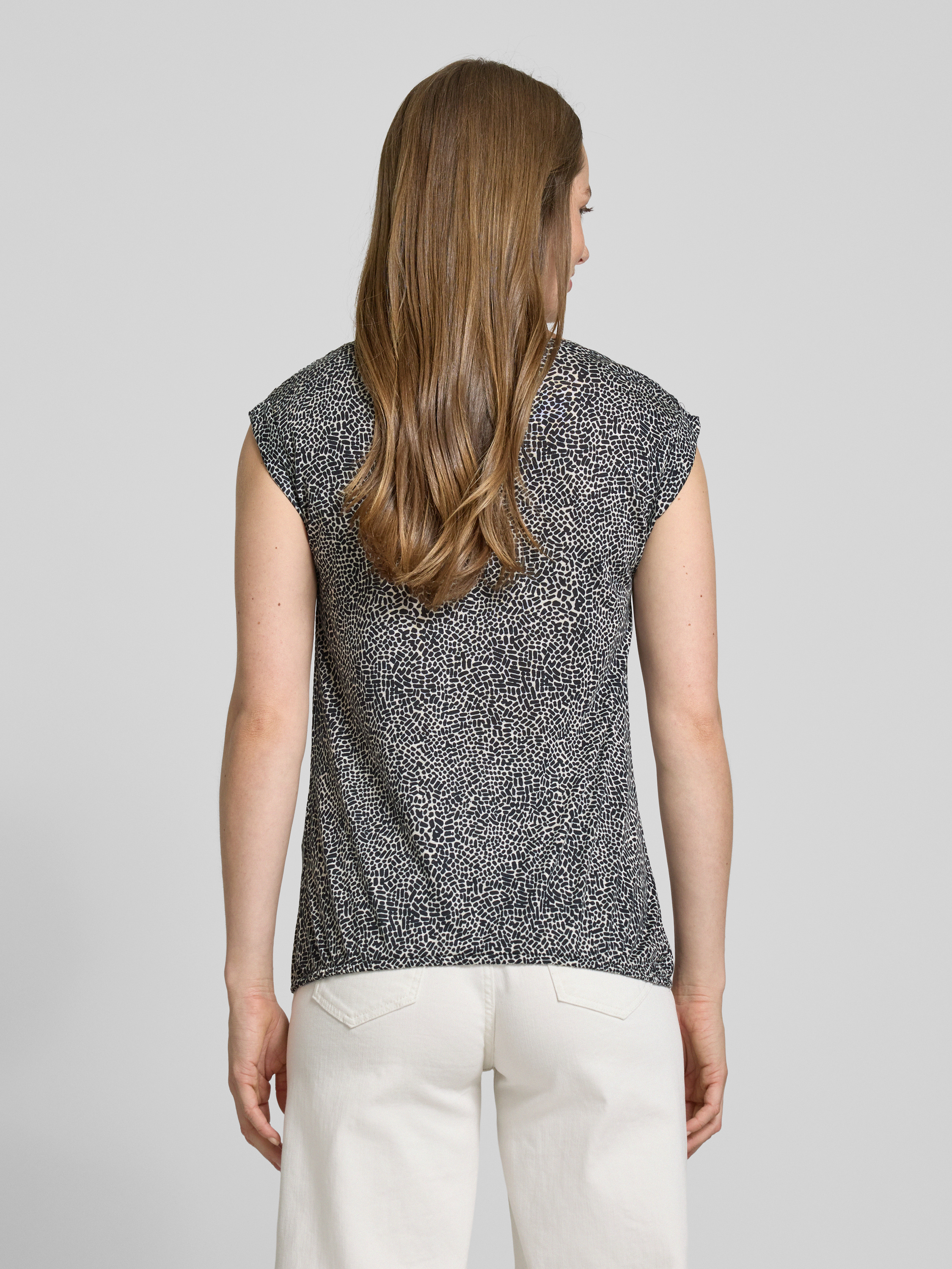Das T-Shirt mit Kappärmeln Modell 'Struki' von OPUS zeichnet sich durch seinen geraden Schnitt und den eleganten Rundhalsausschnitt aus. Die reine Viskose sorgt für ein angenehmes Tragegefühl und bietet Leichtigkeit. Mit einer Rückenlänge von 54 cm in Größe 36 wirkt es modern und komfortabel.