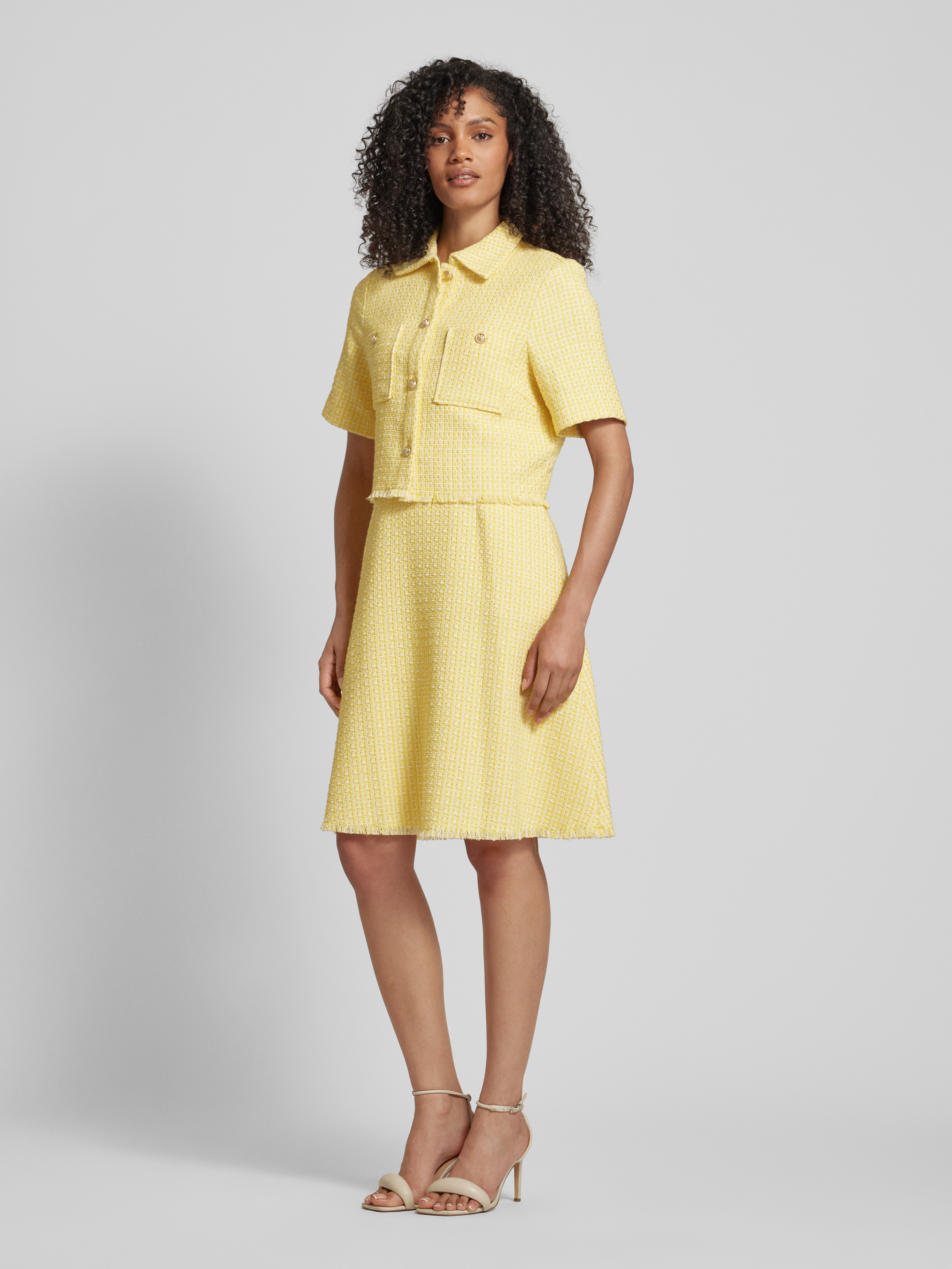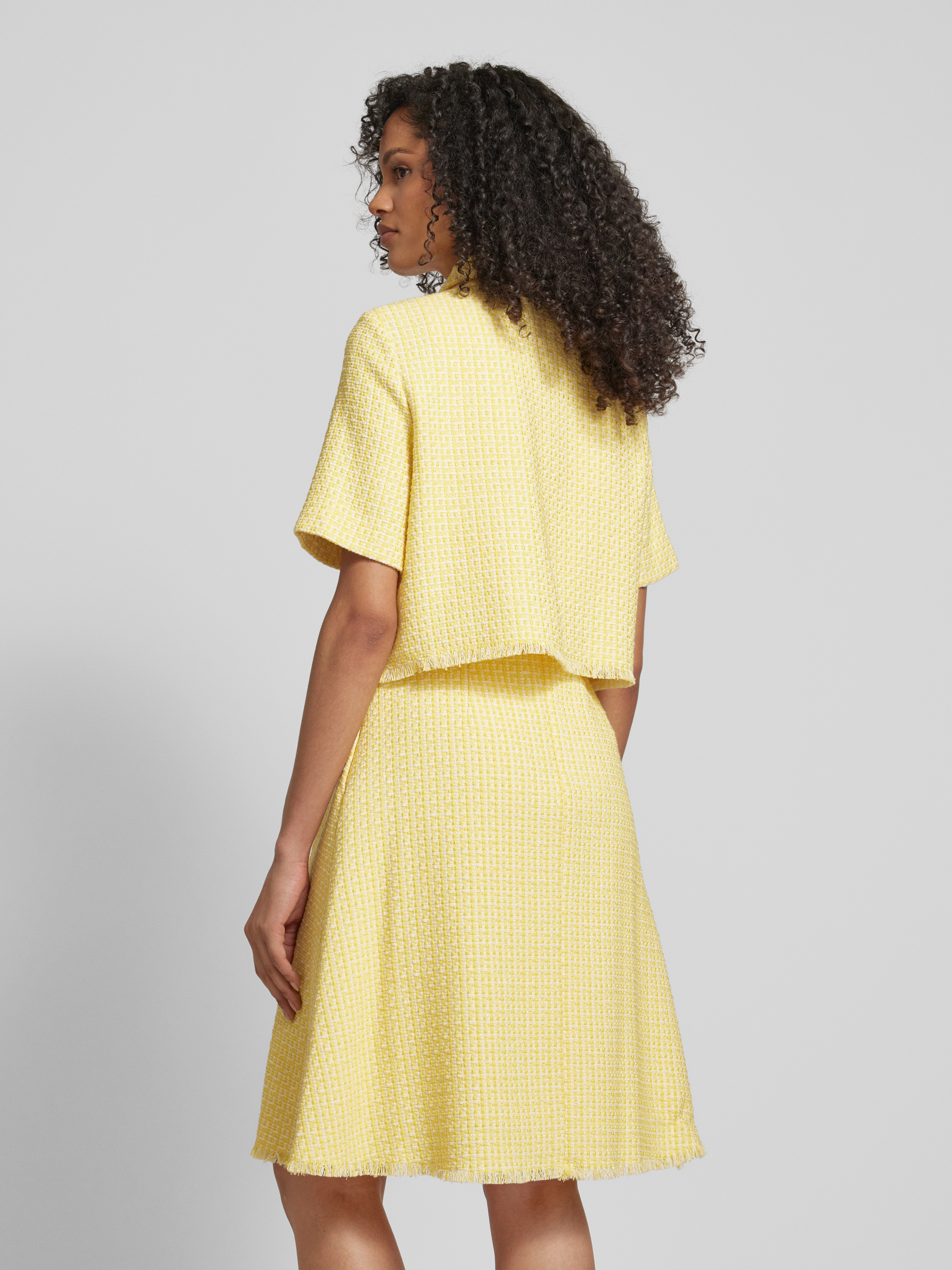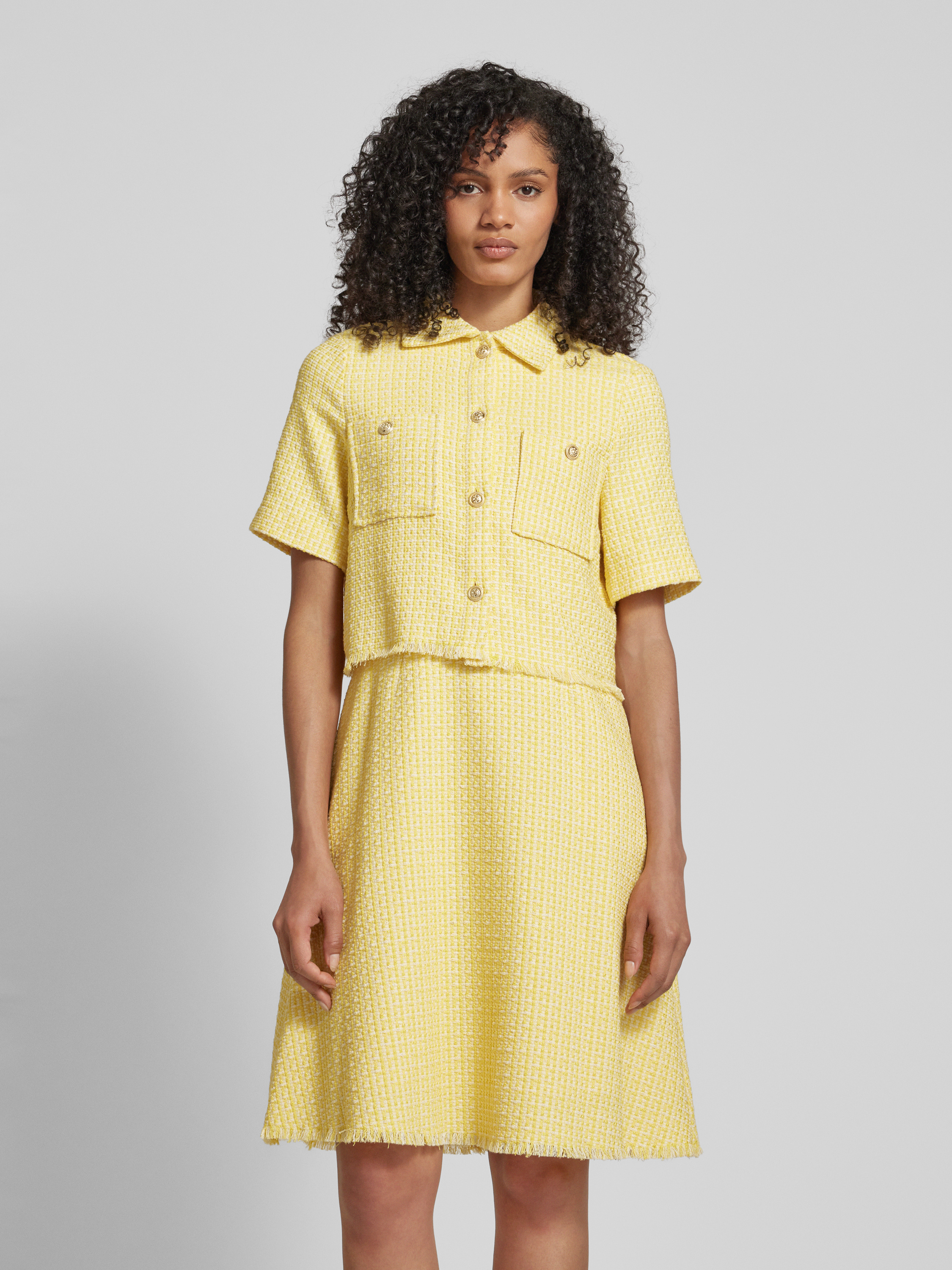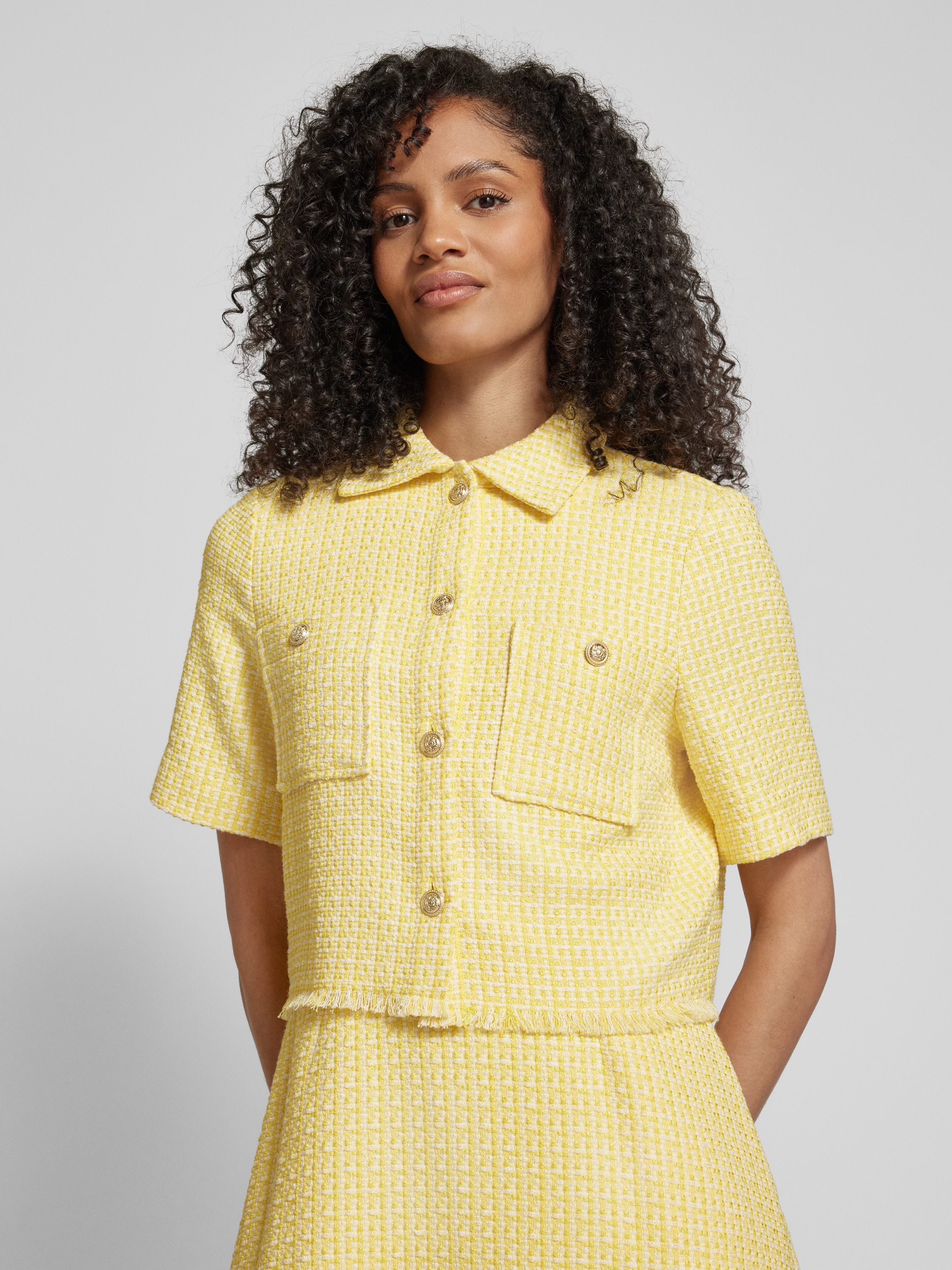 Der Blazer von Oui, gefertigt aus einem hochwertigen Baumwoll-Mix mit Viskose, beeindruckt durch seinen geraden Schnitt und die stilvolle Bouclé-Optik. Ein Umlegekragen und Brusttaschen verleihen ihm eine klassische Note, während Fransen und Zierknöpfe subtile Akzente setzen. Ideal für vielseitige Kombinationen.