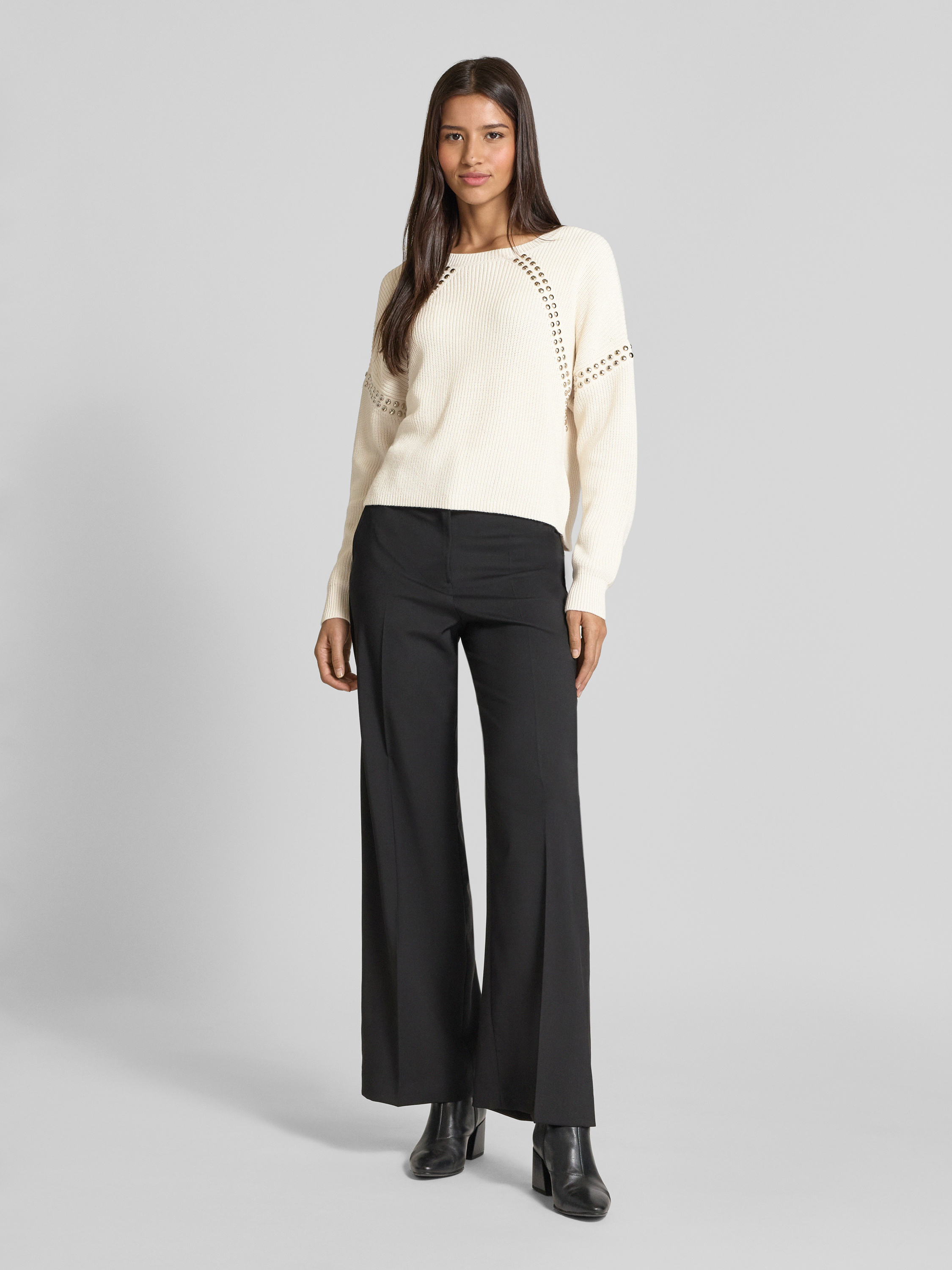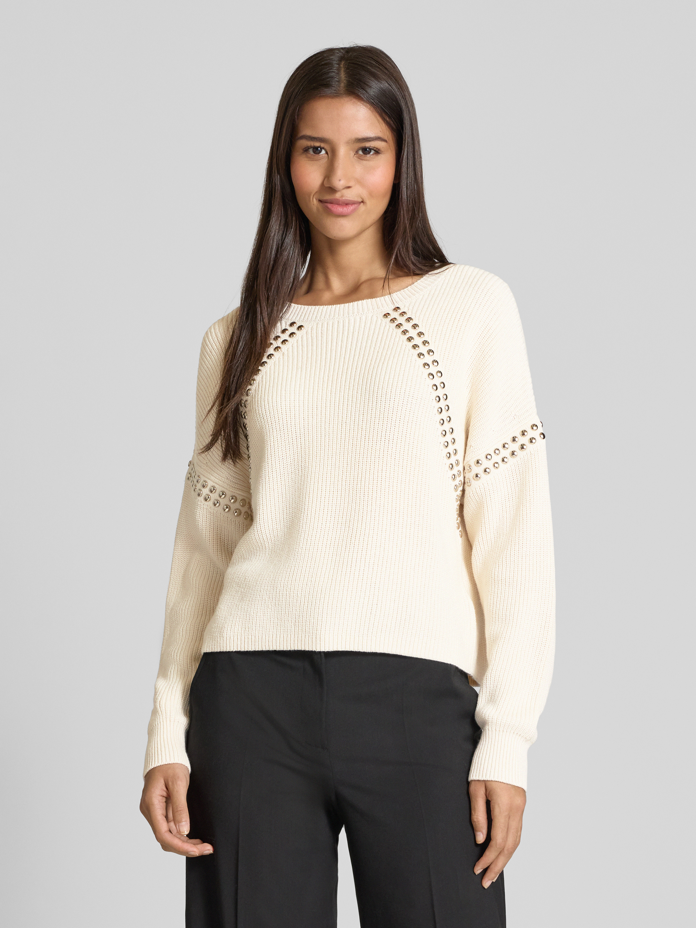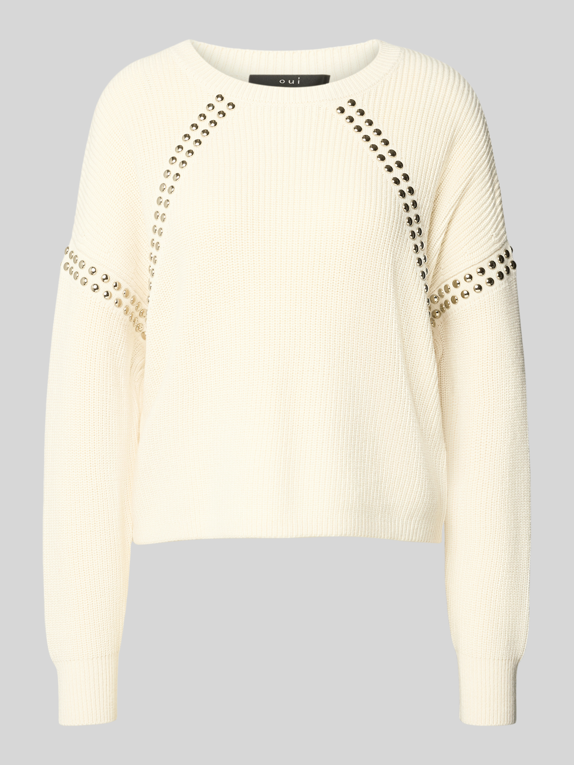 Der Damen Strickpullover von Oui im Baumwoll-Mix kombiniert einen geraden Schnitt mit einem klassischen Rundhalsausschnitt, wodurch ein angenehmes Tragegefühl entsteht. Dezente Nieten setzen einen besonderen Akzent und bringen Abwechslung in das Design. So eignet sich der Strickpullover vielseitig für unterschiedliche Anlässe.