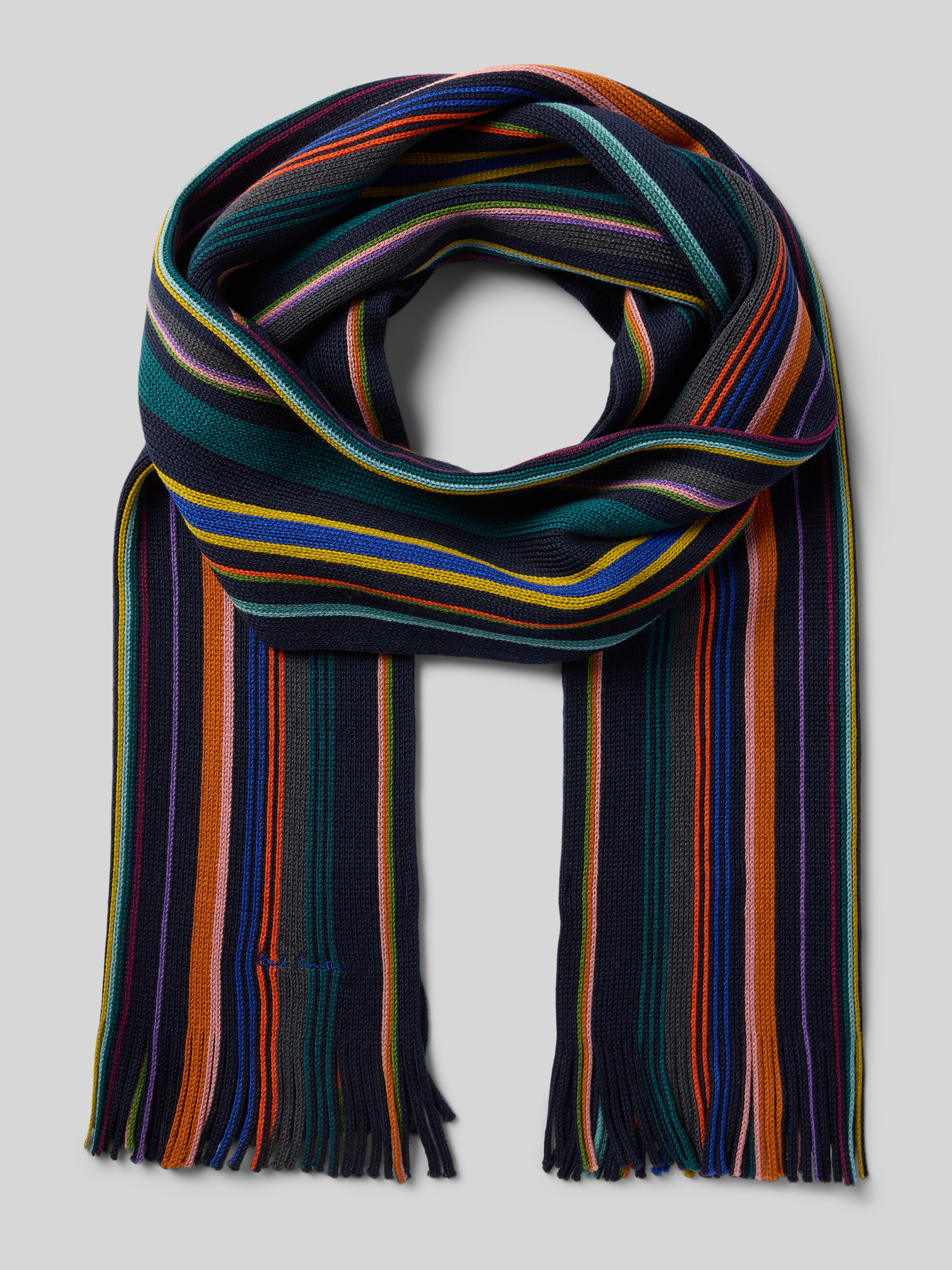 Der Herren Schal von PAUL SMITH, Modell 'IVAN', setzt mit seinem Streifenmuster und den markanten Fransen dezente Akzente im Alltag. Durch die Verarbeitung reiner Lanawolle fühlt sich das Accessoire angenehm weich auf der Haut an. In rechteckiger Form gestaltet, lässt sich das Modell vielseitig kombinieren und passt sich unterschiedlichen Looks flexibel an.