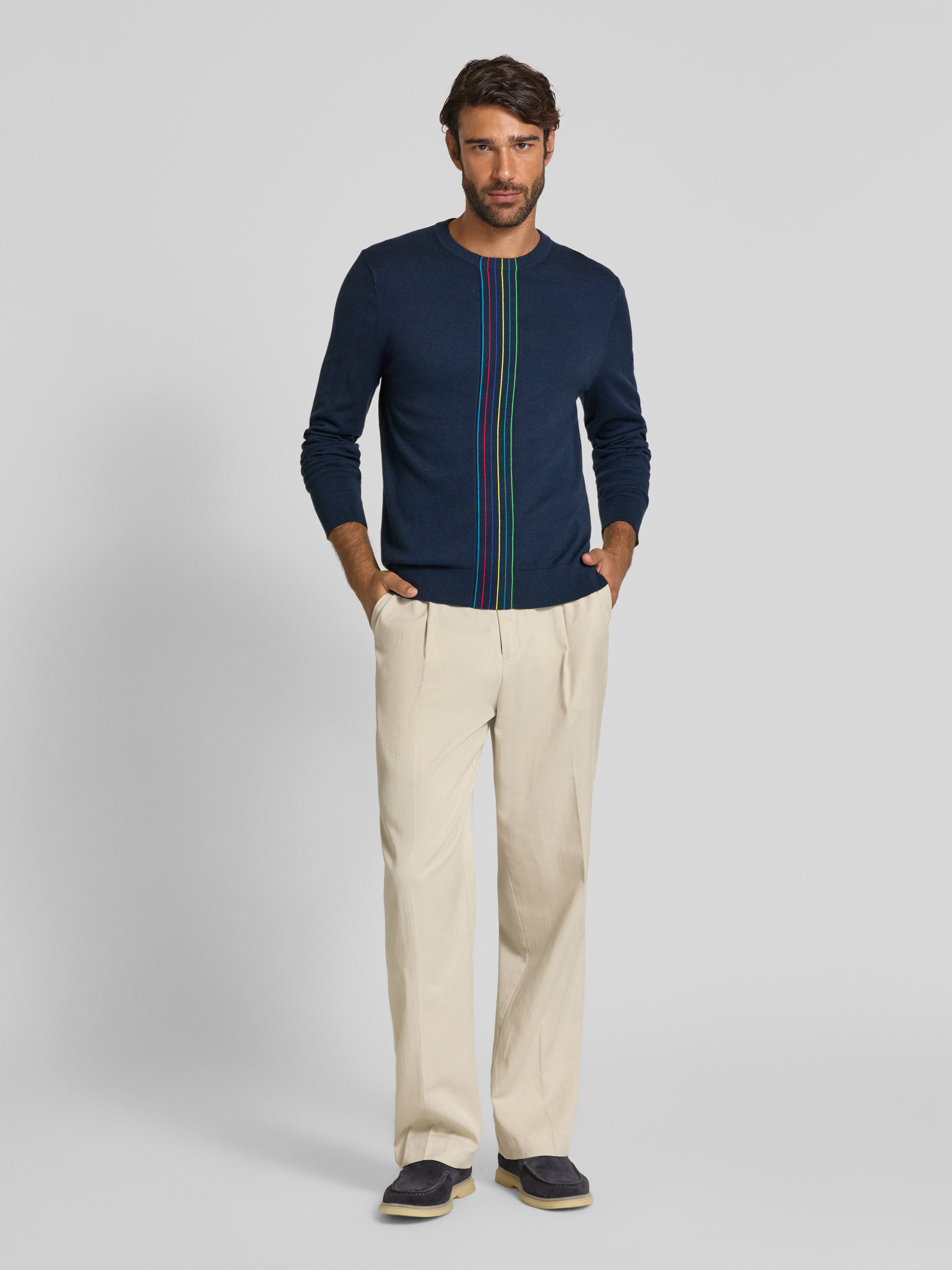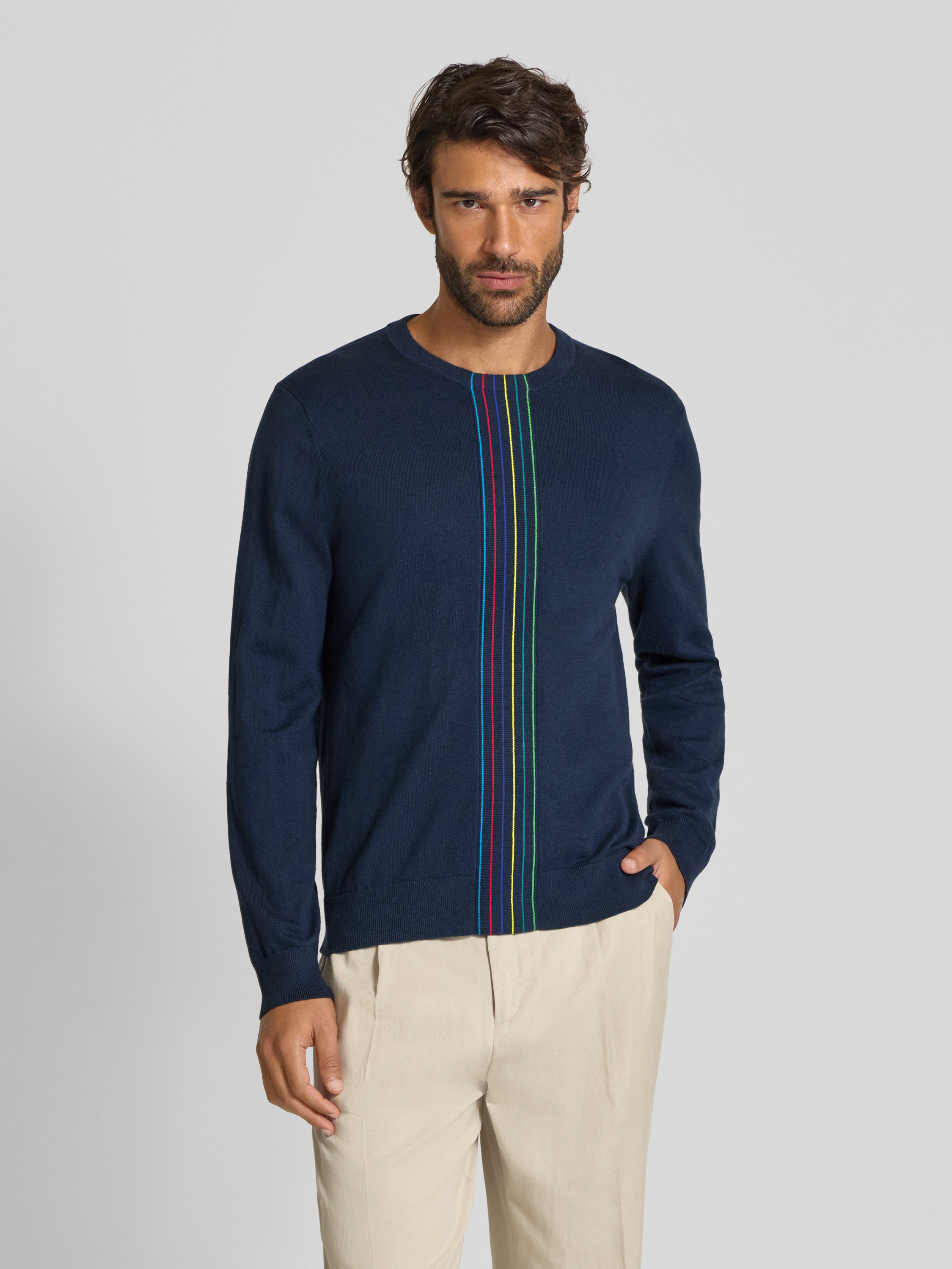 Der Herren Strickpullover von PAUL SMITH kombiniert einen angenehm geraden Schnitt mit klassischem Rundhalsausschnitt. Durch den Baumwoll-Mix mit Woll-Anteil fühlt sich das Material weich an und eignet sich für verschiedene Jahreszeiten. Dezente gerippte Abschlüsse runden das Gesamtbild alltagstauglich ab.