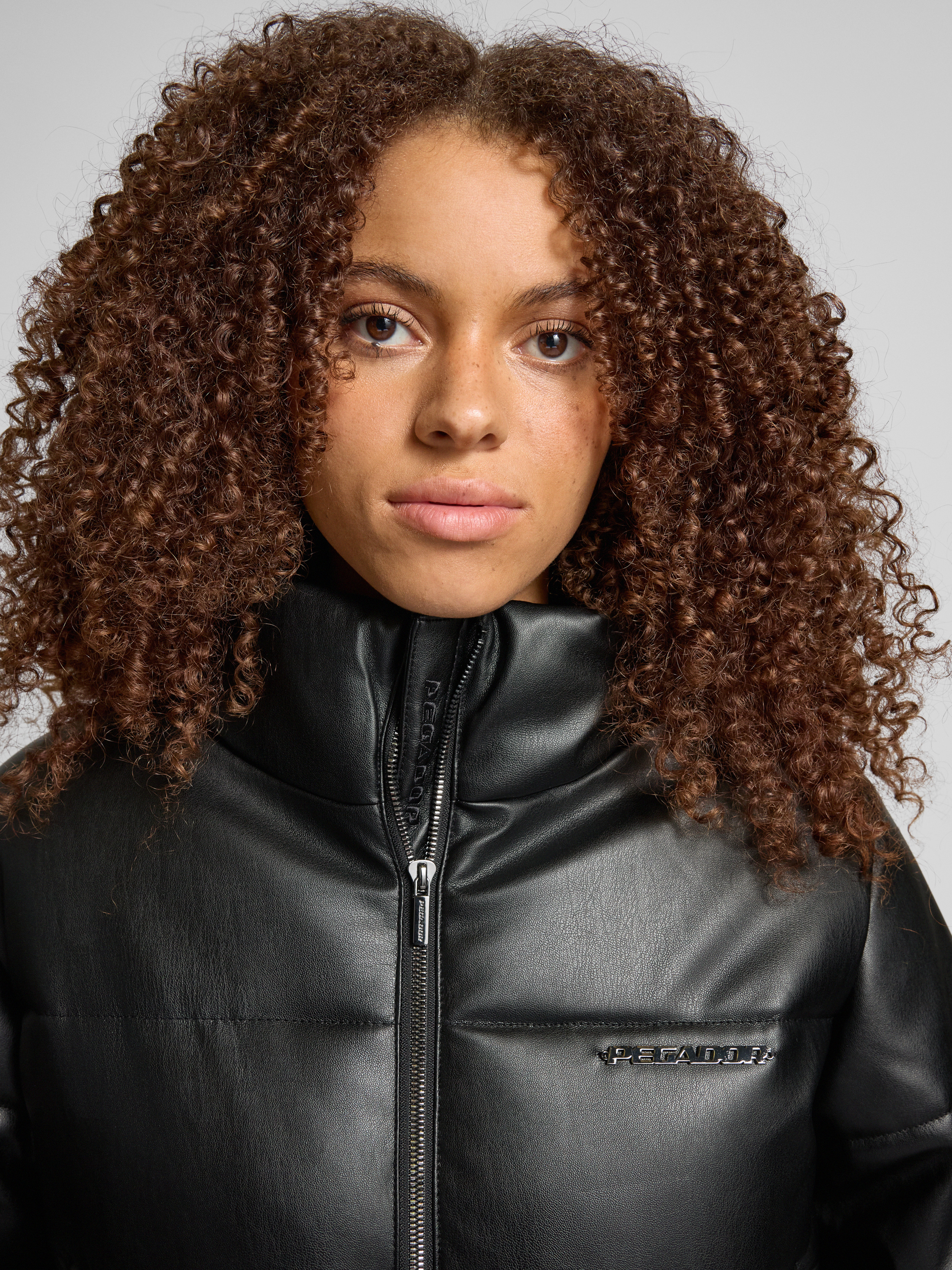 Die Damen Steppjacke von PEGADOR, Modell 'GEORGIA', vereint einen geraden Schnitt mit einer eleganten Leder-Optik. Durch den Stehkragen und die seitlichen Eingrifftaschen entsteht ein harmonisches Design, das vielseitig kombinierbar ist. Steppnähte verleihen der Jacke eine dezente Struktur.