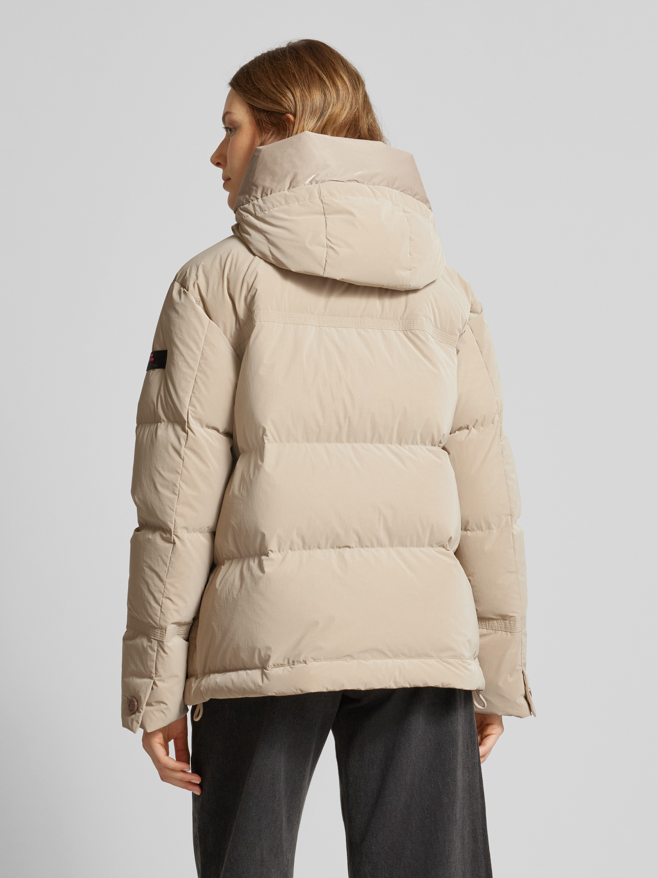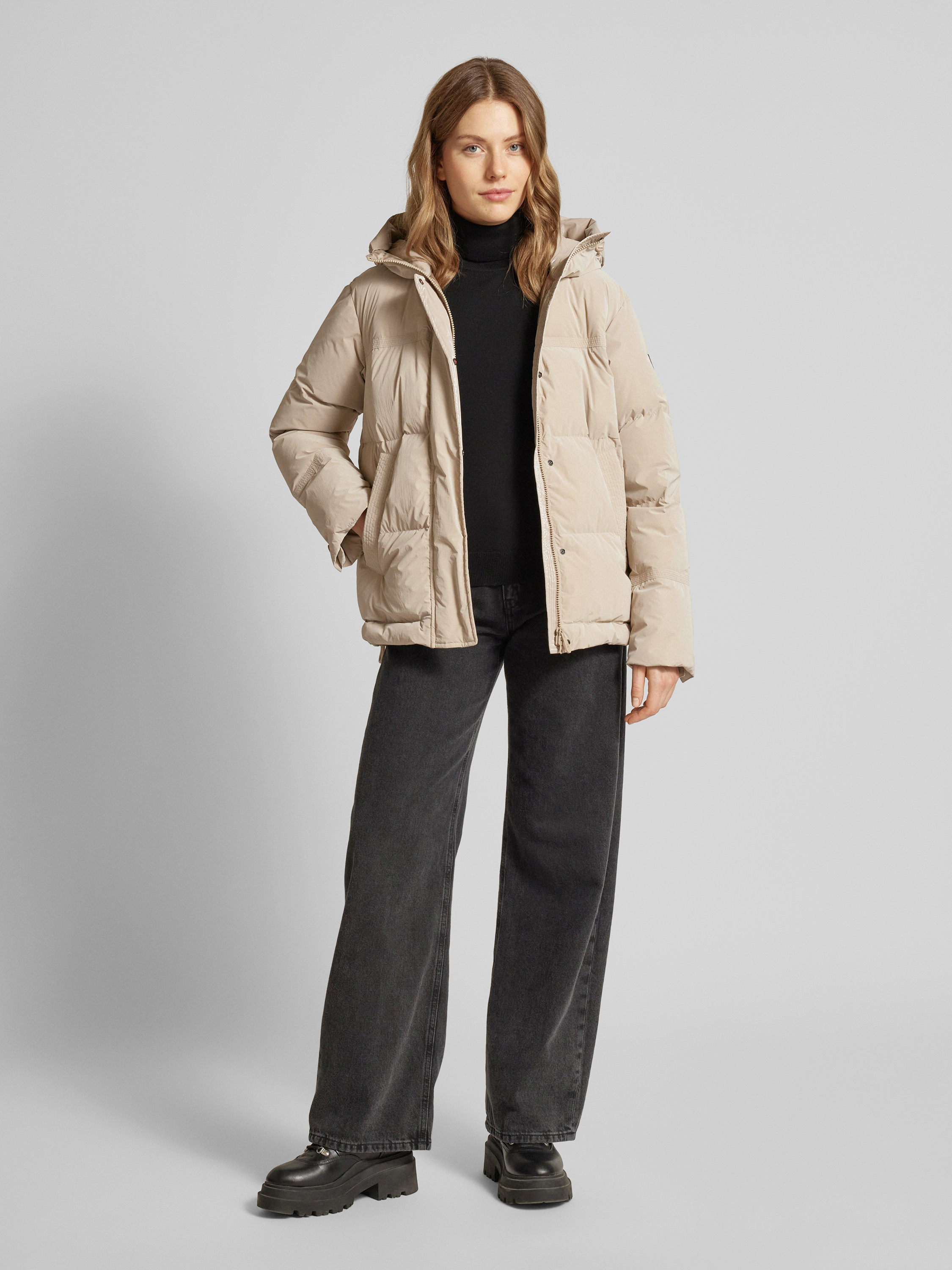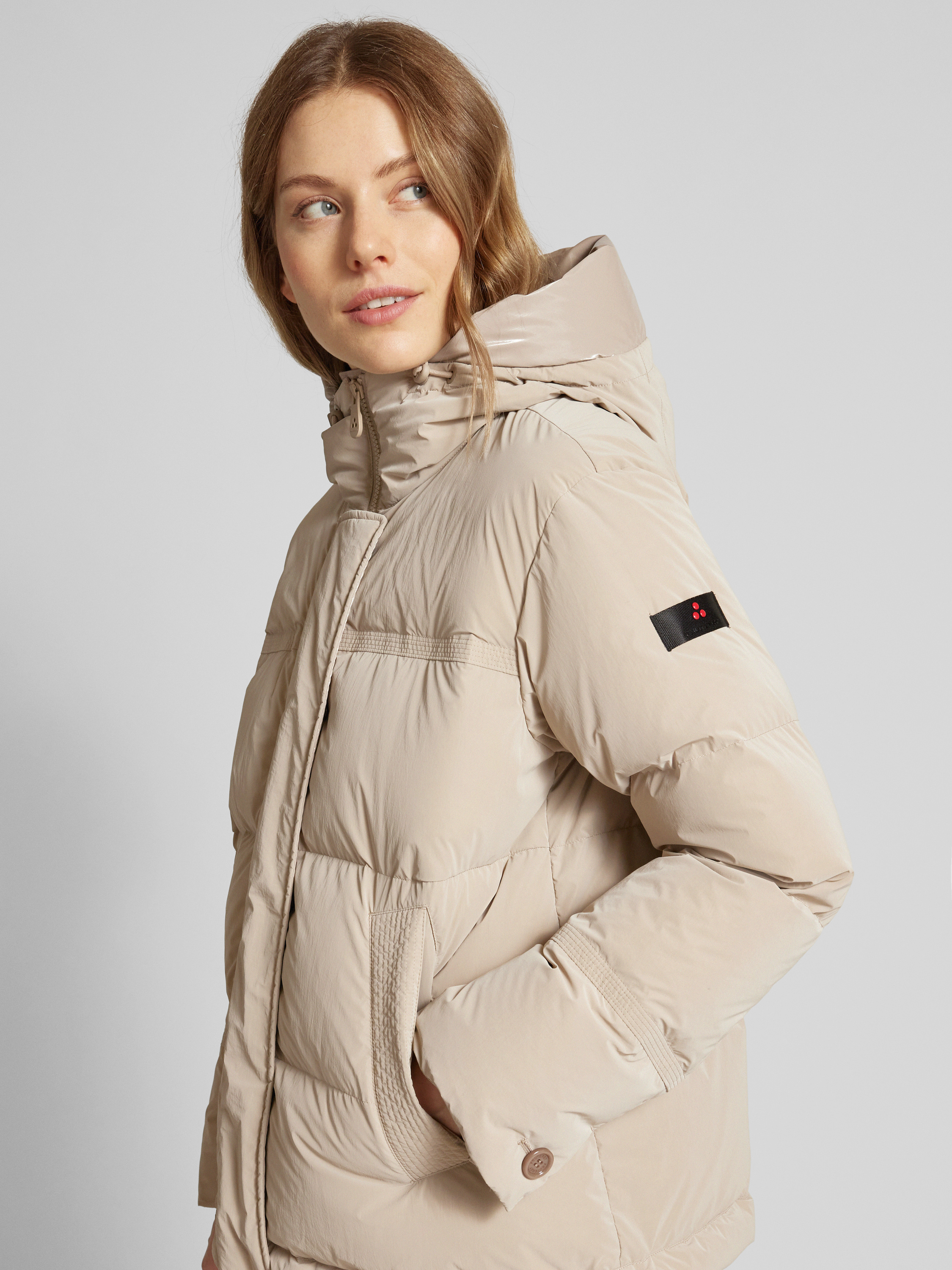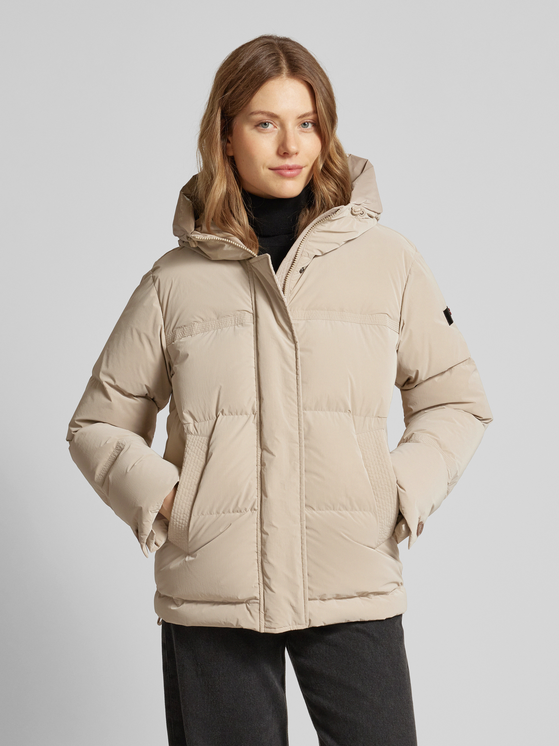 Die Steppjacke mit Stehkragen Modell 'ANISH' von Peuterey präsentiert sich in einem geraden Schnitt, der eine bequeme Passform gewährleistet. Der Stehkragen und die praktische Kapuze bieten zusätzlichen Schutz bei Wind und Wetter. Eingrifftaschen ergänzen den funktionalen Charakter dieser vielseitigen Damenjacke.