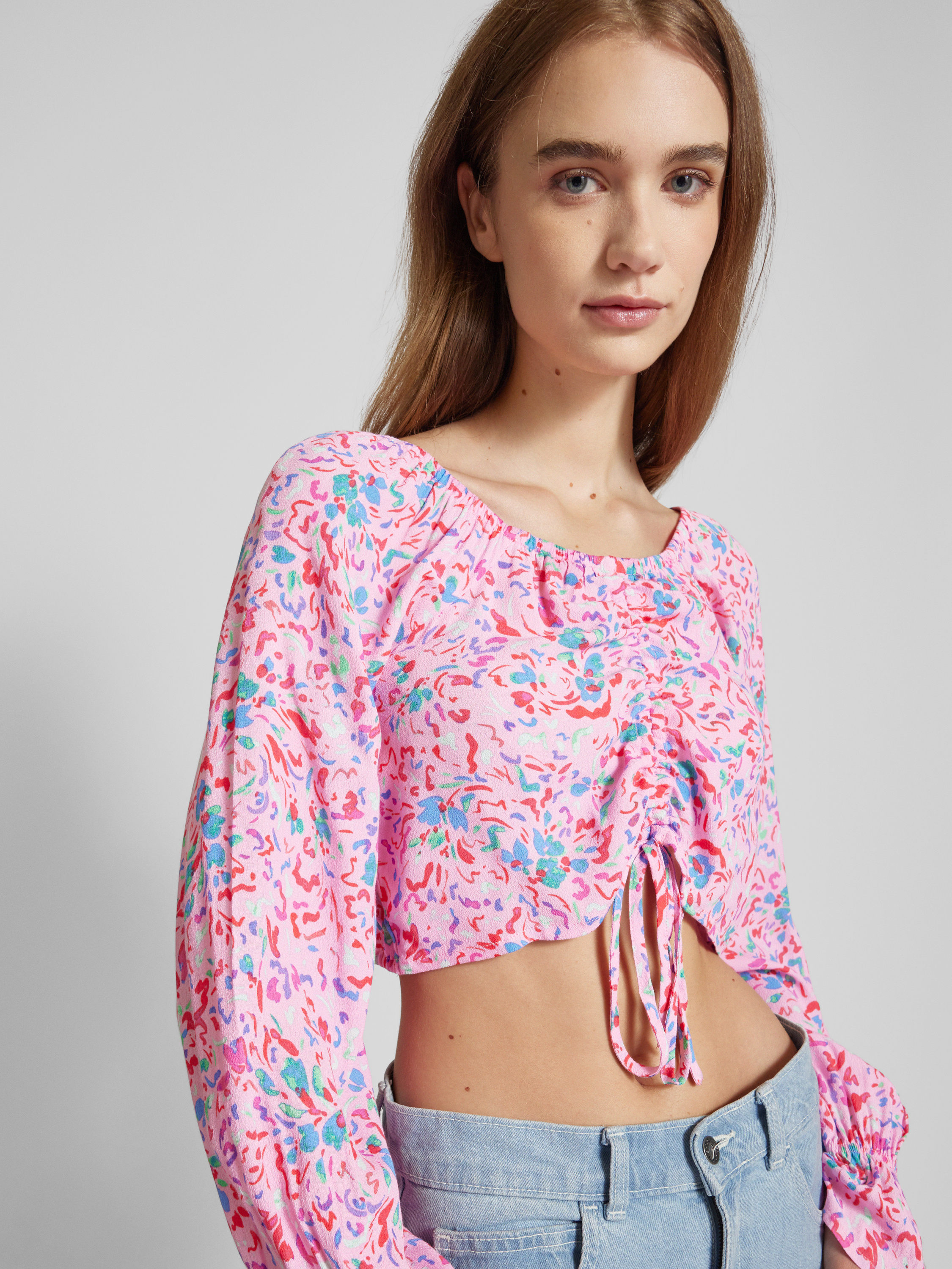Das Cropped Blusentop von PIECES vereint lässigen Chic mit einem Hauch von Eleganz durch sein lebendiges Allover-Muster. Gefertigt aus reiner Viskose, bietet es einen angenehmen Tragekomfort und eine lockere Passform. Raffungen und ein Schleifen-Detail verleihen dem Top eine verspielte Note.