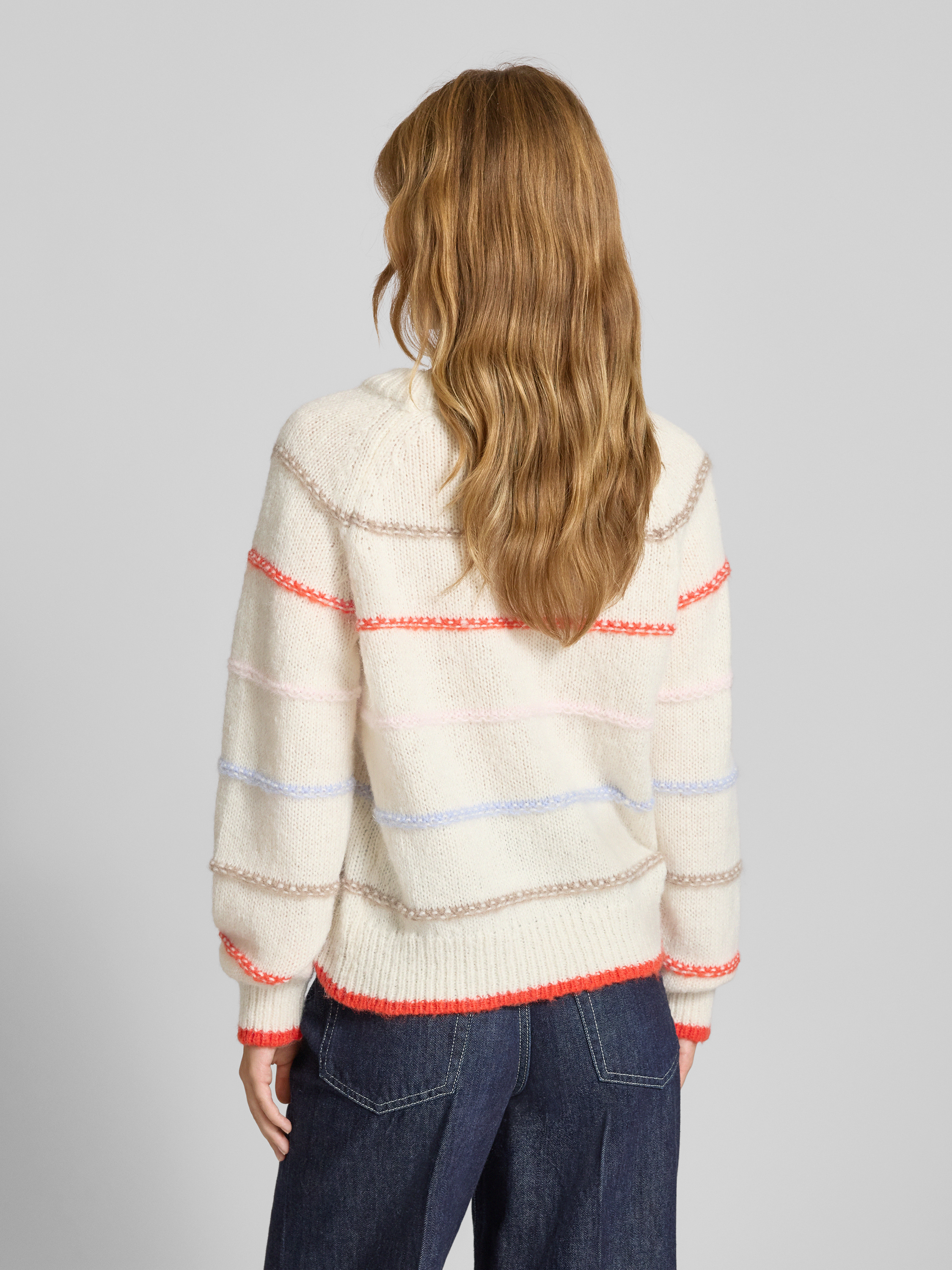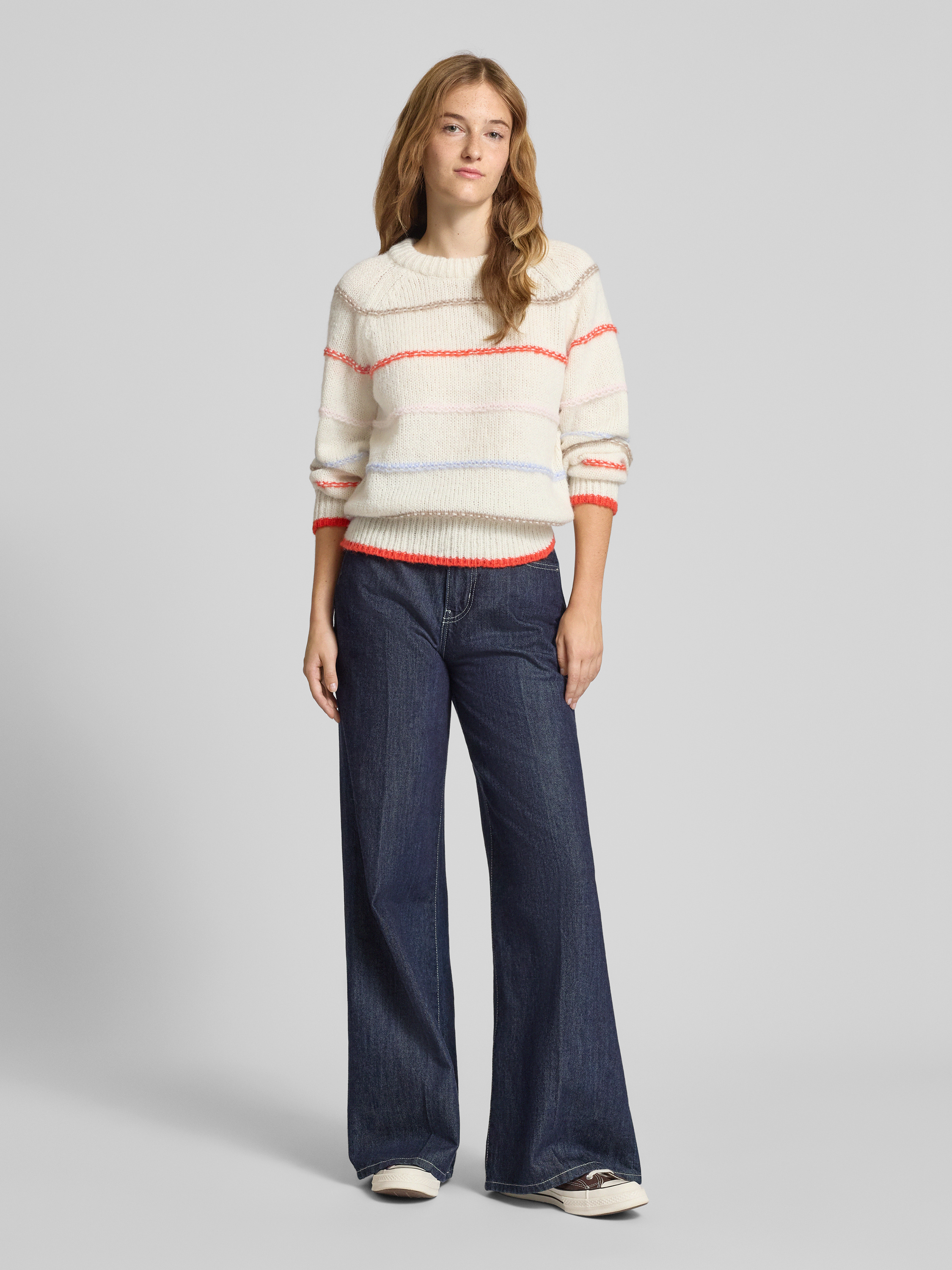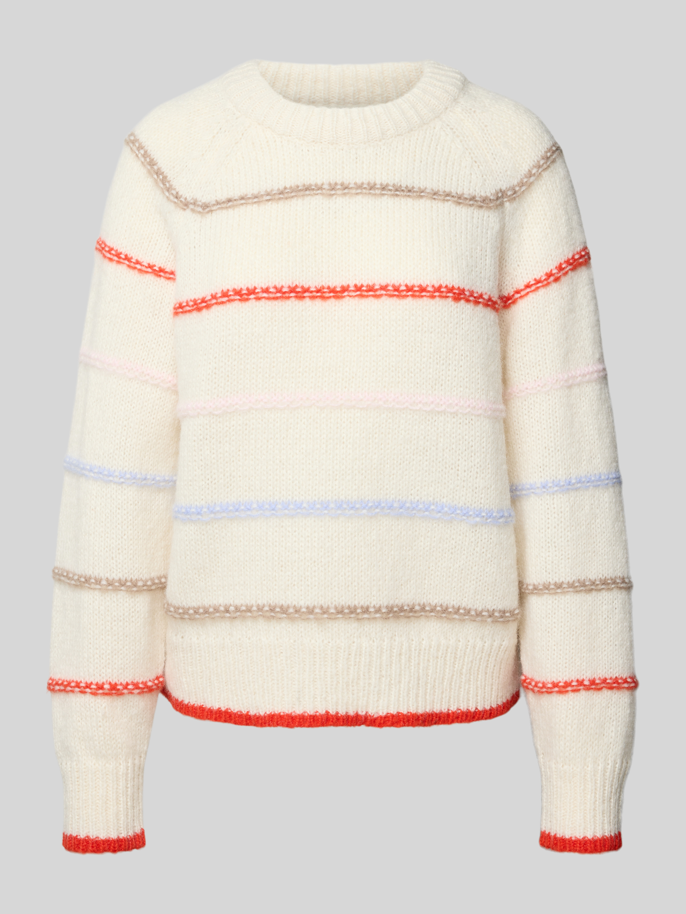 Der Damenpullover von Pieces, Modell Nelia, fällt durch sein gestreiftes Allover-Muster und die entspannte Regular Fit-Passform auf. Die Raglanärmel sorgen für angenehme Bewegungsfreiheit, während der Rundhalsausschnitt den klassischen Charakter unterstreicht. Durch die weiche Strickstruktur fühlt sich das Modell komfortabel an.