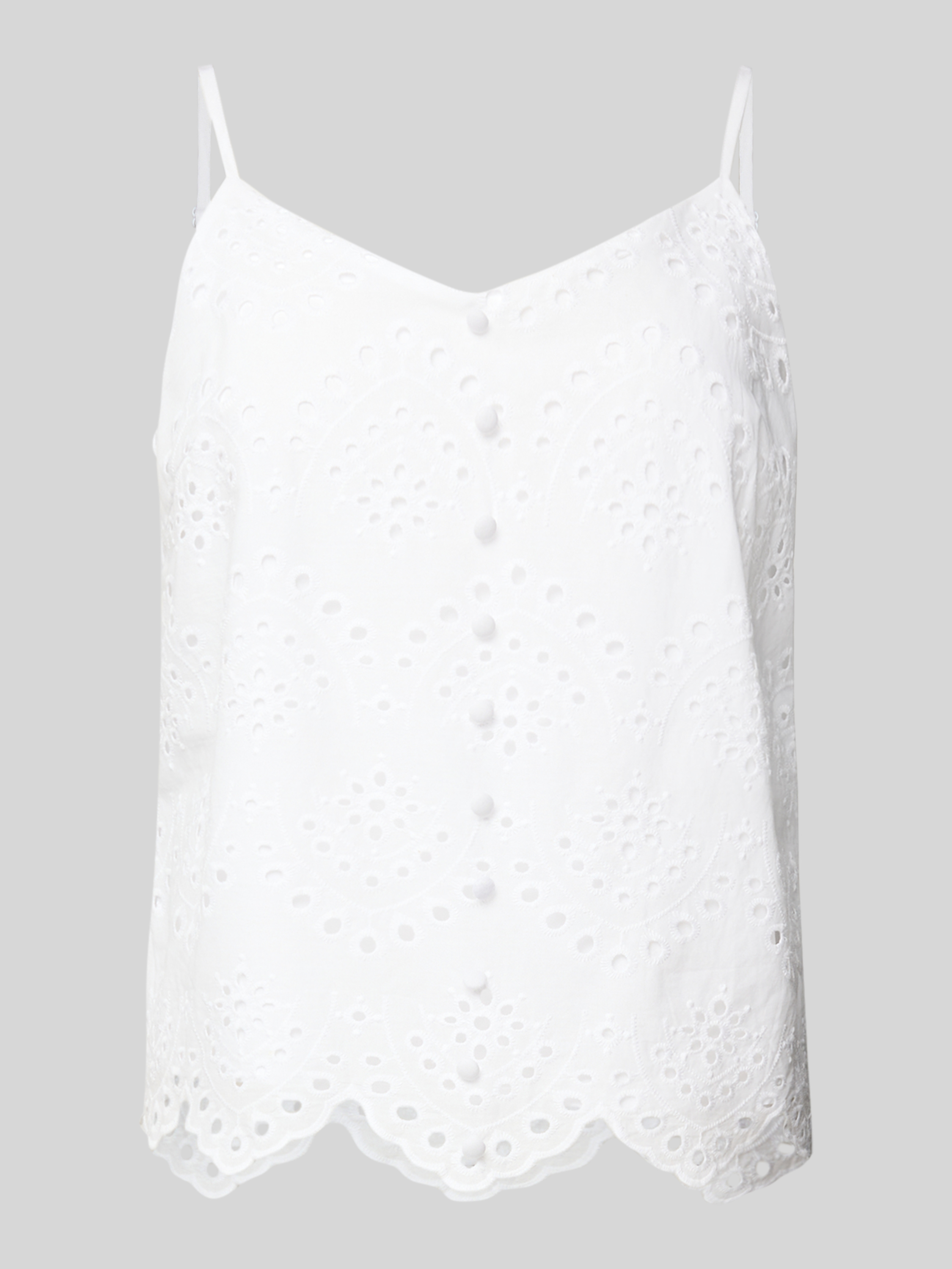 Das Damen Blusentop von Pieces, Modell Vilde, fällt durch seinen entspannten Schnitt und das dezente Lochstickmuster angenehm auf. Dank reiner Baumwolle fühlt sich das Oberteil besonders weich an, während verstellbare Spaghettiträger und Muschelsaum lockere Kombinationsmöglichkeiten erlauben. Unifarbene Optik ergänzt vielseitige Freizeit-Looks.