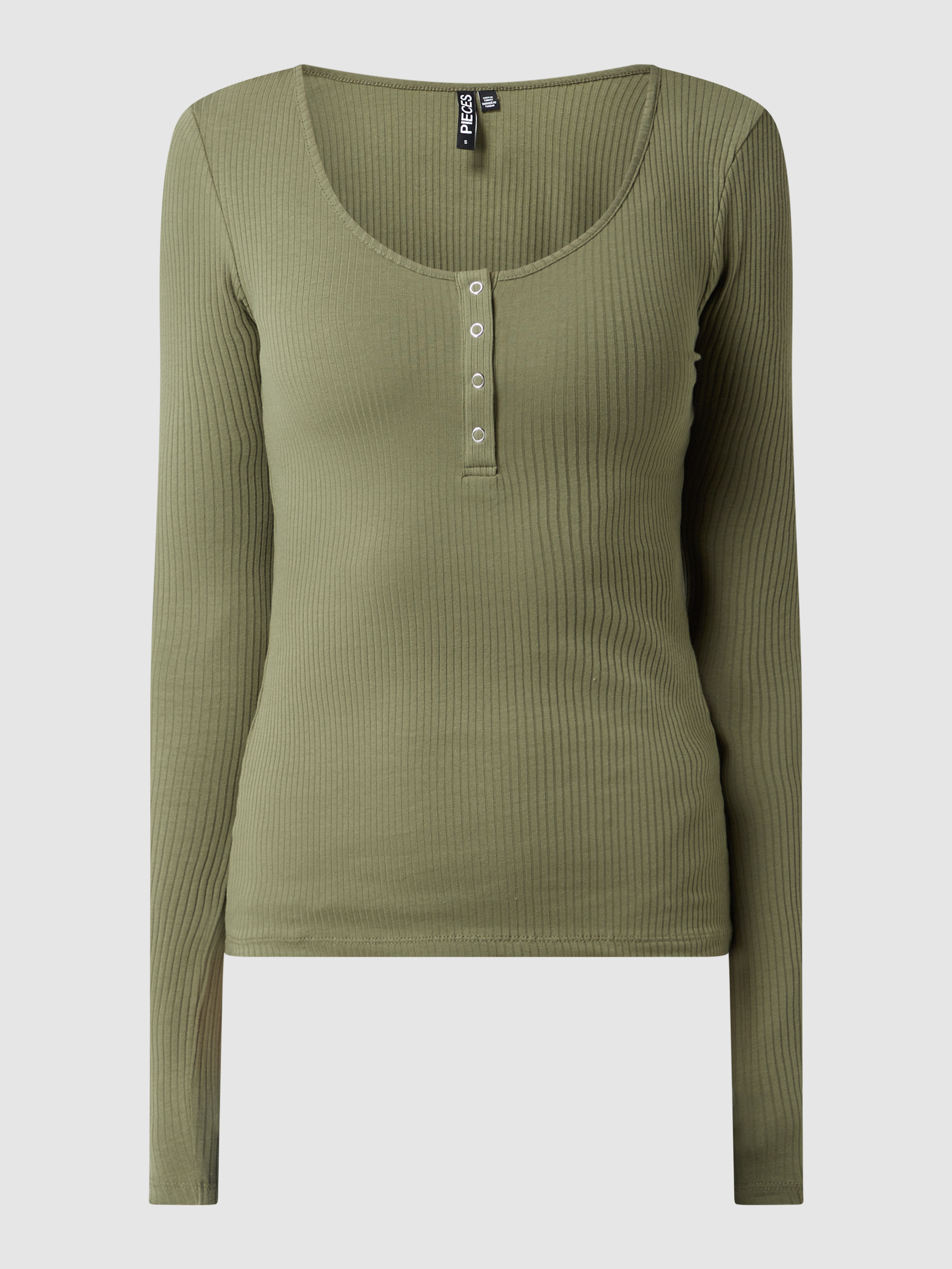 Das Damen Serafino-Langarmshirt von PIECES kombiniert Bio-Baumwolle mit einem Stretch-Anteil und liegt durch den taillierten Schnitt angenehm an. Die feine Rippenstruktur sorgt für eine dezente Optik, während der Serafino-Ausschnitt dem Shirt eine lässige Note verleiht. So eignet sich das Modell für vielseitige Kombinationen im Alltag.