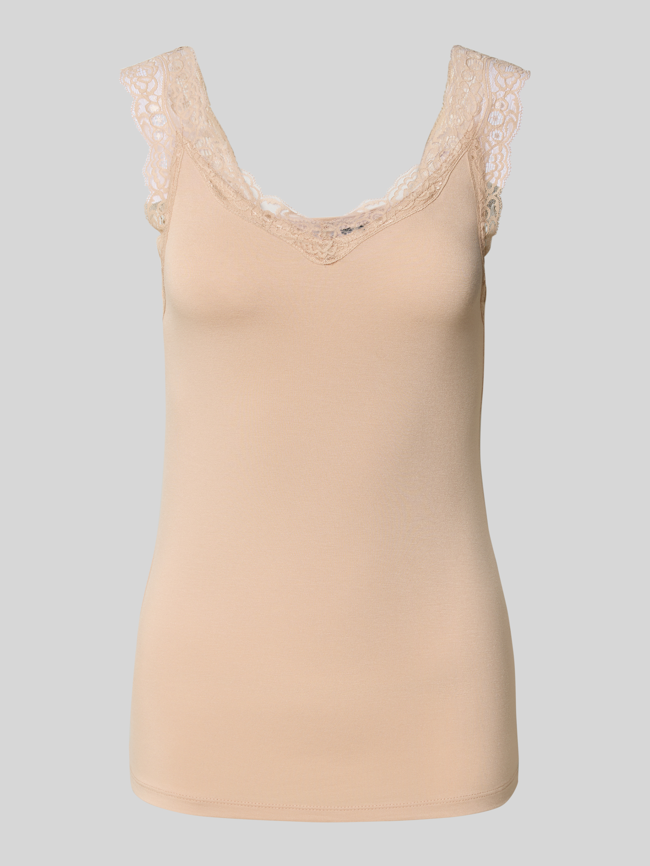 Das Slim Fit Tank Top von Pieces, Modell 'Barbera', kombiniert stilvolle Schlichtheit mit bequemer Passform. Der Viskose-Mix sorgt für ein angenehmes Tragegefühl, während der V-Ausschnitt und die breiten Träger dem Design eine feminine Note verleihen. Die zarte Spitze rundet das unifarbene Jersey-Top elegant ab.
