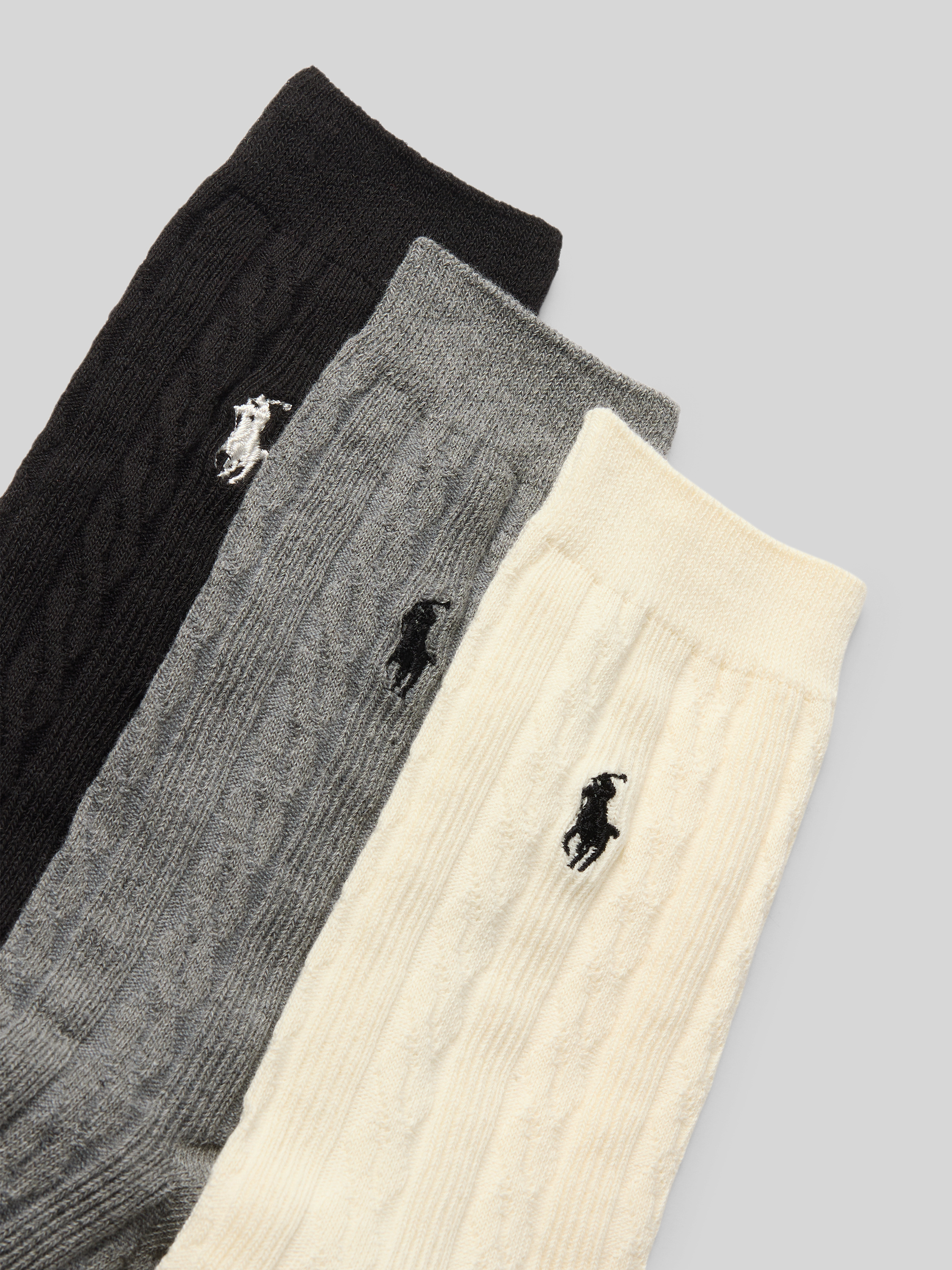 Die Socken von Polo Ralph Lauren sitzen dank ihres Baumwoll-Mix angenehm am Fuß und passen sich durch den Stretch-Anteil flexibel an. Ein klassisches Zopfmuster verleiht dem Set eine dezente Struktur, das Logo-Stitching rundet den Look ab. Im 3er-Pack eignen sie sich für vielfältige Gelegenheiten.