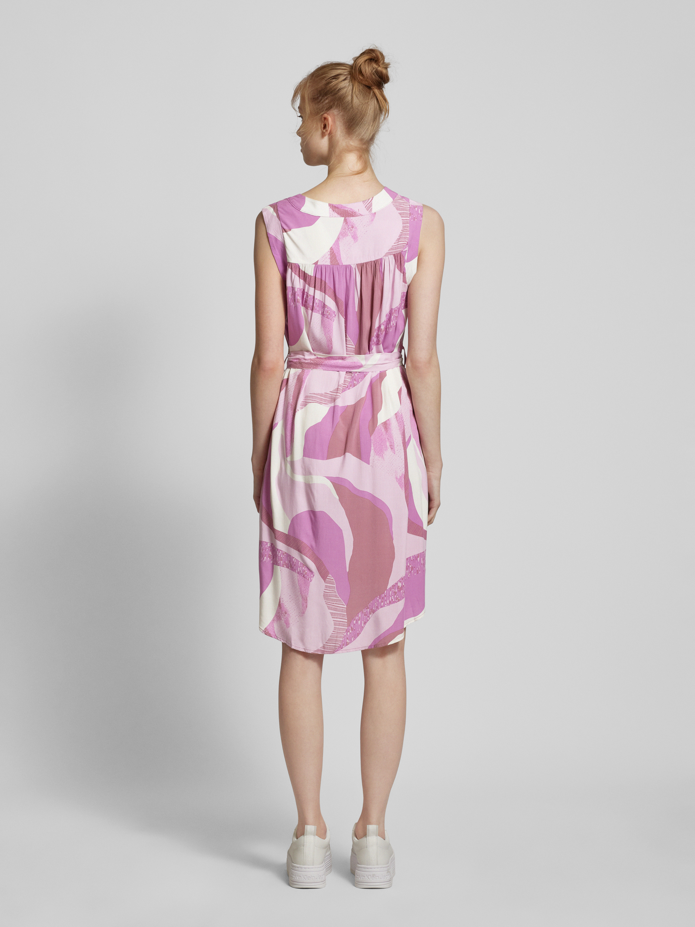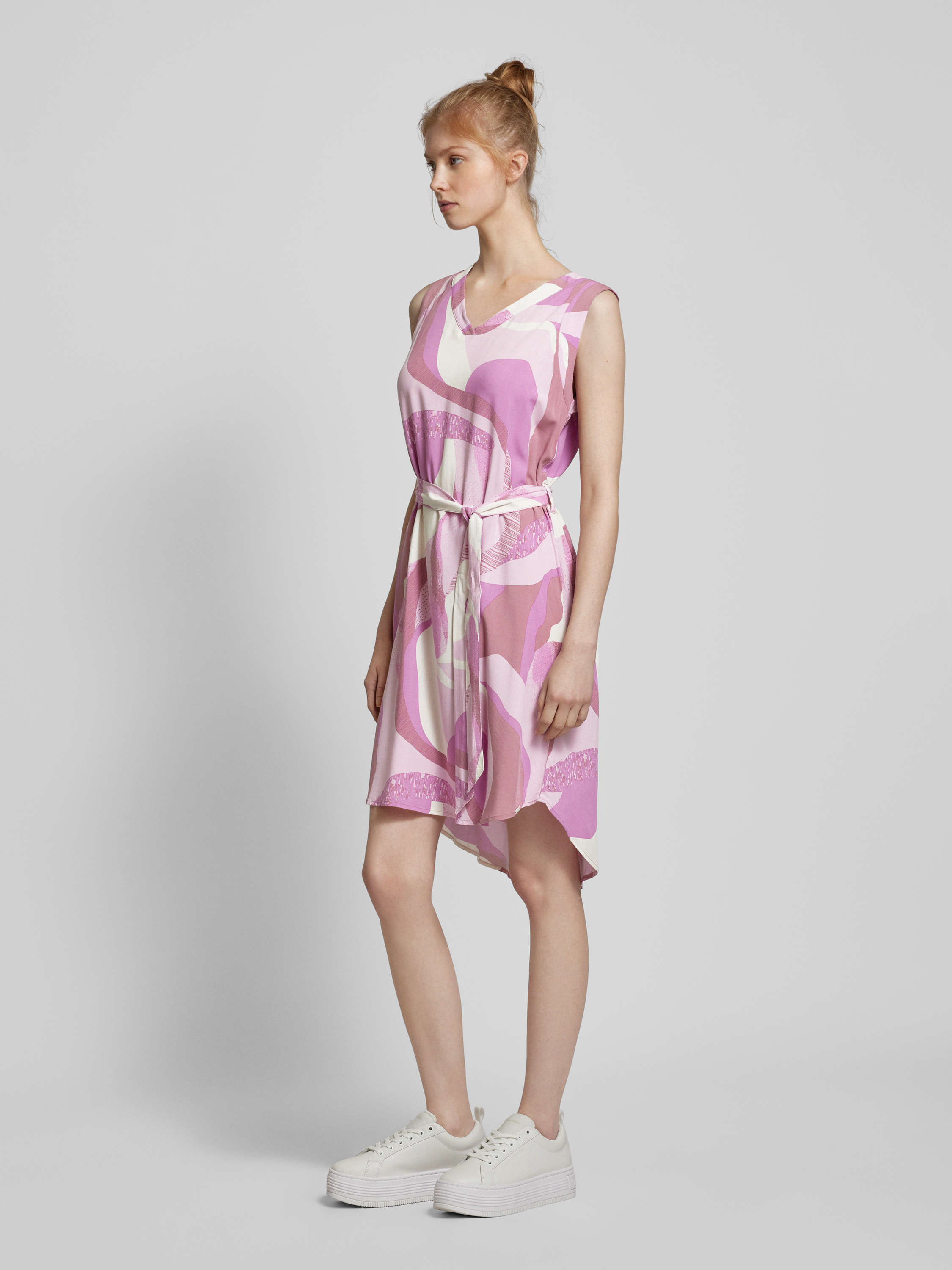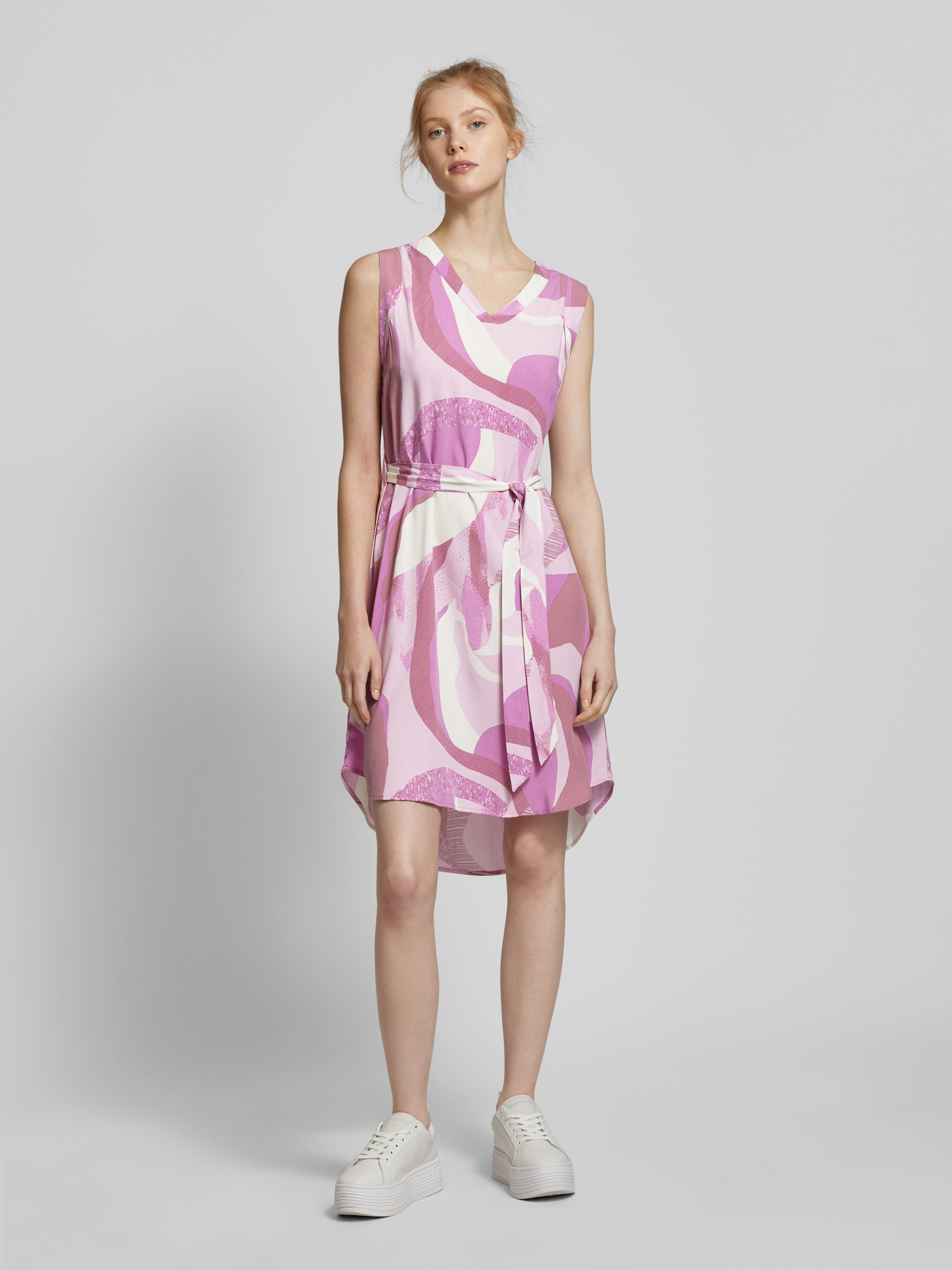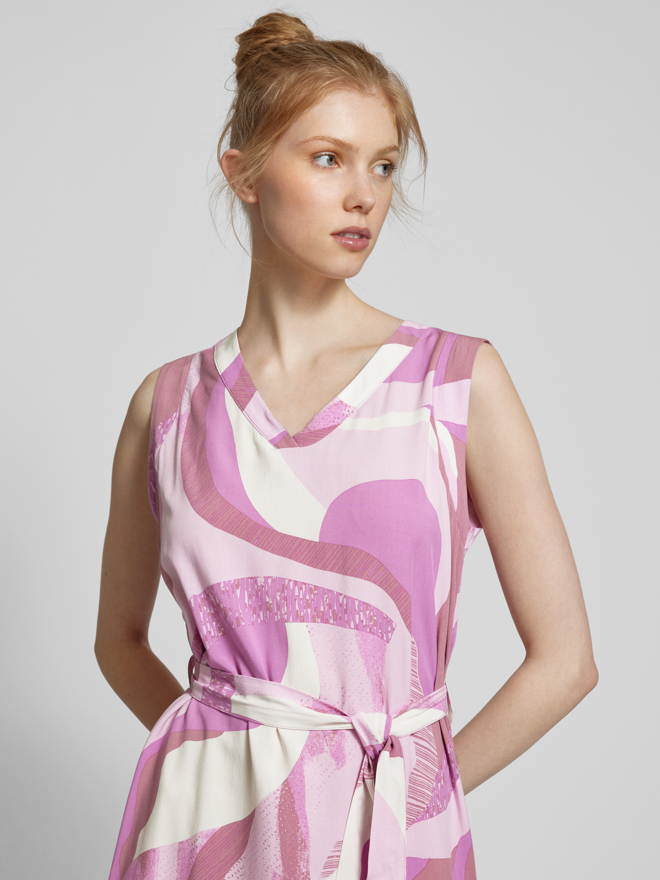 Das knielange Kleid von QS by s.Oliver besteht aus reiner Viskose und bietet mit seinem geraden Schnitt und dem V-Ausschnitt eine angenehm luftige Passform. Der Bindegürtel ermöglicht eine individuelle Anpassung, während das ärmellose Design besonders an warmen Tagen Komfort verspricht.
