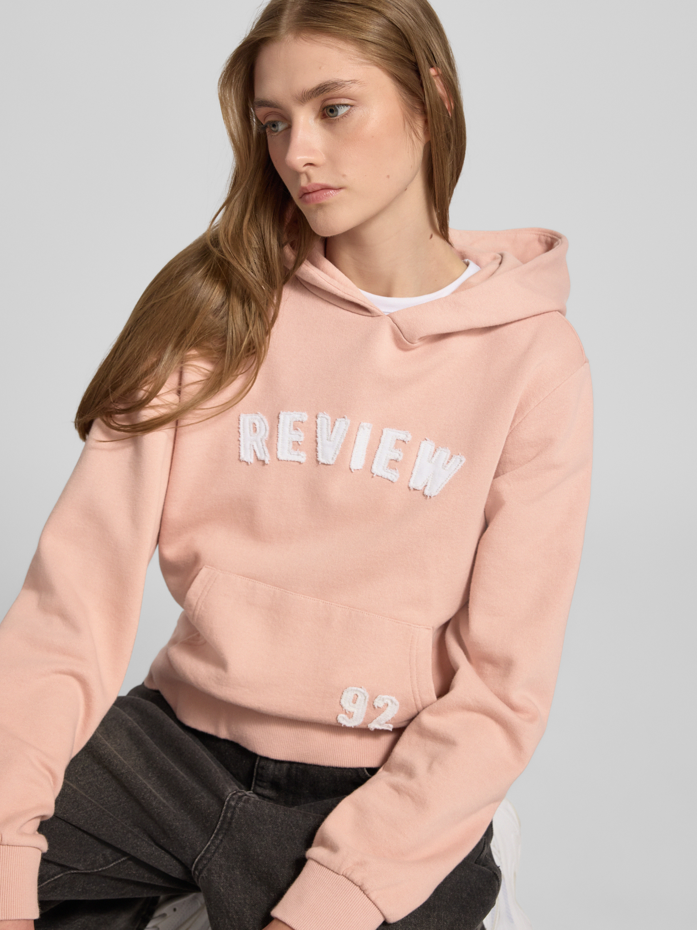 Der Damen Hoodie von Review aus reiner Baumwolle überzeugt durch seinen lockeren Schnitt, der Bewegungsfreiheit und Komfort vereint. Mit einer praktischen Kapuze und einer geräumigen Känguru-Tasche eignet er sich ideal für entspannte Tage. Ein dezentes Label-Detail rundet das lässige Design ab.